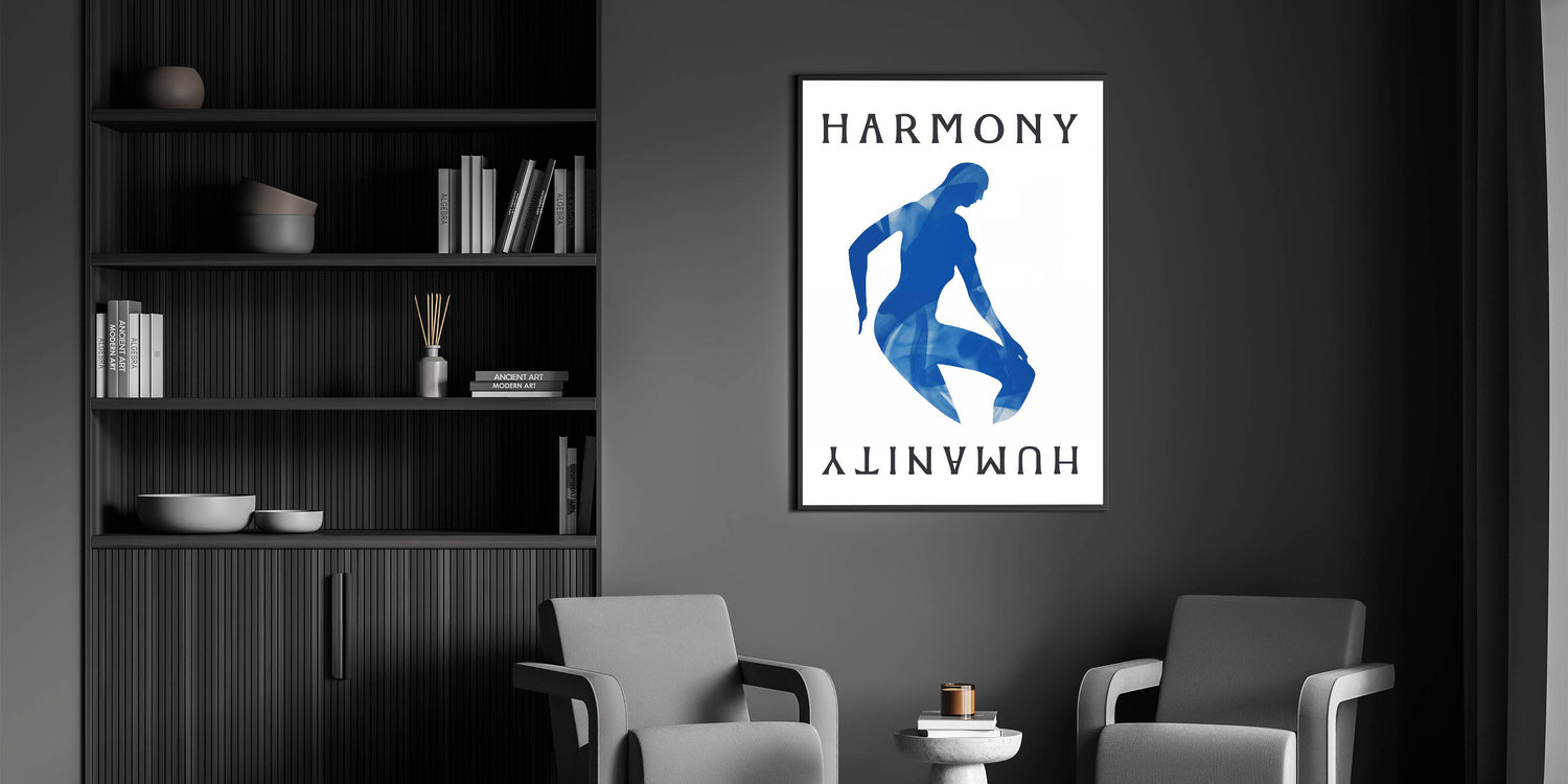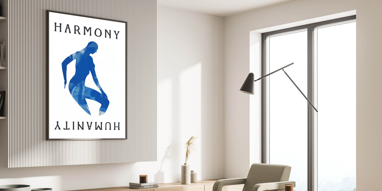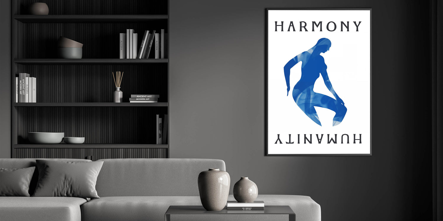 Celebrate the balance between humanity and harmony with this striking minimalist wall art. Featuring a bold blue silhouette accompanied by the words "Harmony" and "Humanity," this piece conveys a powerful message of connection and balance. The clean lines of the silhouette, combined with the crisp typography, make this artwork an ideal choice for modern interiors seeking both aesthetic appeal and meaning.