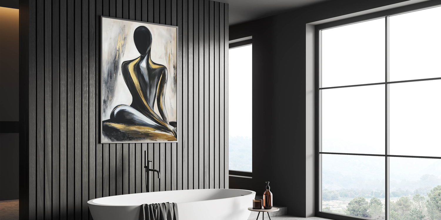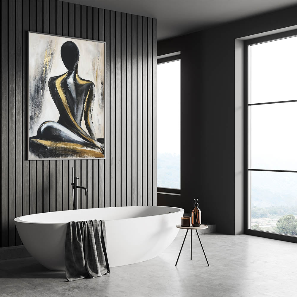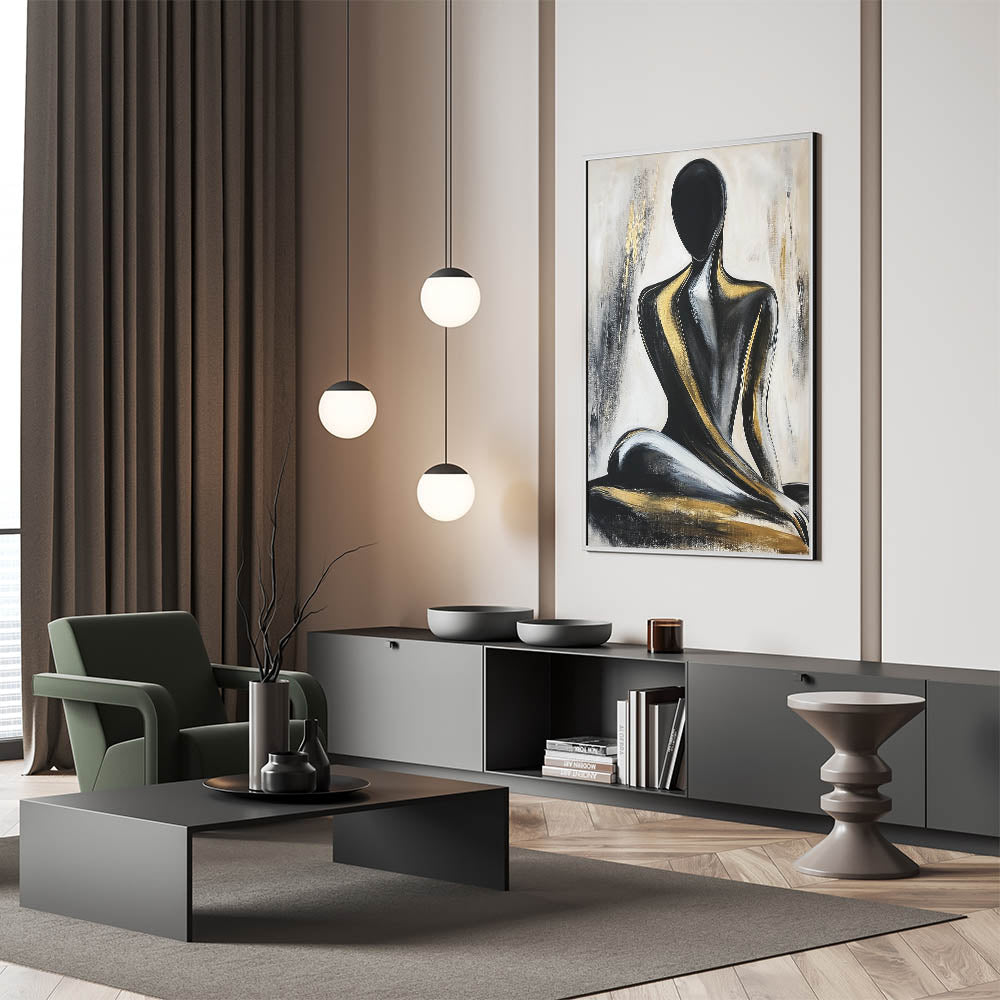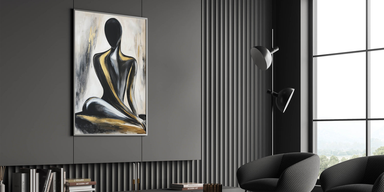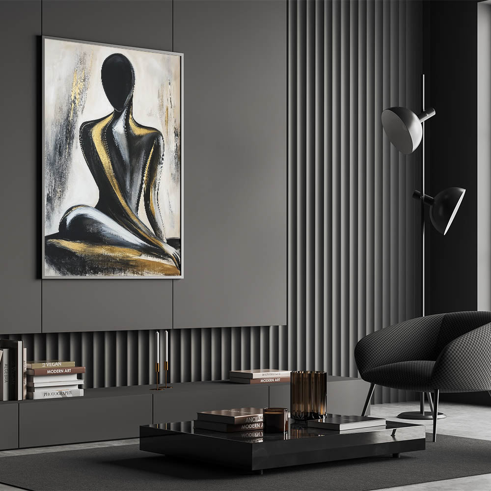 Add a touch of luxury to your space with this Modern Abstract Figurative Art, featuring a seated human silhouette in striking black and gold tones. This artwork combines bold contrasts with elegant brushstrokes, creating a captivating centerpiece for contemporary interiors. The smooth, flowing lines and radiant gold accents highlight the essence of artistic human figure patterns, making this piece both dynamic and sophisticated.