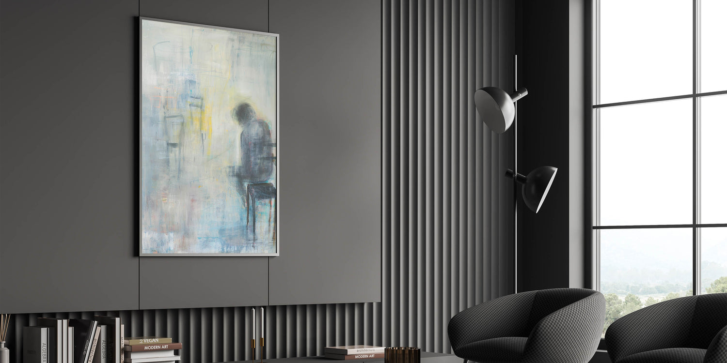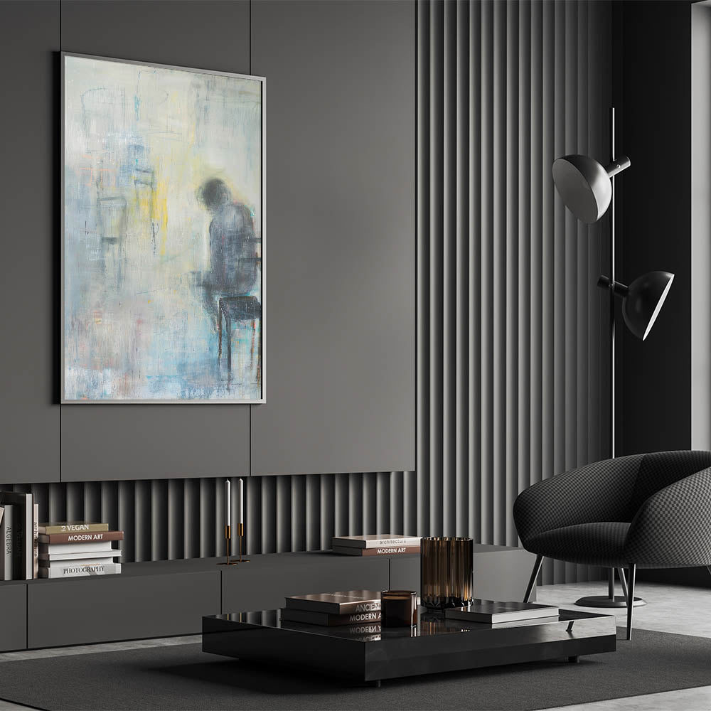 Add a touch of quiet introspection to your space with this Modern Abstract Figurative Wall Art, featuring a minimalist depiction of solitude and reflection. With soft pastel hues of pale blue, light gray, and gentle yellow, this artwork brings a calming yet evocative presence to any room.