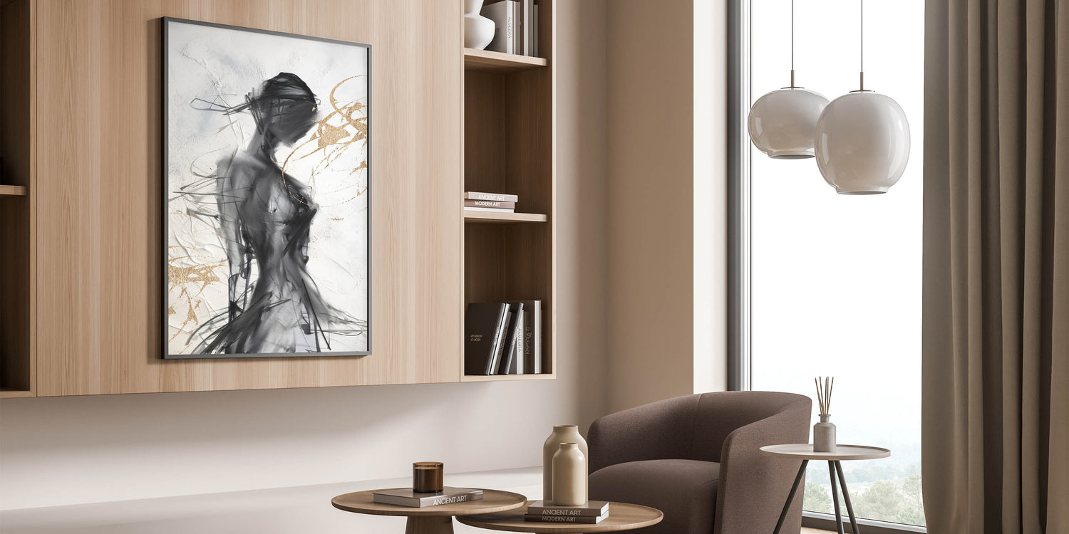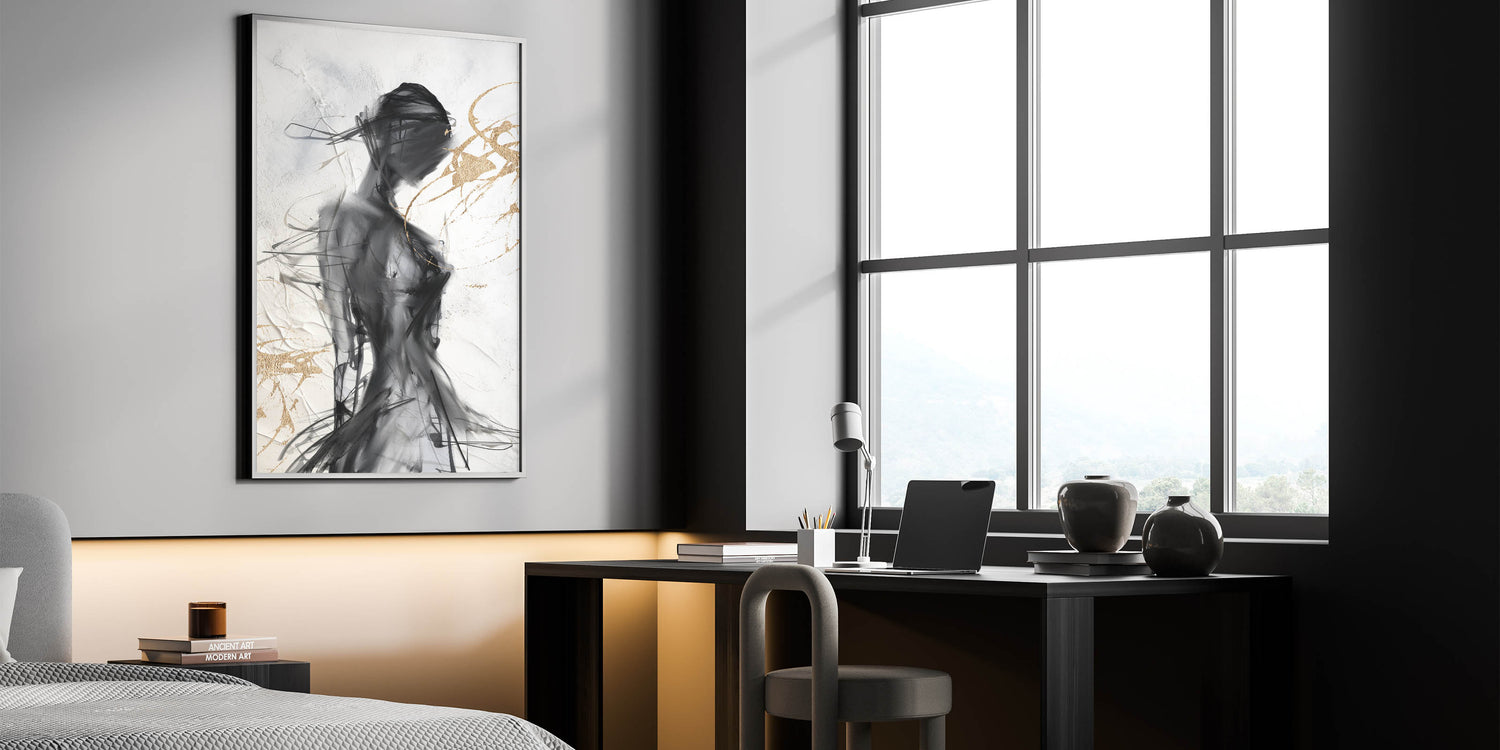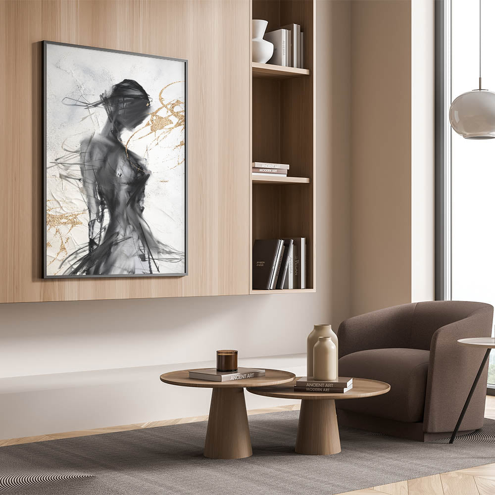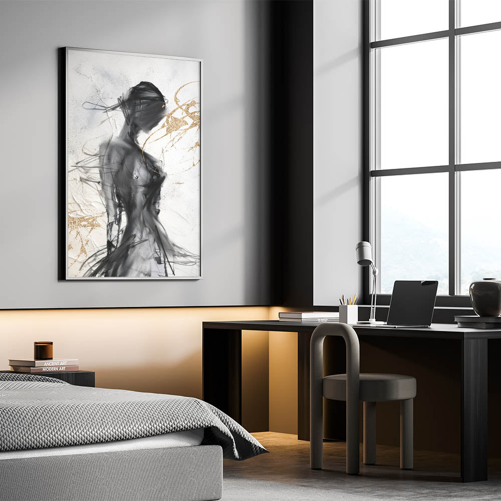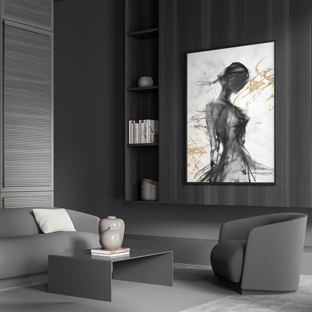 Add a touch of elegance and intrigue to your space with this modern abstract figure art, beautifully accented with gold. The artwork features a dynamic monochrome figure, captured in fluid lines and strokes, which exudes both movement and emotion. The addition of gold accents enhances the overall composition, adding a luxurious element to the piece. Perfect for contemporary interiors, this artwork serves as a bold statement piece that draws the eye and invites conversation.