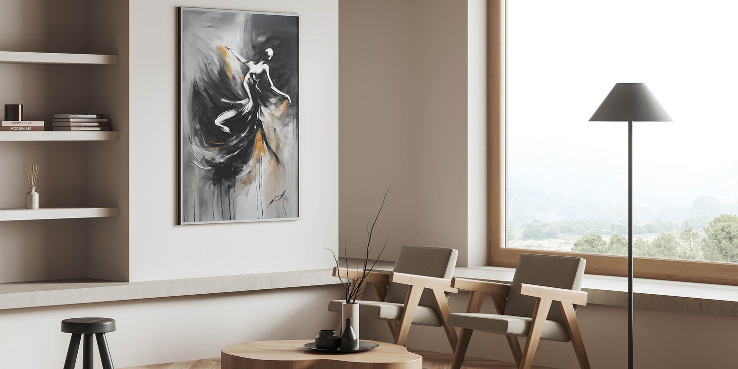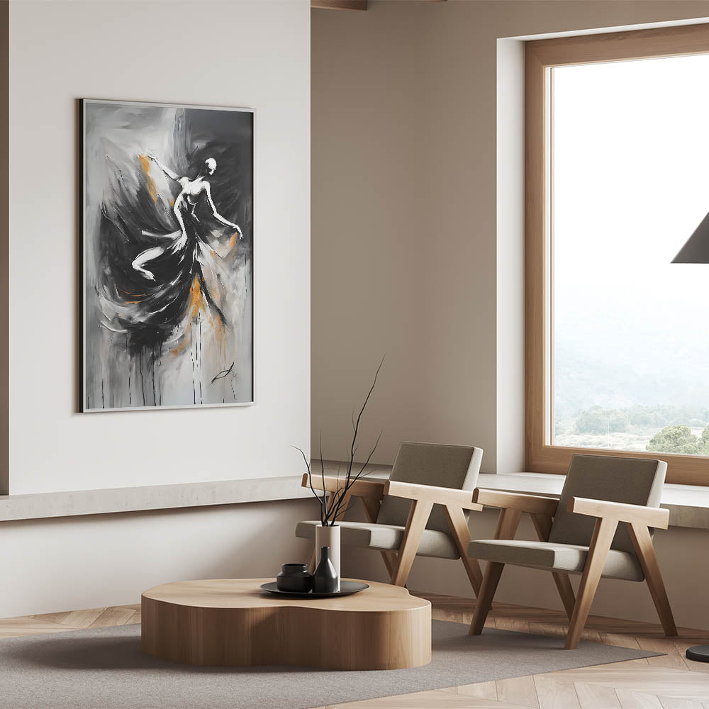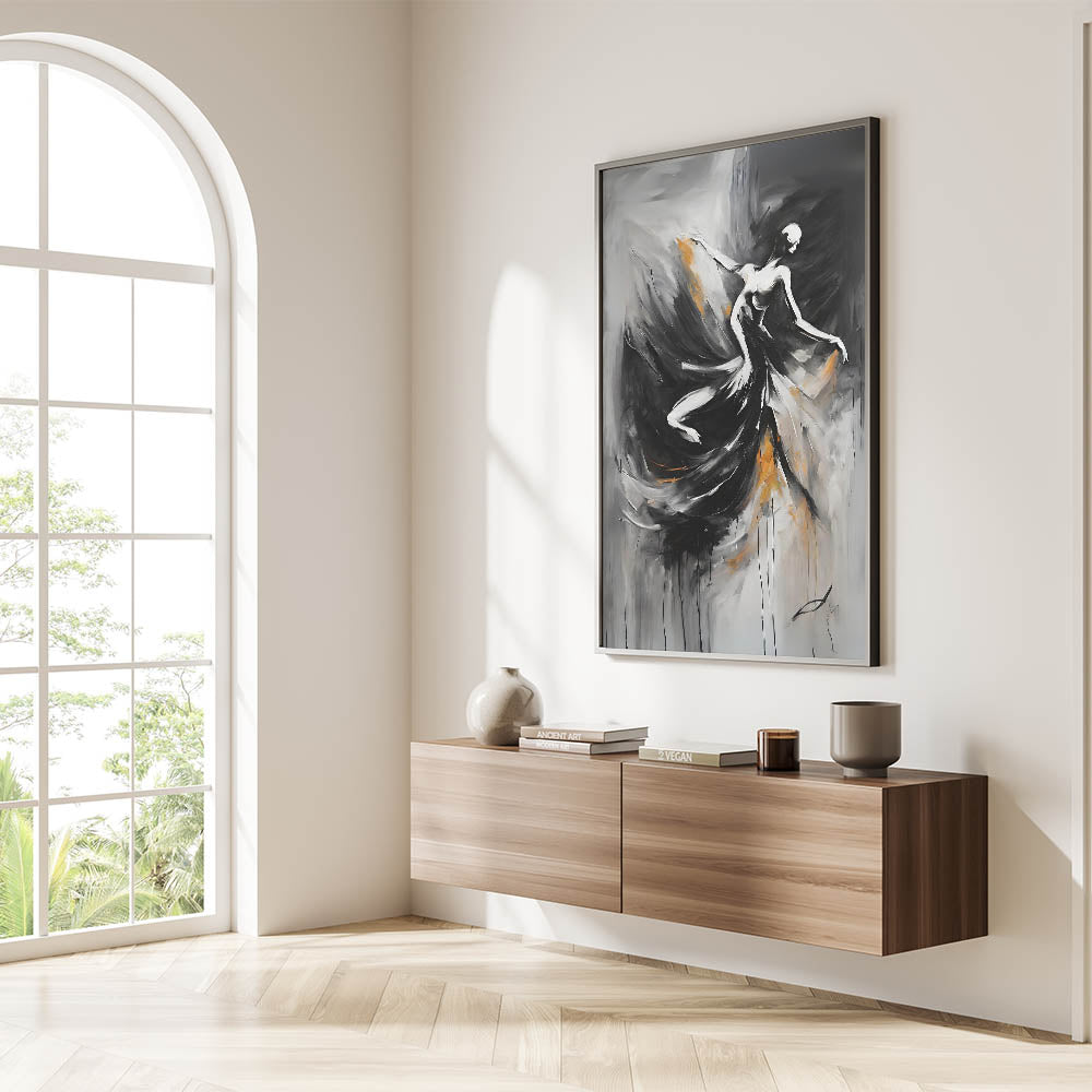 This captivating piece of modern figurative abstract art showcases the graceful movement of a human figure, captured in a dynamic dance of black and gold hues. The abstract style, with its fluid lines and bold contrasts, evokes a sense of elegance and motion, making it a stunning addition to any contemporary space. The artist has masterfully blended shades of black, white, and gold to create a striking visual experience that draws the viewer in, inviting them to explore the depth and emotion within the piece.