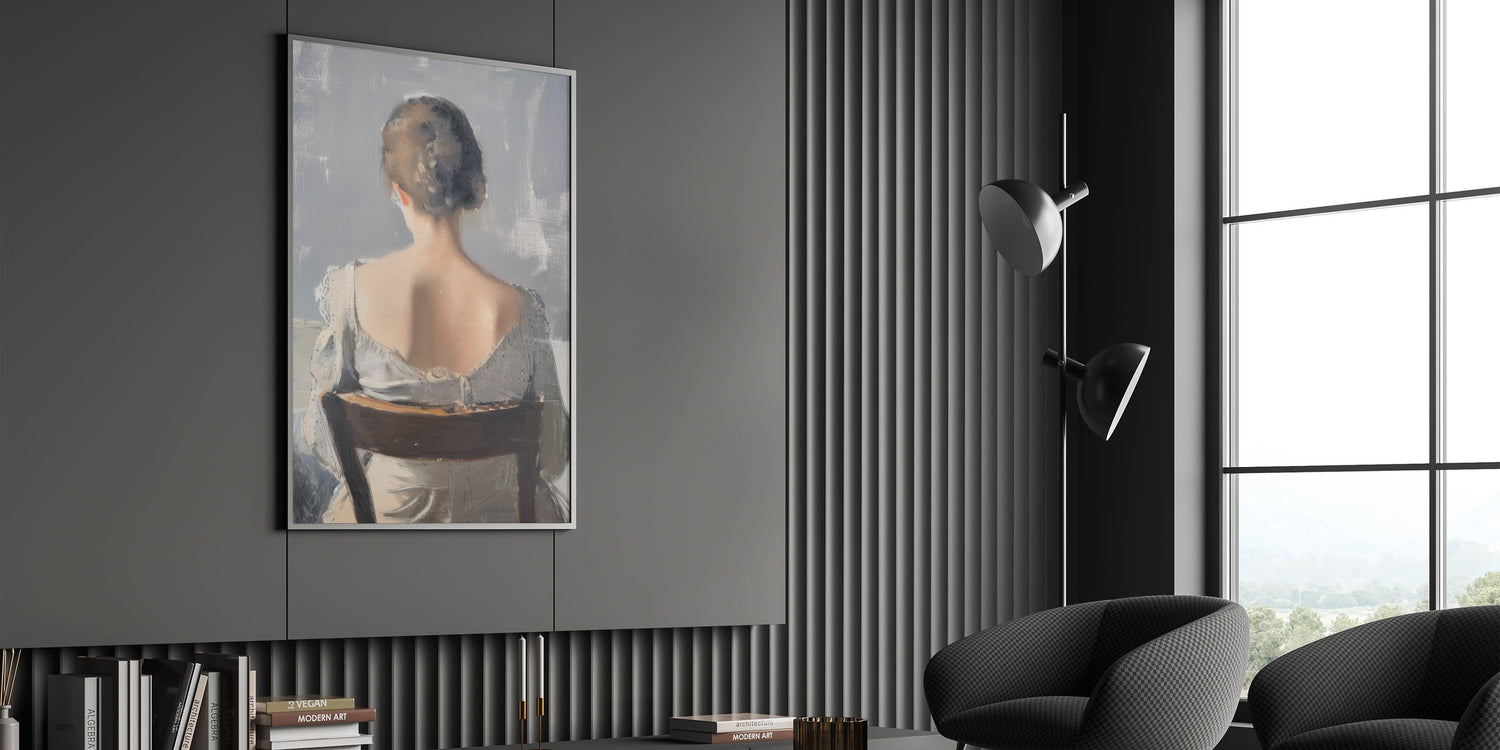 Elevate your decor with this modern figurative abstract piece that celebrates simplicity and grace. Featuring the back view of a woman seated with poised elegance, the muted palette and soft brushstrokes evoke a serene and contemplative atmosphere. Perfect for minimalist and contemporary spaces, this artwork brings timeless beauty to your walls.