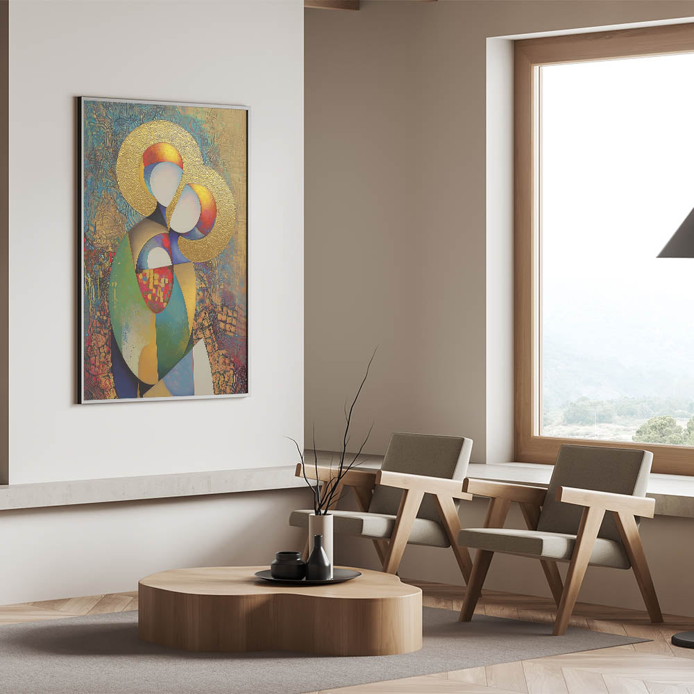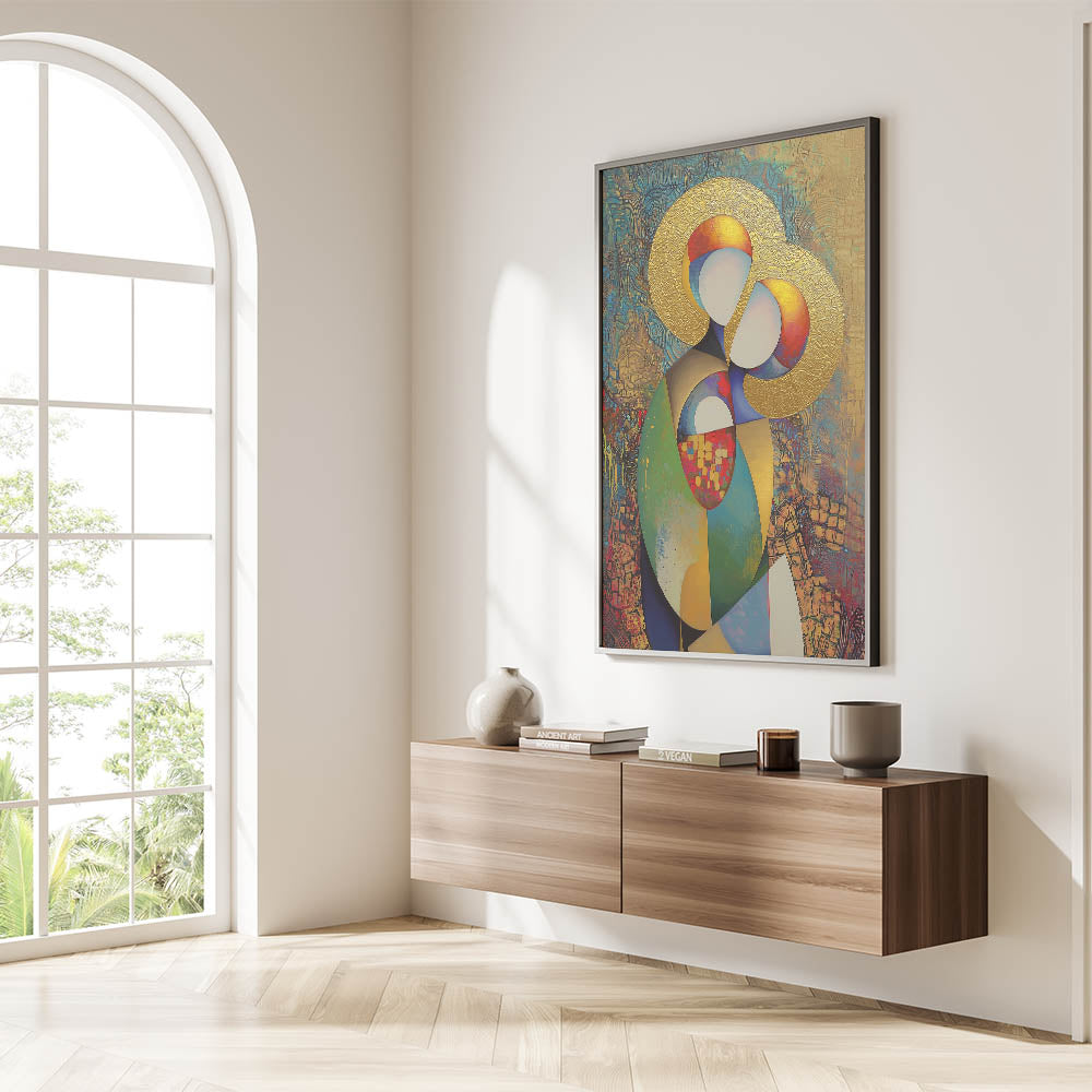 Celebrate the beauty of connection with this Modern Figurative Canvas Art, featuring a vibrant and abstract depiction of familial unity. The artwork blends geometric forms and radiant golden halos with a colorful palette of blue, red, and green, creating a composition that is both symbolic and visually stunning. This Abstract Figurative Wall Decor serves as a powerful representation of love and togetherness, making it a meaningful addition to any space.