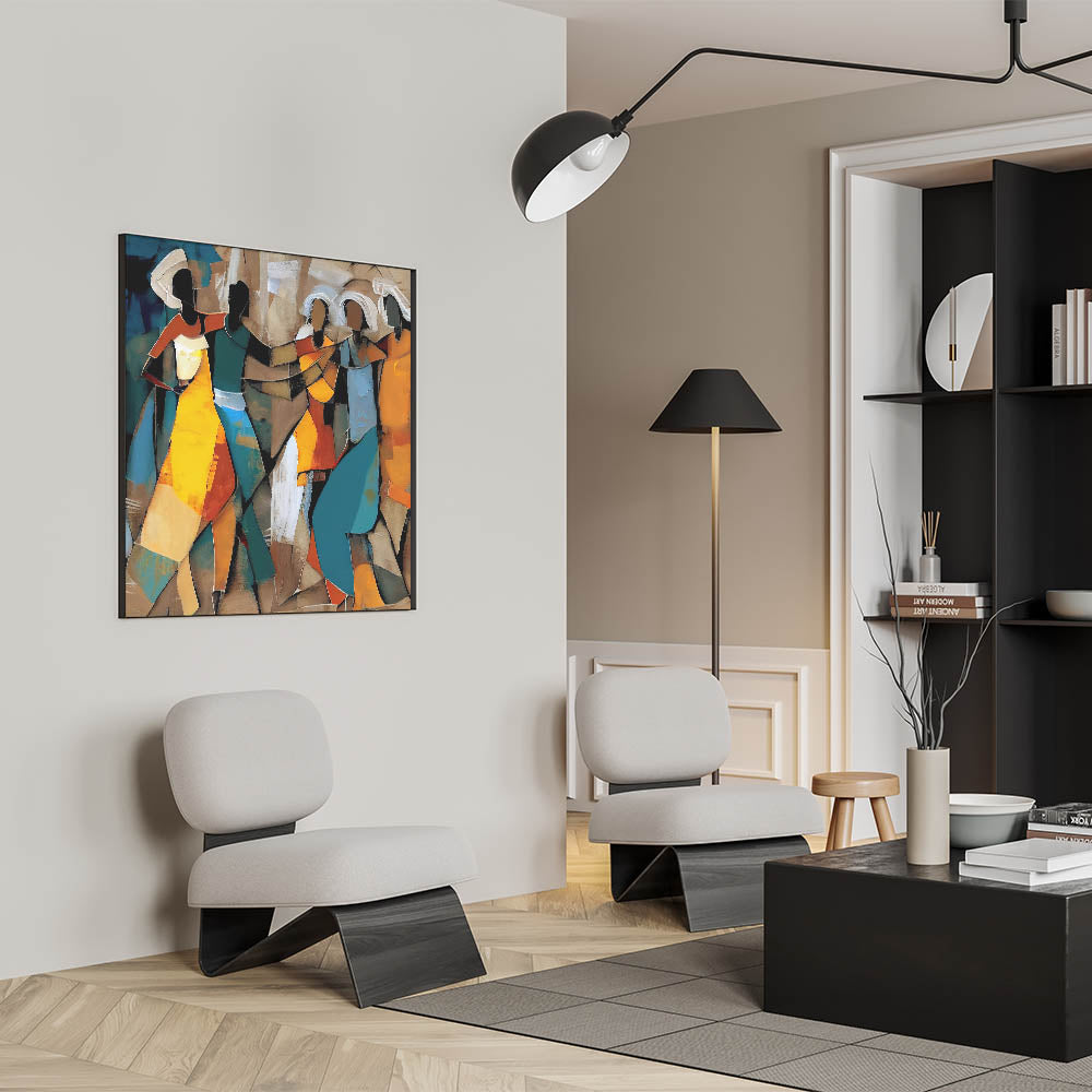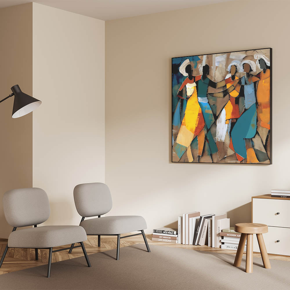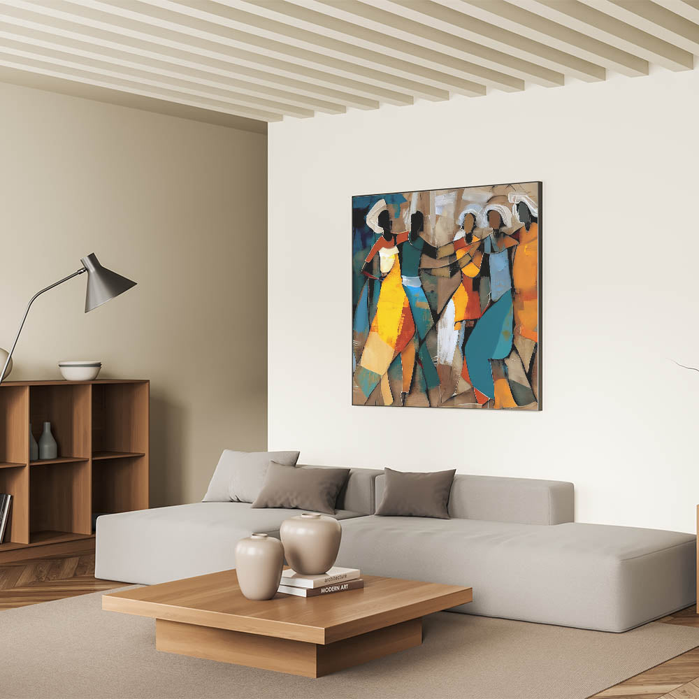 This modern figurative wall art brings to life a dynamic portrayal of human figures in movement, evoking a sense of unity and rhythm. The composition is a blend of vibrant yellows, teals, and earthy tones that capture both warmth and depth, offering a fresh take on contemporary figurative abstraction. The interplay of colors and shapes highlights the harmony among the figures, creating an artwork that is as thought-provoking as it is visually captivating.