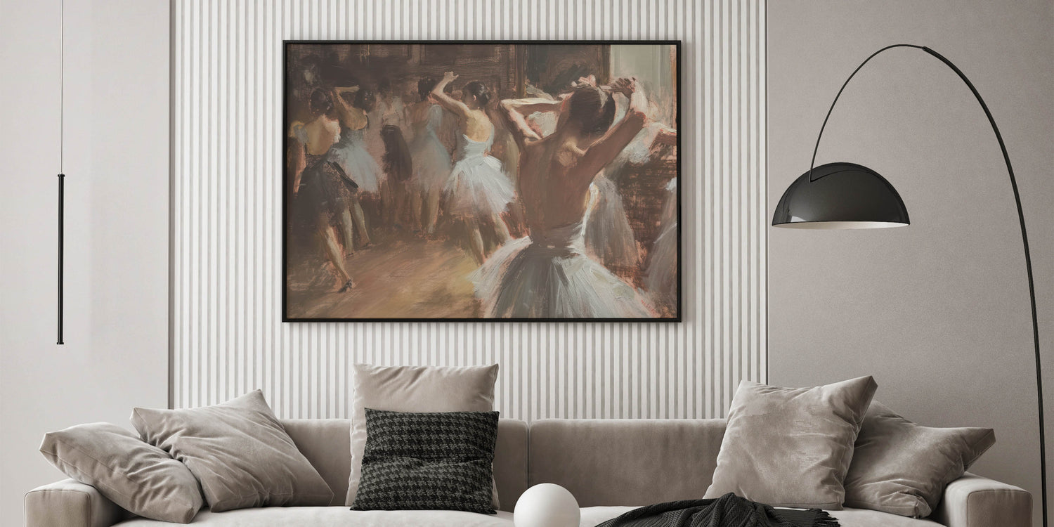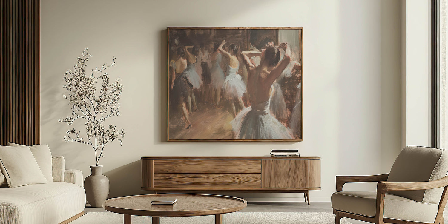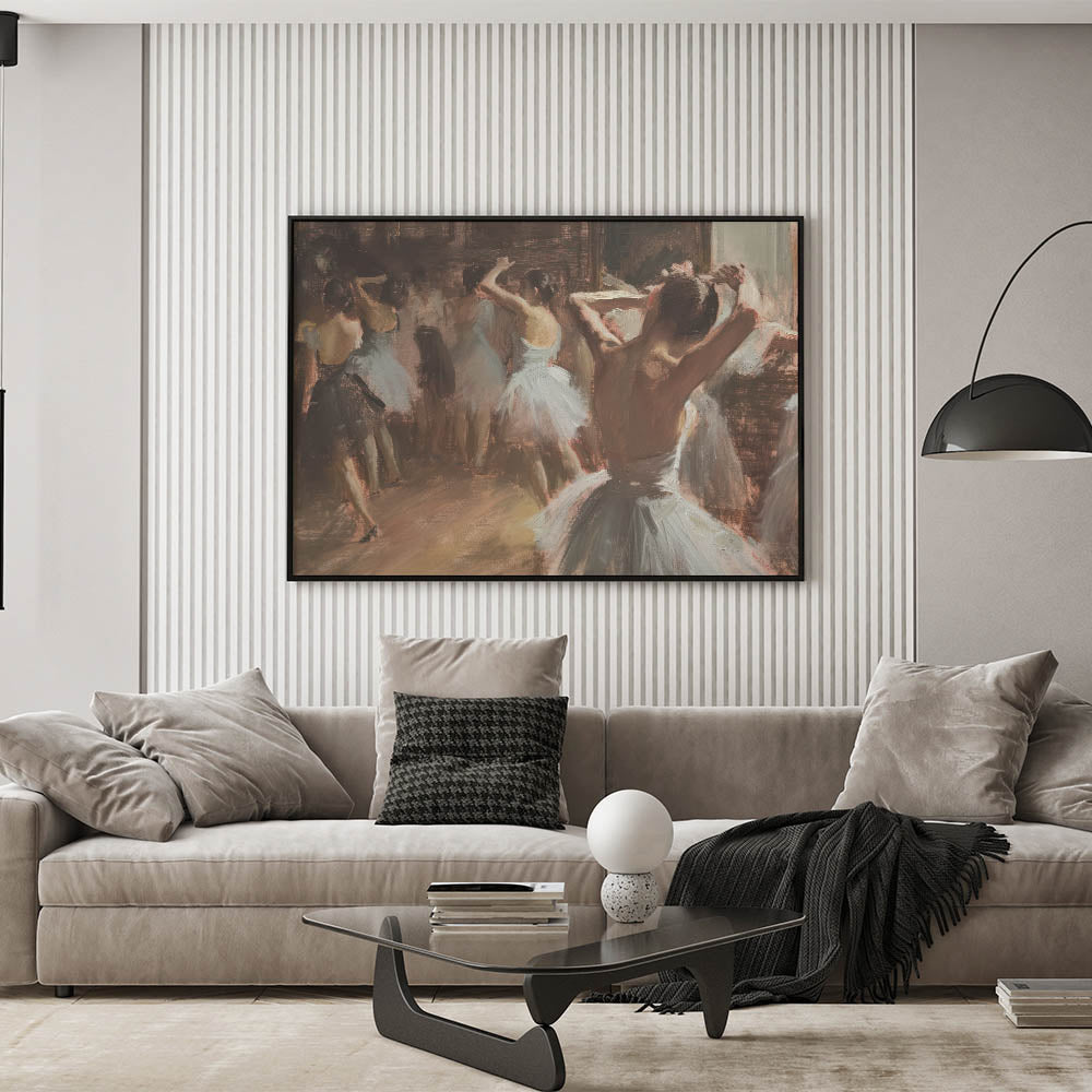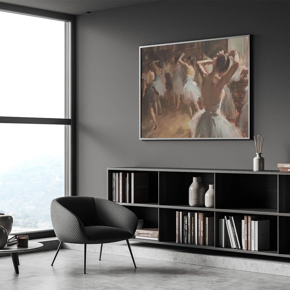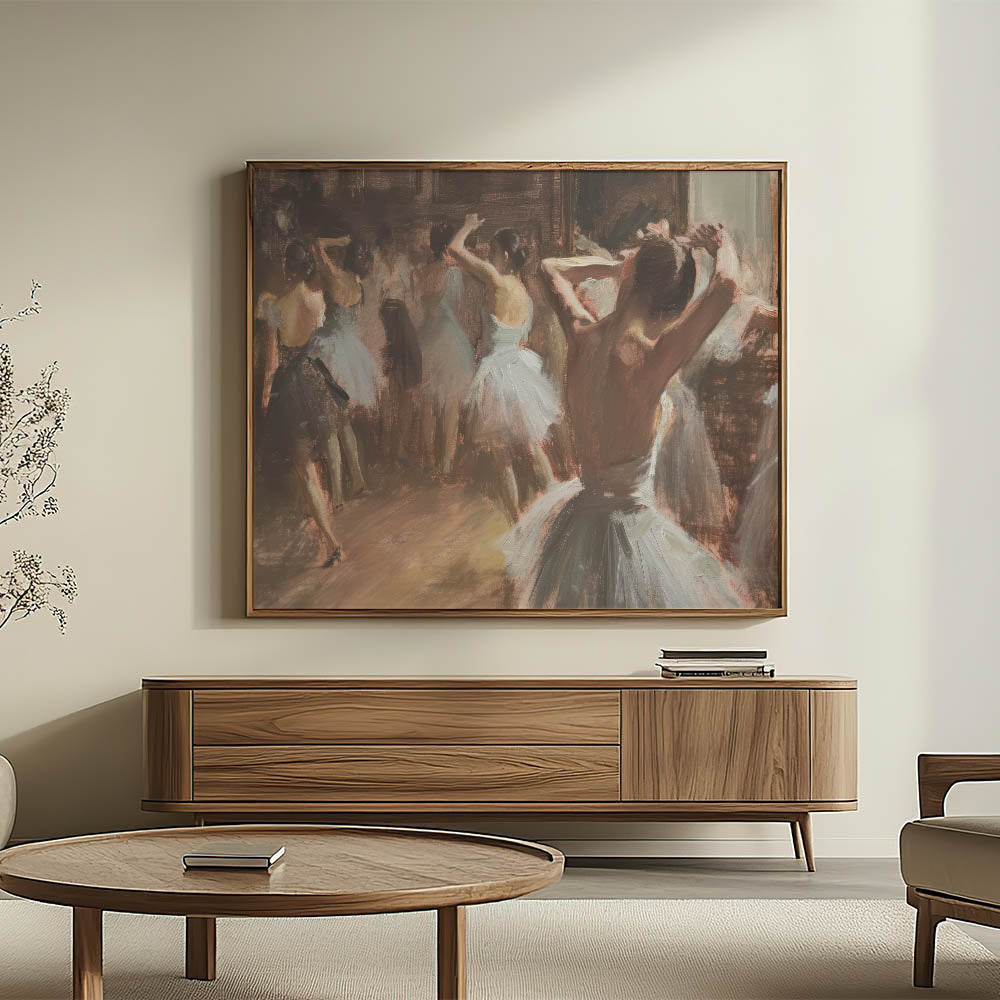 Bring the elegance of movement and grace into your home with this stunning abstract figurative artwork. Capturing a group of ballerinas mid-rehearsal, this painting conveys the fluidity and beauty of dance through soft brushstrokes and a harmonious blend of earthy tones. The interplay of light and shadow creates a captivating ambiance, making it an ideal piece for art lovers and dance enthusiasts alike.