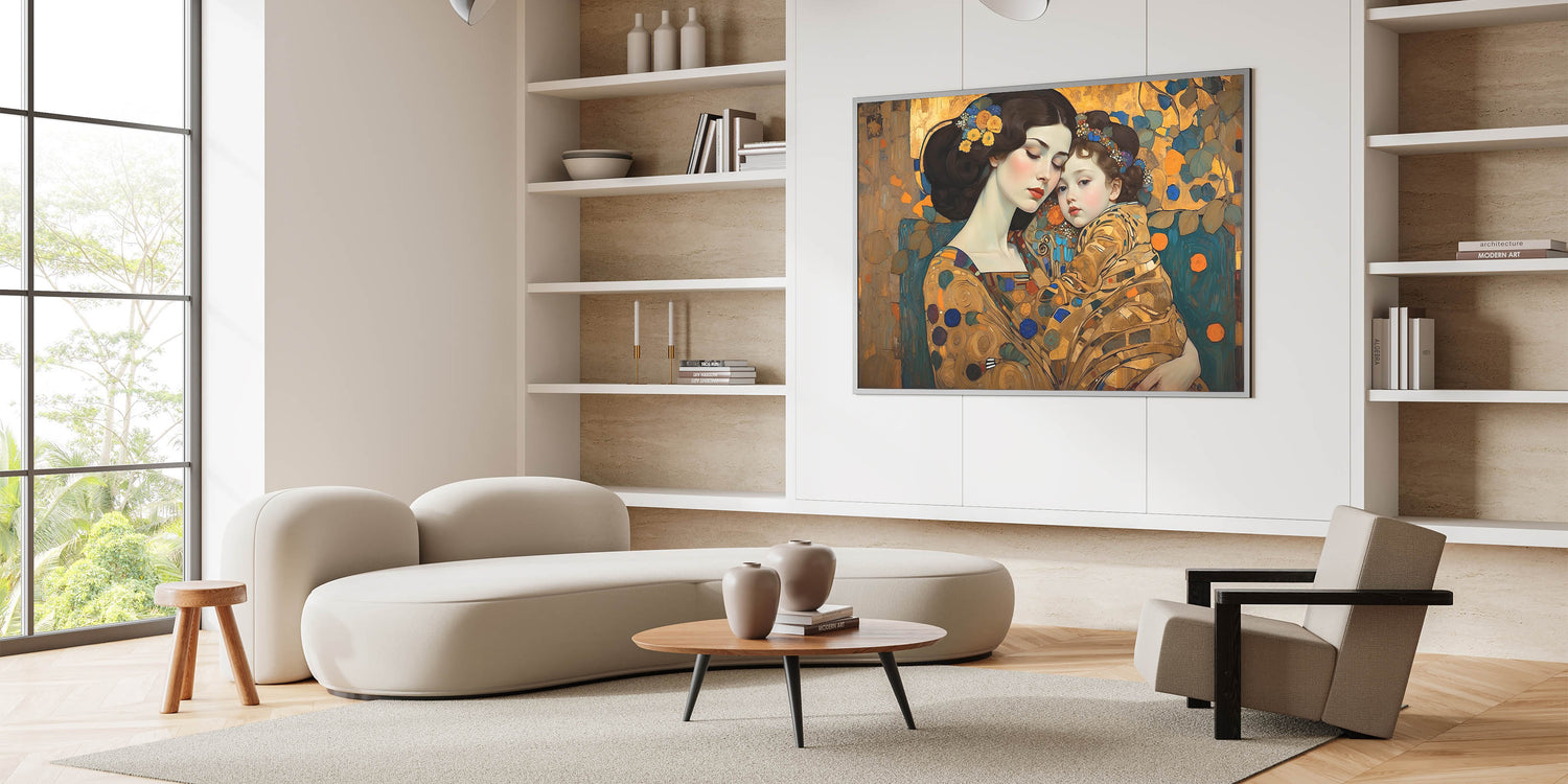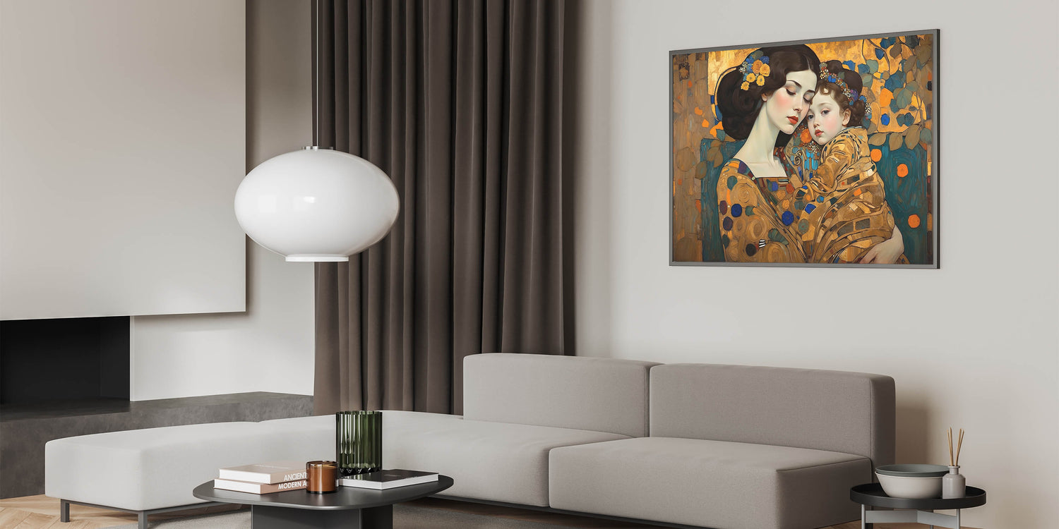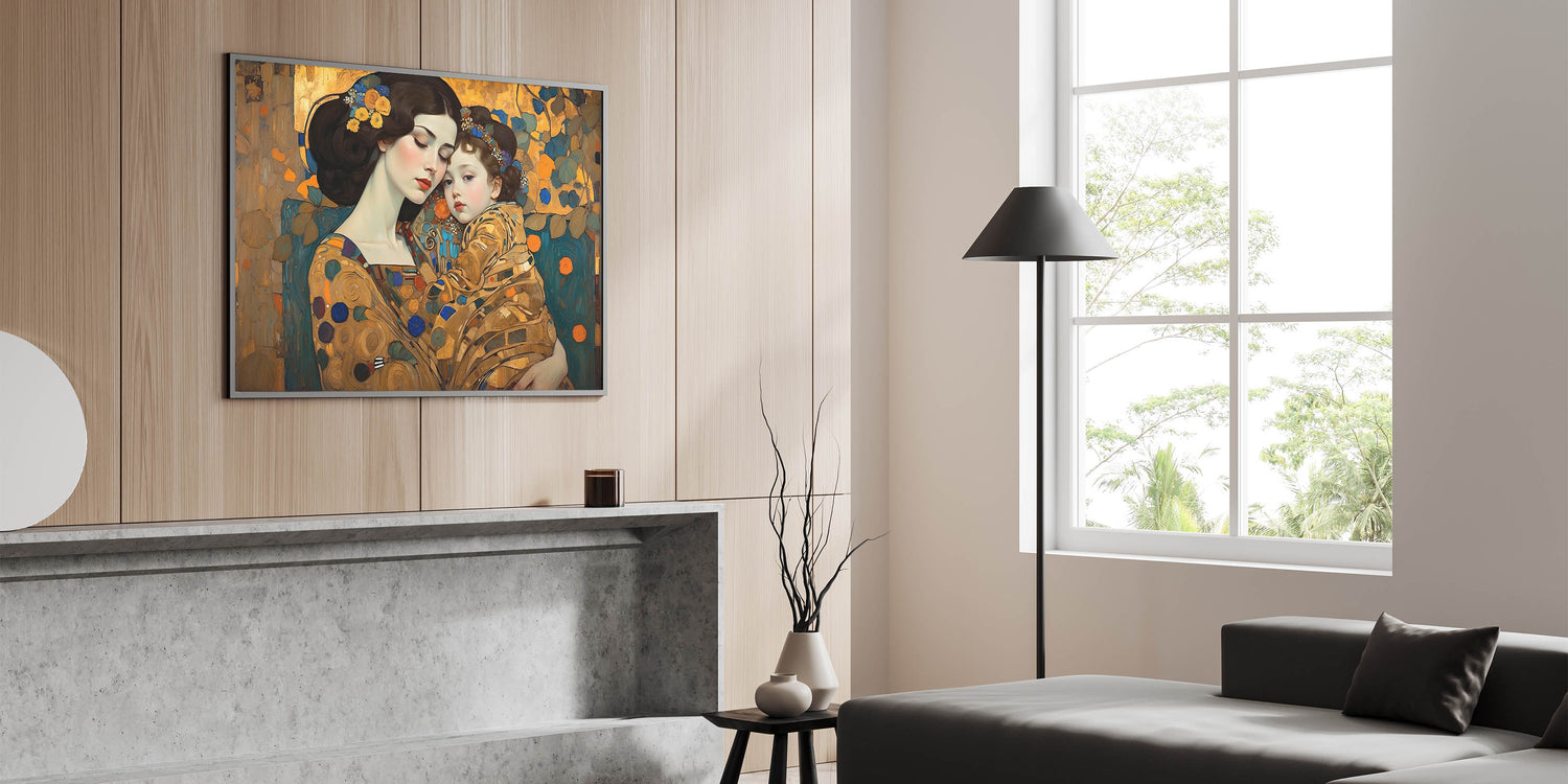 Ideal for those who appreciate fine art with an emotional connection, this mother and child portrait serves as a heartwarming addition to any room. Its warm tones and intricate patterns make it an inviting centerpiece, celebrating the beauty of family and love.