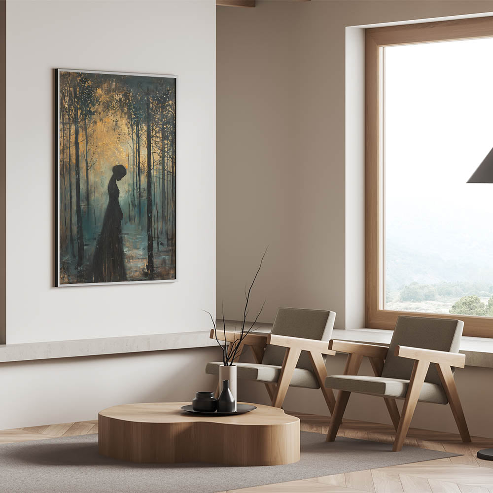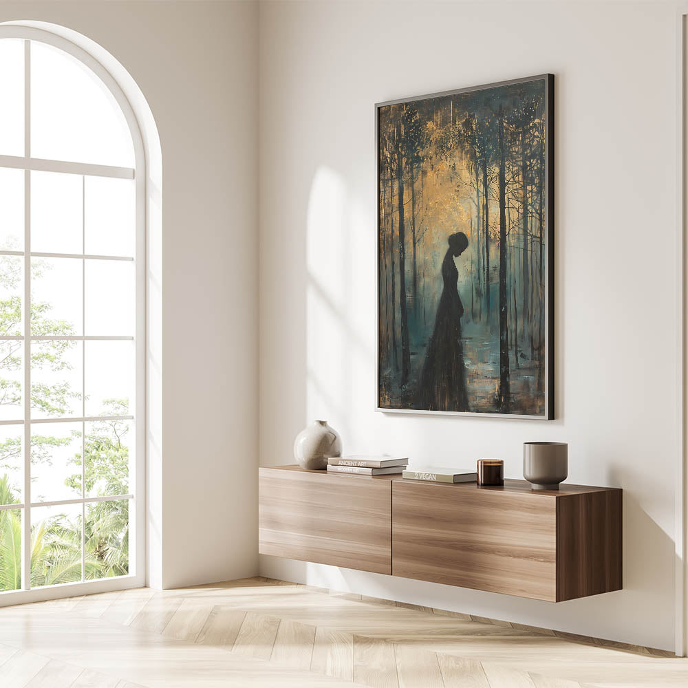 Step into a world of mystery with this enchanting abstract art piece featuring a silhouette of a woman in a dark, misty forest. The muted green and gold hues, along with subtle brushstrokes, create an atmosphere filled with tranquility and solitude. This artwork beautifully captures the essence of introspection and natural beauty, making it an ideal piece for those who appreciate deep, contemplative art.
