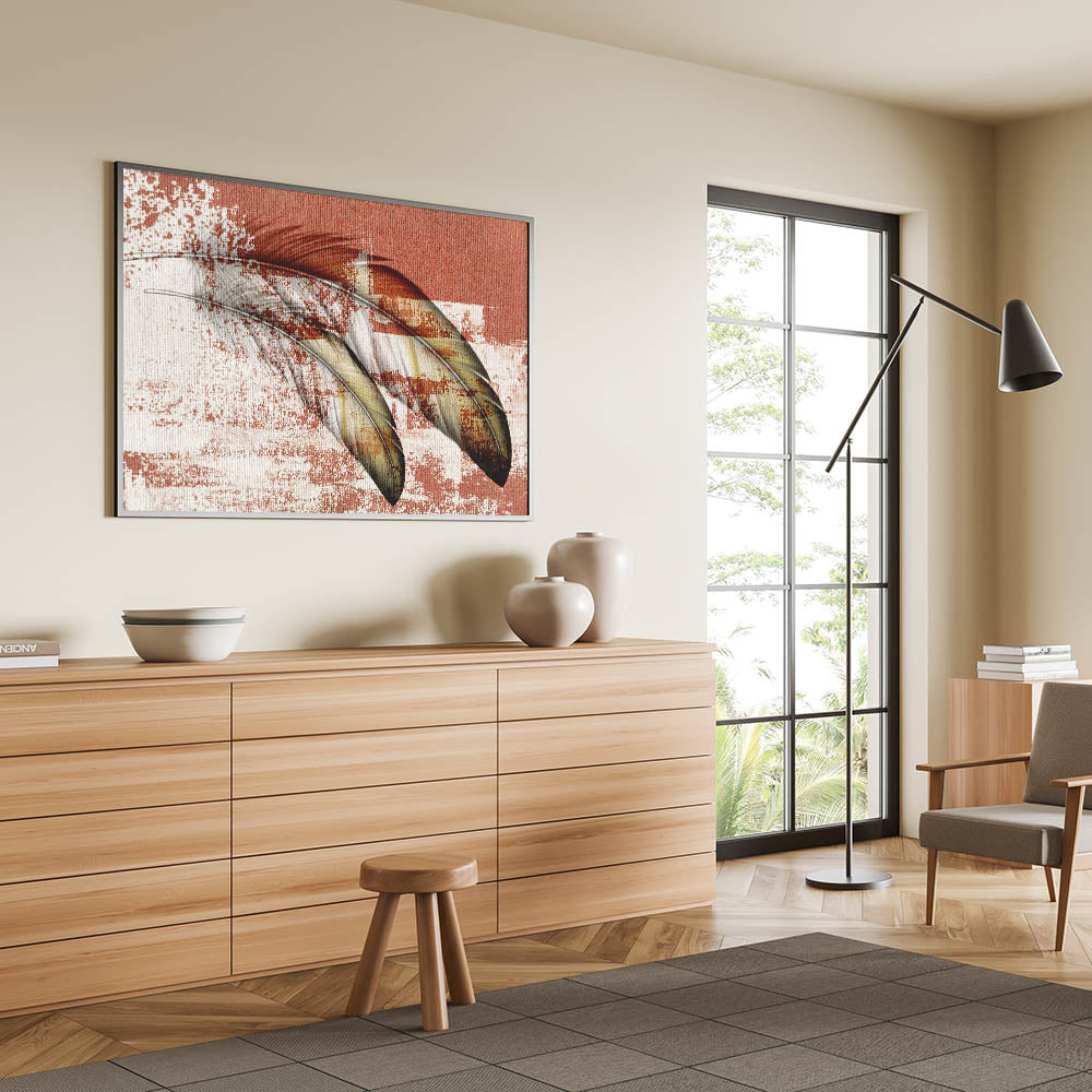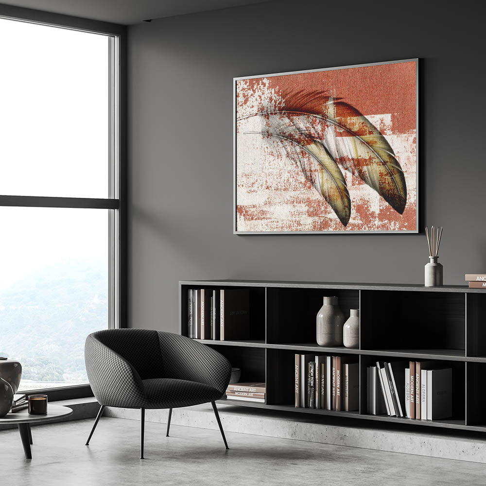 Add a touch of rustic charm to your space with this stunning feather abstract artwork. Featuring two intricately detailed feathers in rich earth tones, this piece exudes warmth and elegance. The background’s textured layers in shades of burnt orange and beige perfectly complement the feathers, creating a harmonious blend that brings a cozy yet sophisticated ambiance to any room.