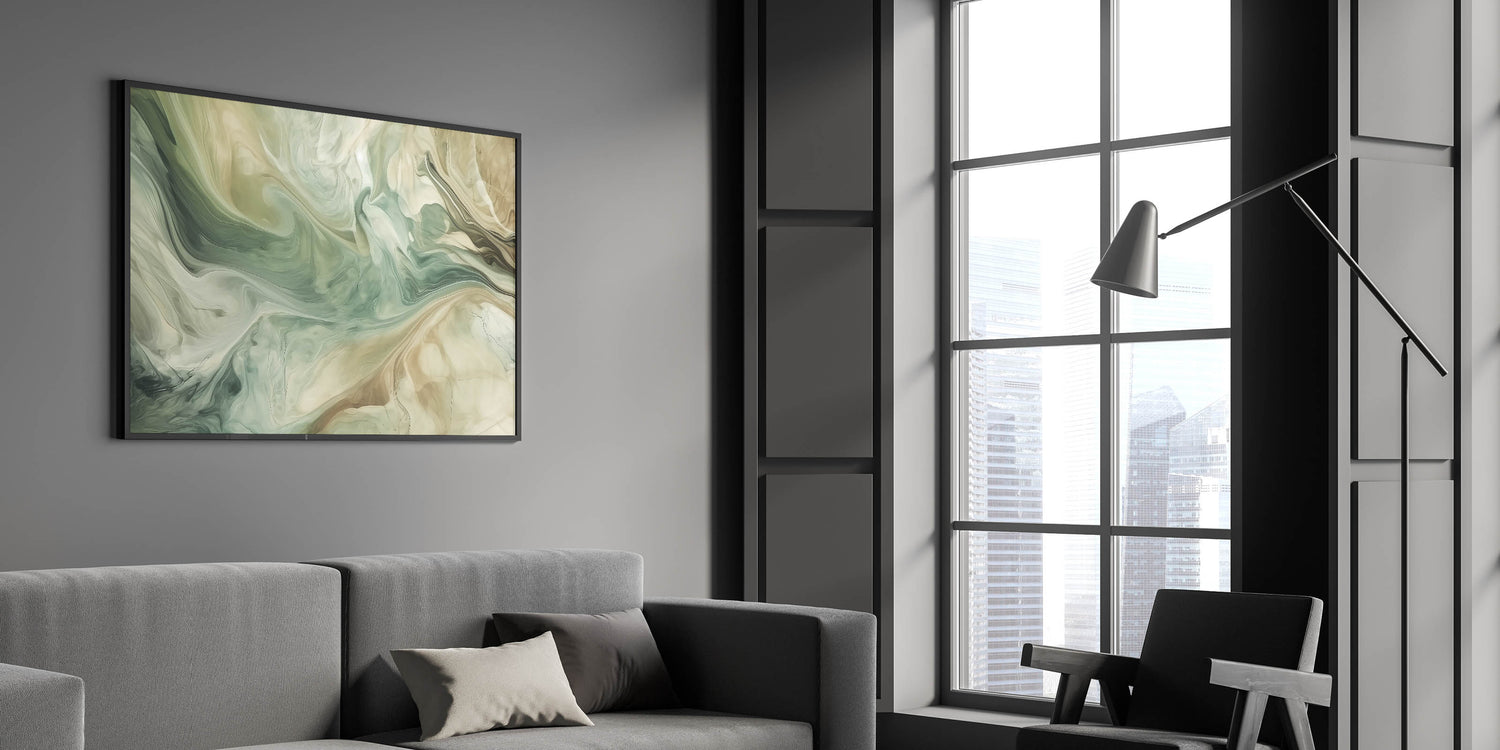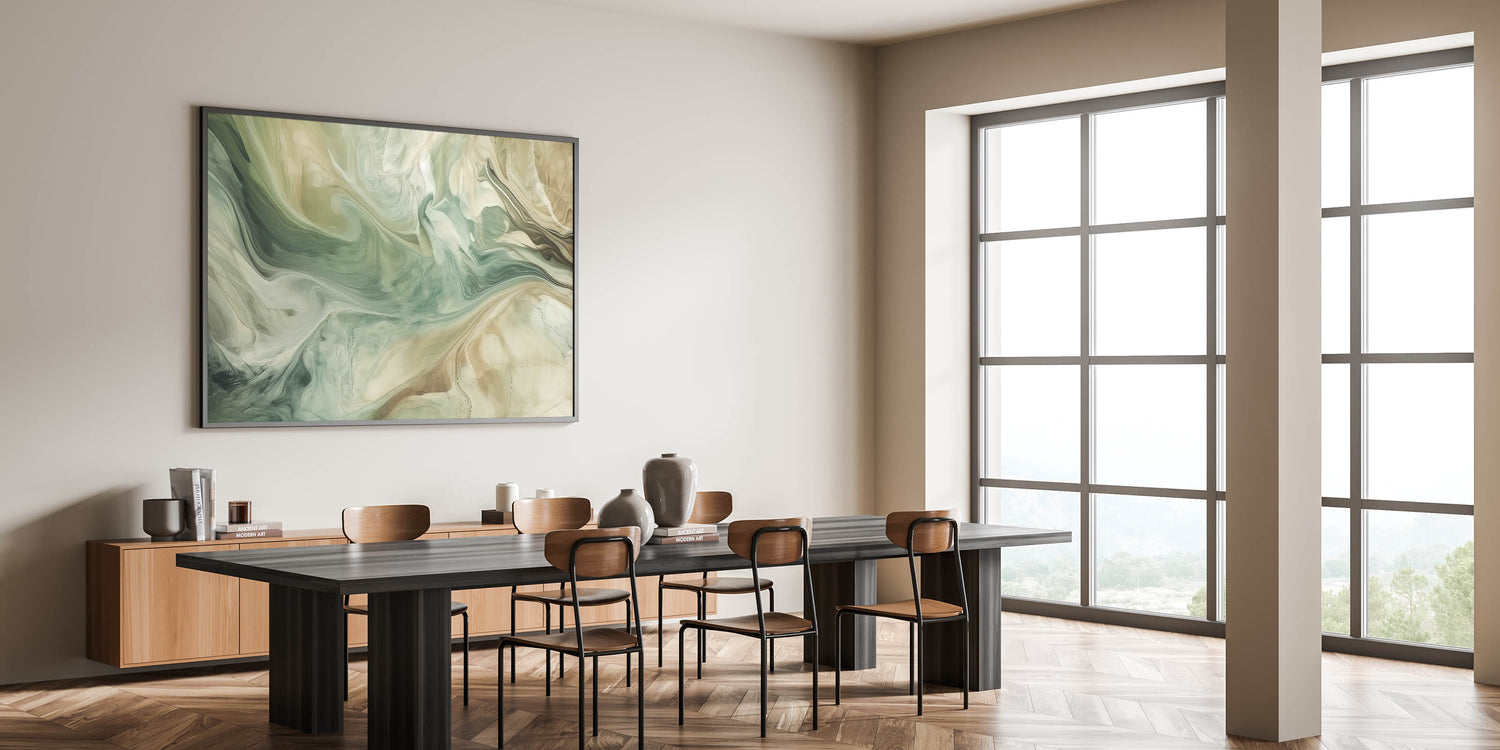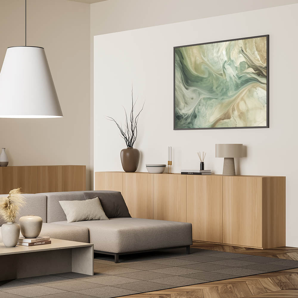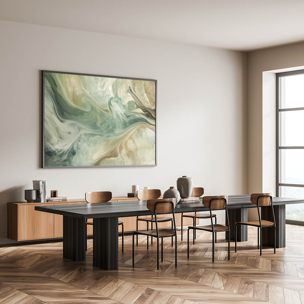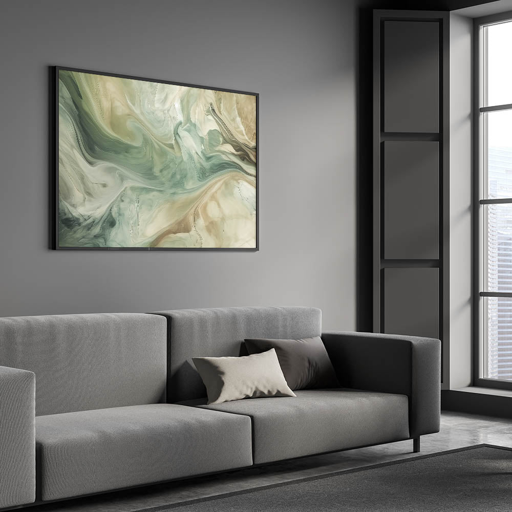 Immerse yourself in the calming flow of Swirling Abstract Line Art. This exquisite piece features fluid patterns in a soothing blend of green, beige, and cream, evoking the feel of a marbled river or swirling natural elements. The gentle curves and organic lines create a tranquil, harmonious aesthetic, making it an ideal choice for adding a touch of serenity to any space.