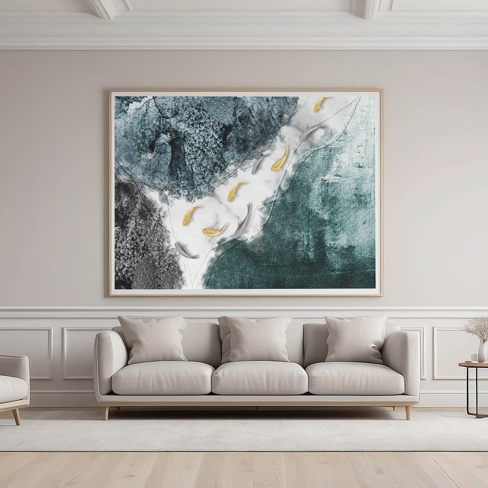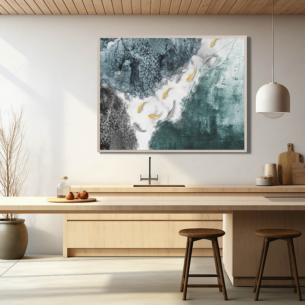 Teal and Gold Koi Fish Abstract | Modern Wall Art with Geometric Lines