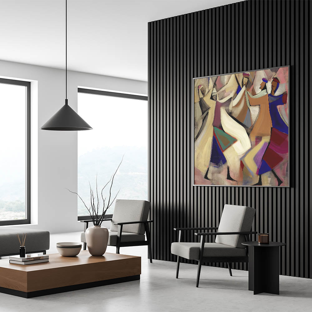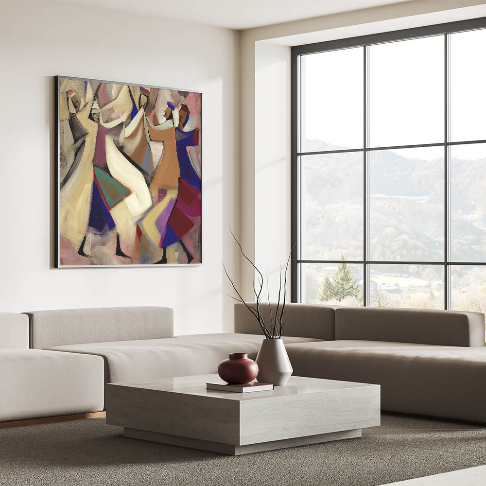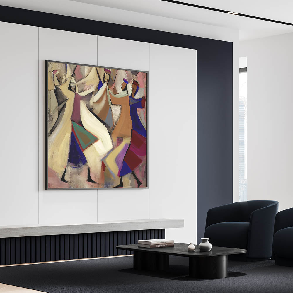 This unique figurative wall art celebrates the beauty of human forms in a harmonious dance of color and movement. Rendered in soft earthy tones with hints of burgundy, cream, and muted blues, this abstract piece conveys a serene yet dynamic rhythm. The flowing shapes and expressive figures capture a sense of unity and celebration, making this artwork a perfect fit for spaces that seek to evoke warmth and connection.