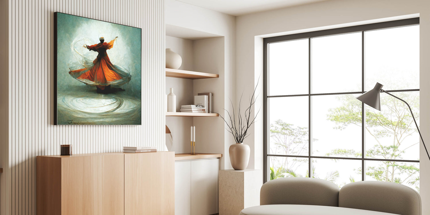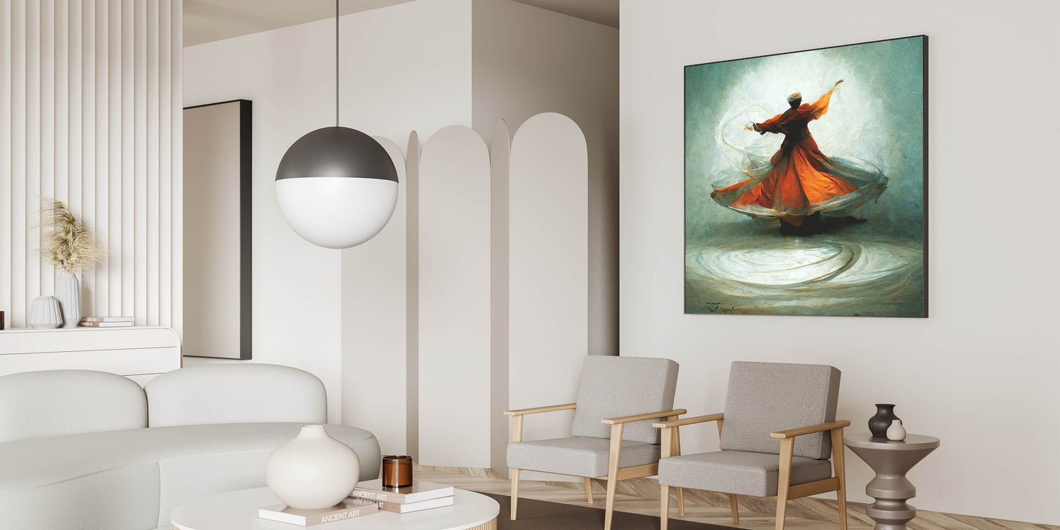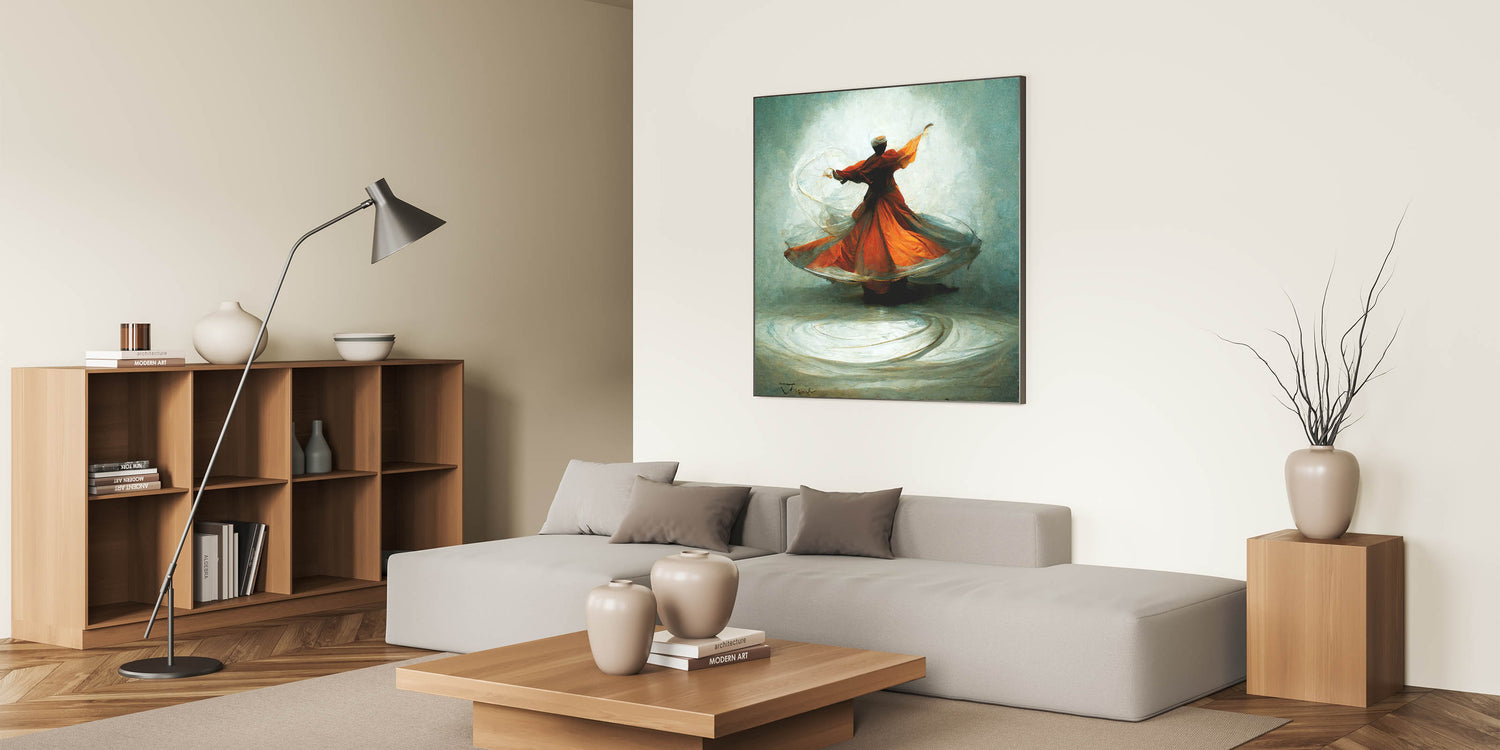 Ideal for art lovers drawn to expressive, movement-filled pieces, this abstract whirling dervish painting brings warmth and grace to any room. Its striking color palette and serene energy make it an inviting focal point, perfect for both modern and traditional settings.