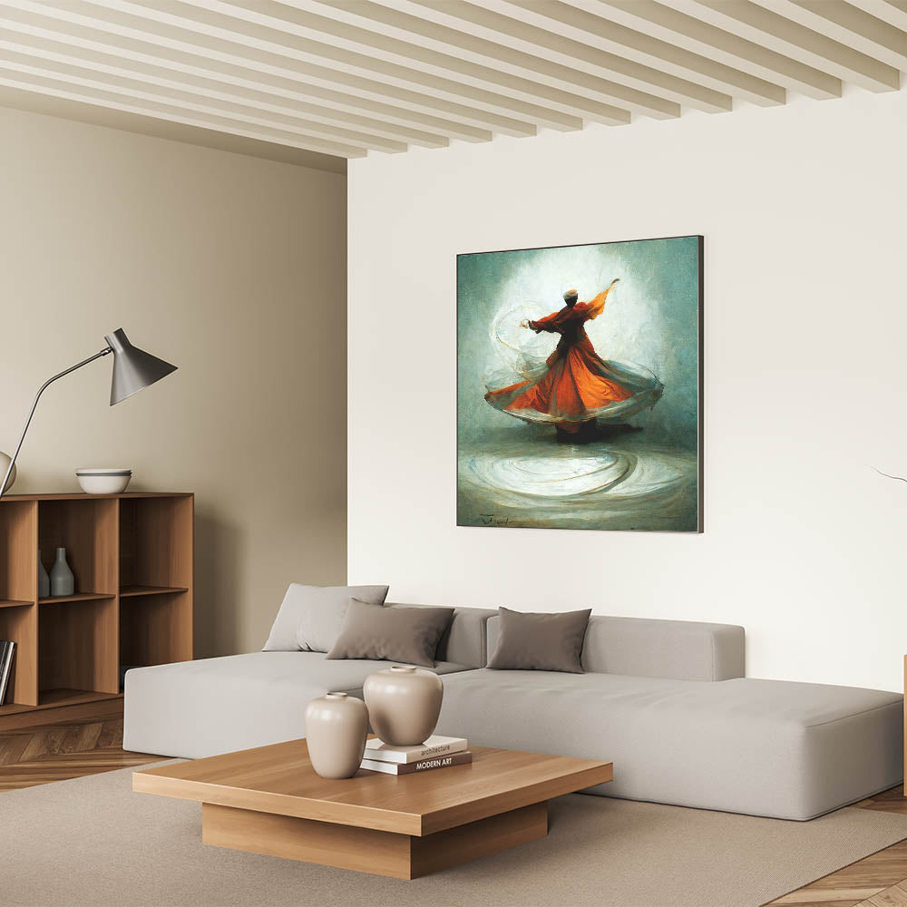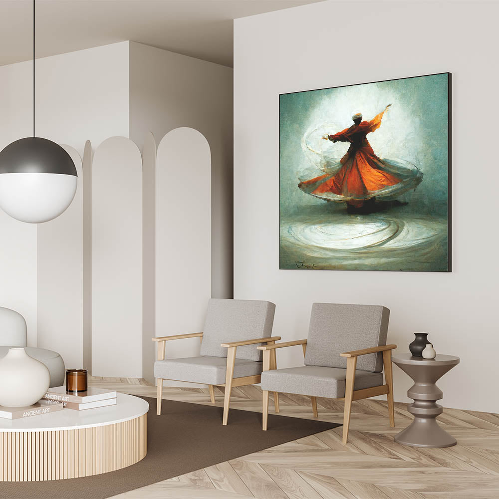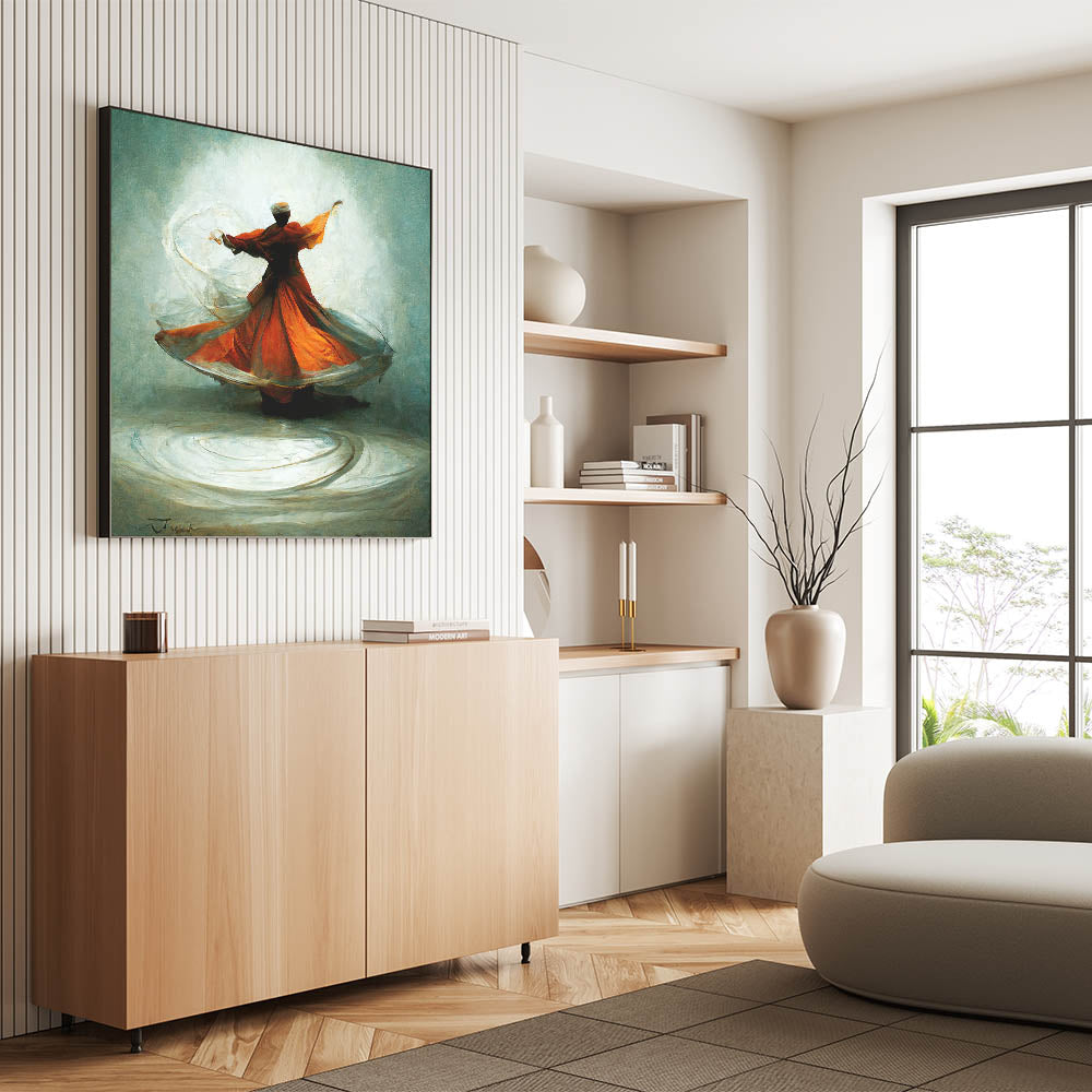 This vibrant abstract artwork captures the mesmerizing motion of a whirling dervish, cloaked in flowing shades of orange and gray. The figure’s dynamic movement, accentuated by delicate brushstrokes, creates a hypnotic and spiritual atmosphere. Set against a soft, neutral background, this piece embodies elegance and tranquility, making it a timeless addition to any space.