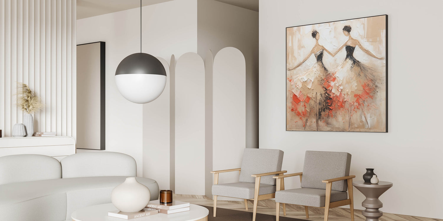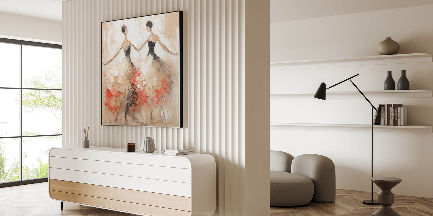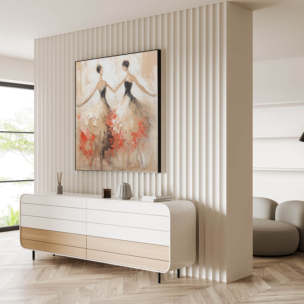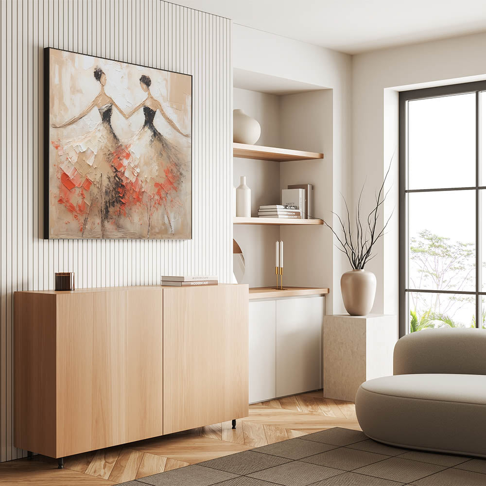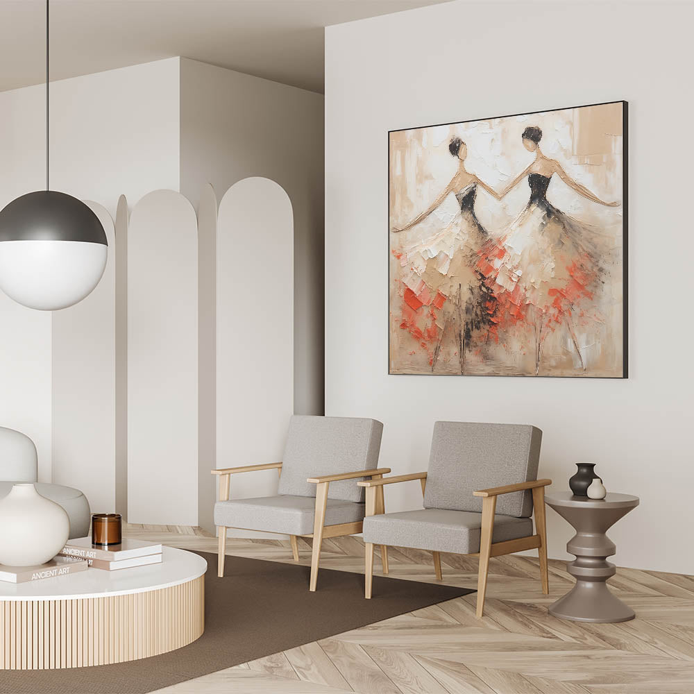 This vibrant figurative abstract artwork captures the delicate and graceful movement of two dancers, beautifully rendered in soft beige, coral, and black hues. The thick, textured brushstrokes give the piece a sense of depth and dynamism, making the figures appear to almost come to life. The flowing dresses, painted in warm tones, add a touch of elegance and vibrancy, making this artwork a perfect focal point for any room. The contrast between the soft background and the bold colors of the dancers creates a visually striking composition that is sure to captivate anyone who views it.