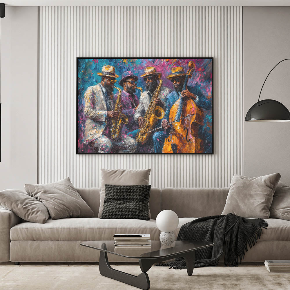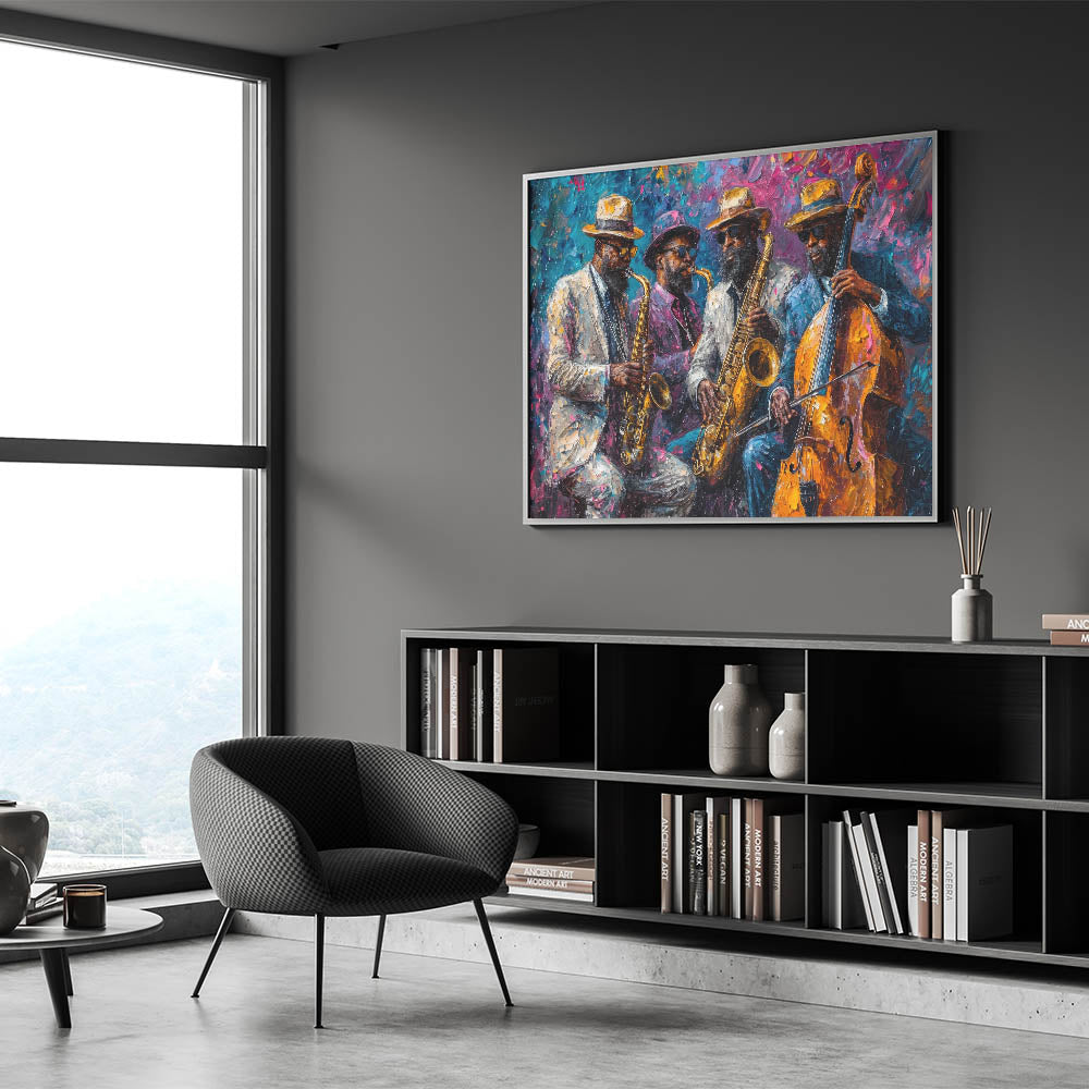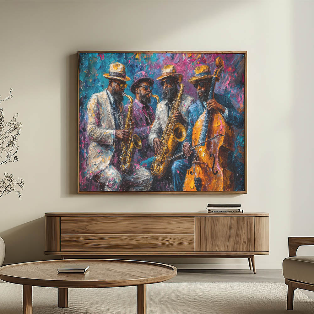 Add a touch of rhythm and color to your home with our "Vibrant Figurative Abstract Wall Art - Jazz Musicians in Colorful Ensemble." This dynamic artwork features a group of jazz musicians, rendered in bold and vivid strokes that capture the energy and spirit of live music. The rich colors and textured details create a lively and captivating scene, perfect for music lovers and art enthusiasts alike.