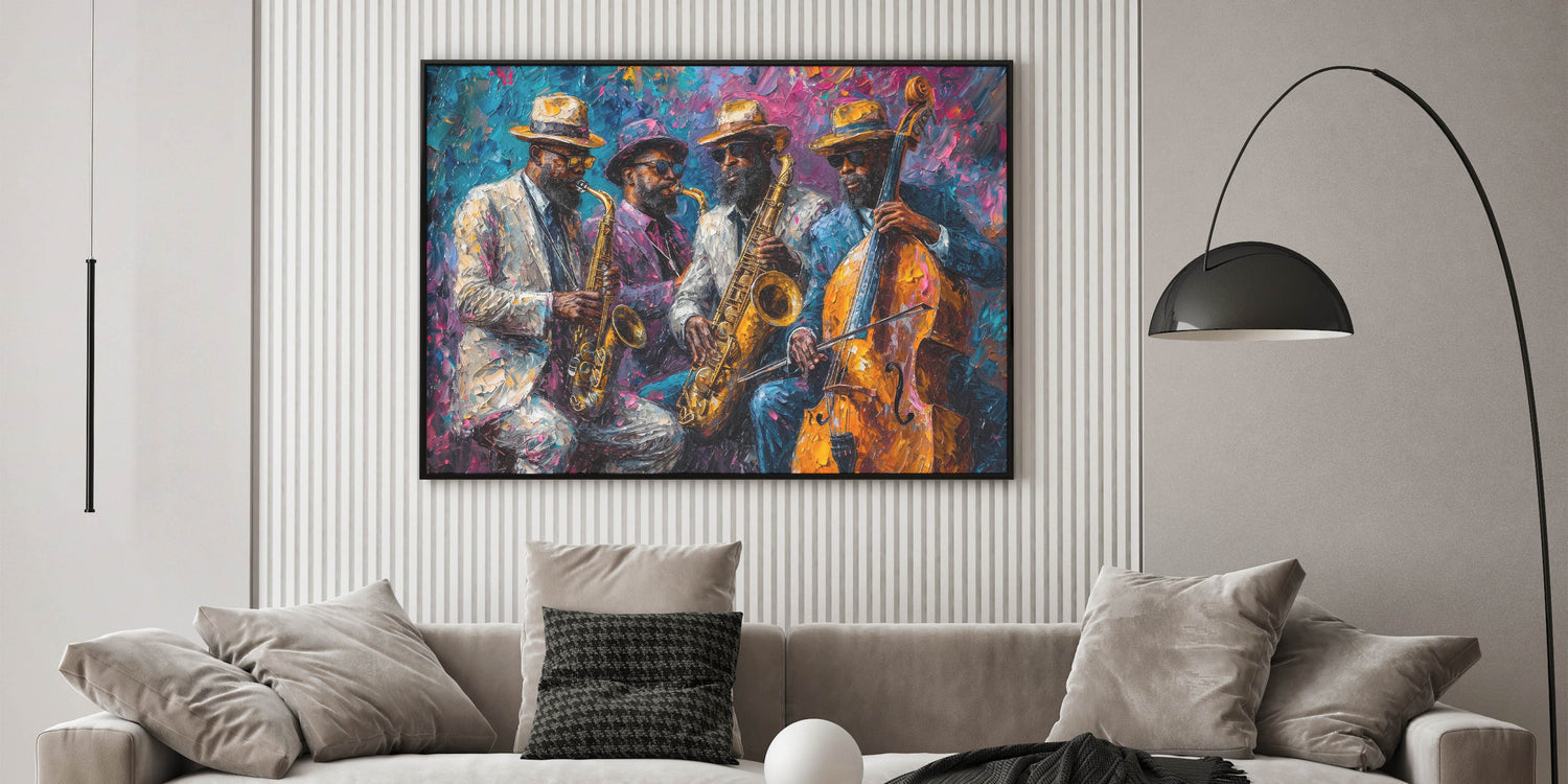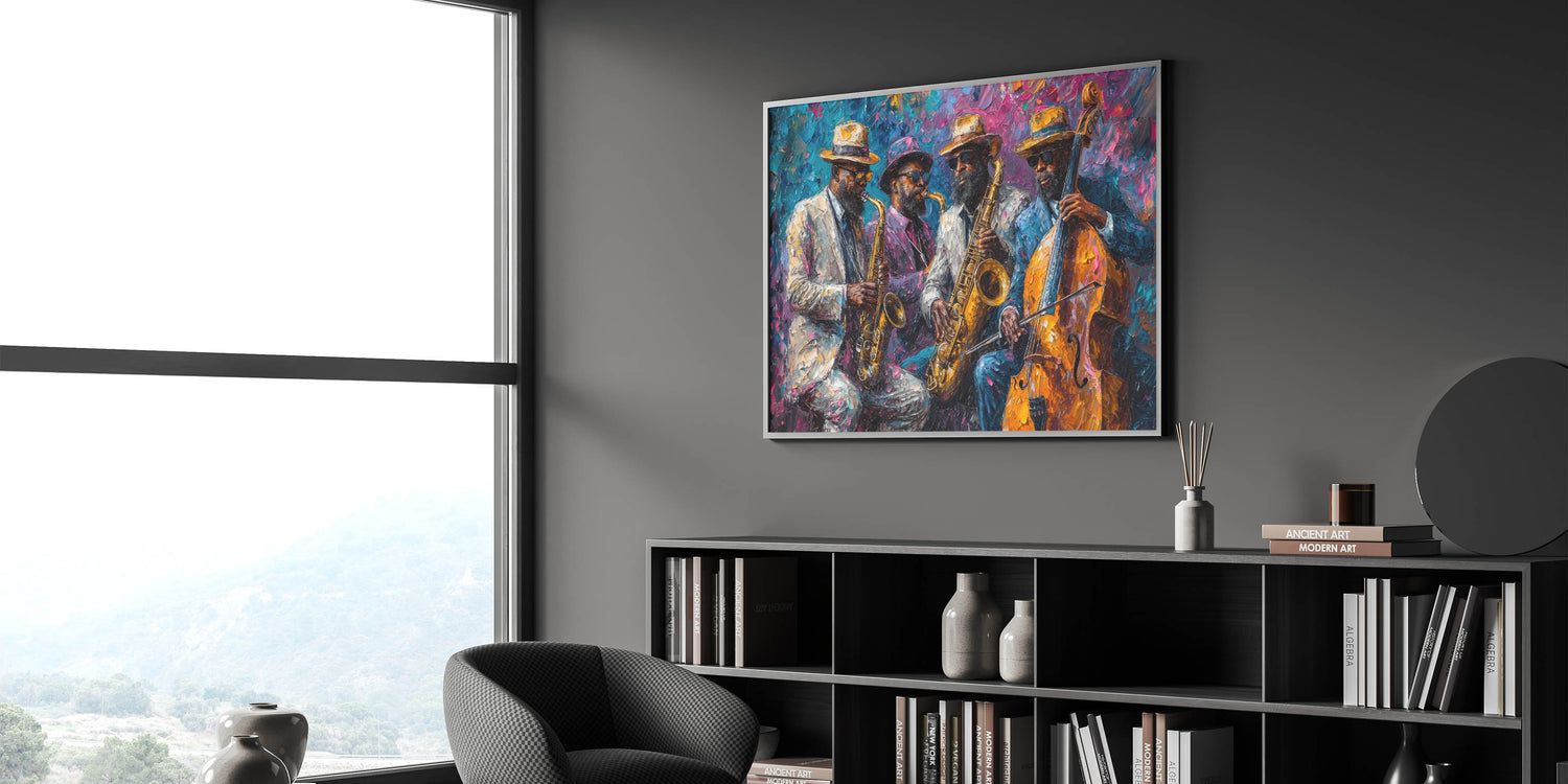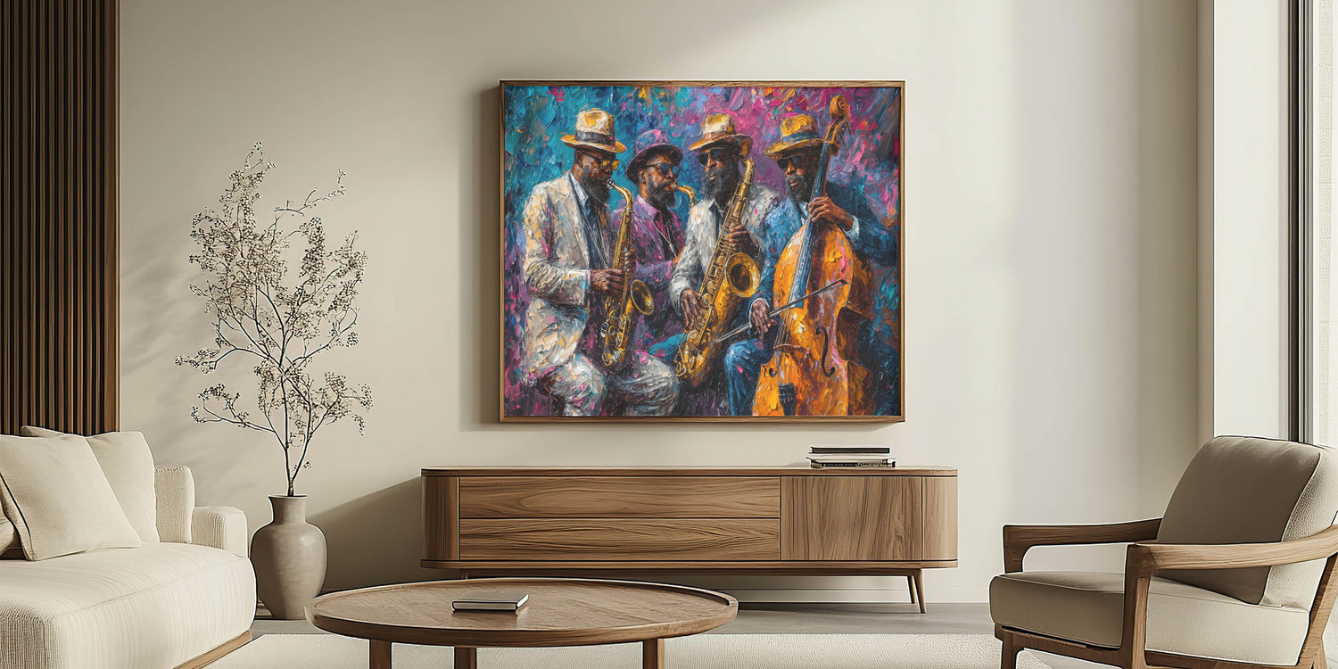 Add a touch of rhythm and color to your home with our "Vibrant Figurative Abstract Wall Art - Jazz Musicians in Colorful Ensemble." This dynamic artwork features a group of jazz musicians, rendered in bold and vivid strokes that capture the energy and spirit of live music. The rich colors and textured details create a lively and captivating scene, perfect for music lovers and art enthusiasts alike.