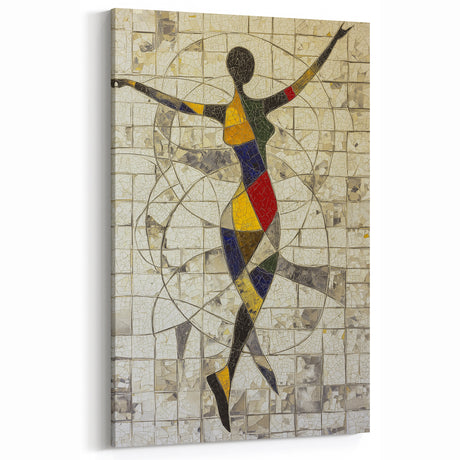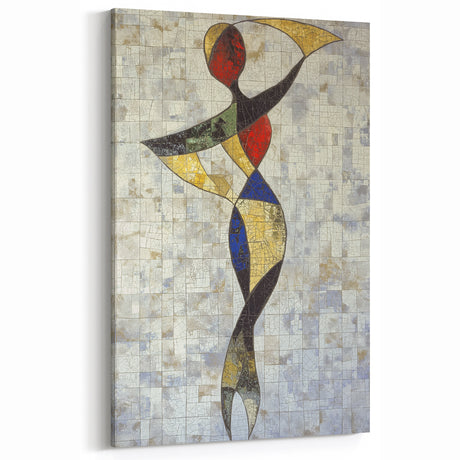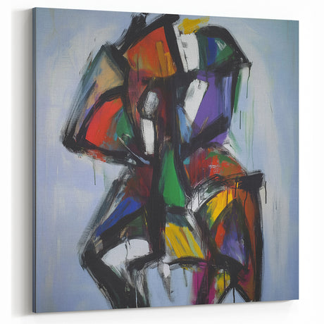 • Stretched canvas artwork showcasing an abstract figurative design with vibrant colors and dynamic shapes, perfect for modern home decor or artistic spaces.