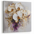 Transform your space with the elegance of this abstract floral art featuring delicate white orchids accented by shimmering gold and touches of deep plum. This luxurious design combines rich textures with a sophisticated color palette, creating a masterpiece that exudes opulence and modern artistry. Perfect for enhancing any living space, this artwork blends timeless beauty with contemporary flair.