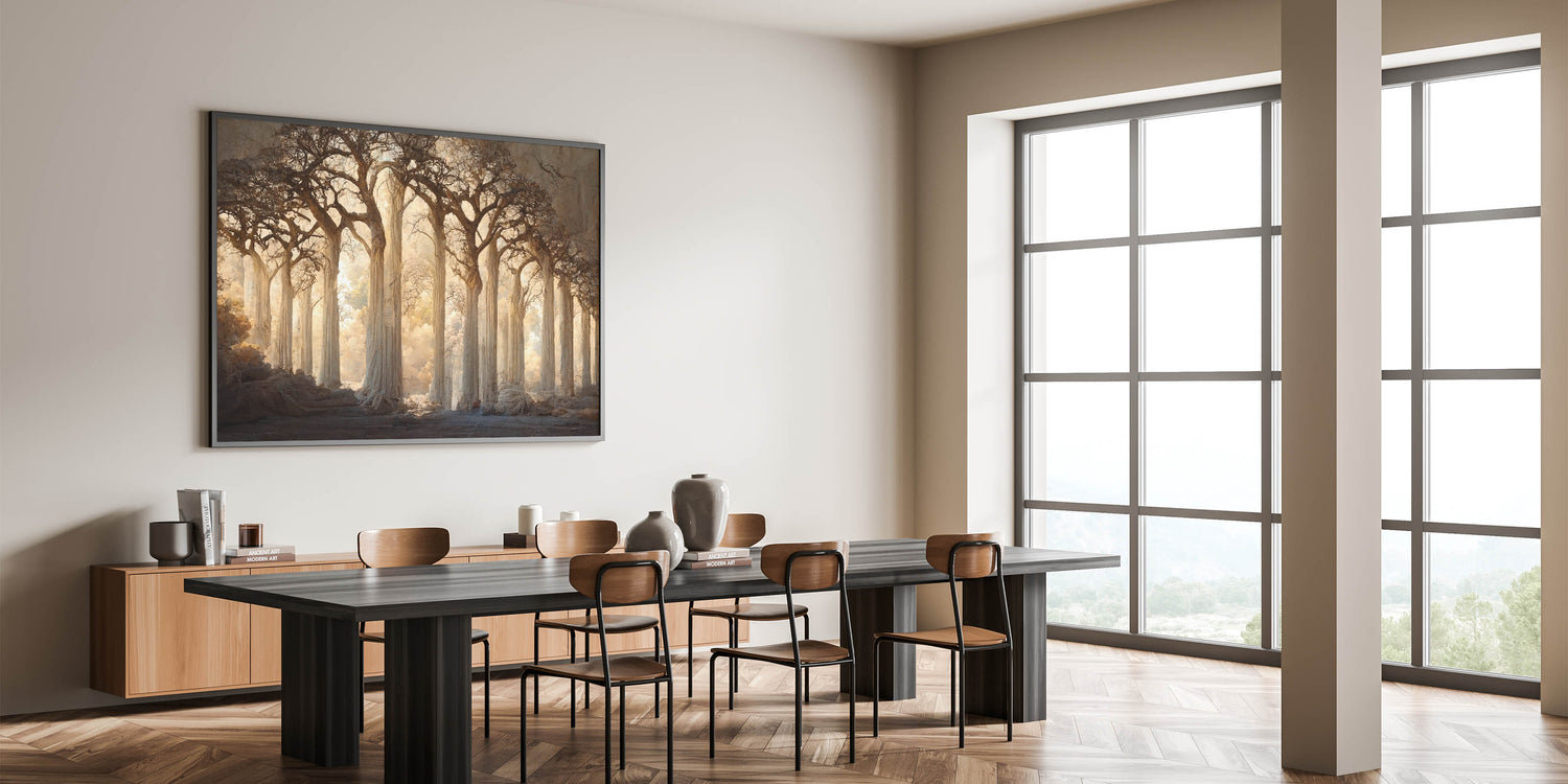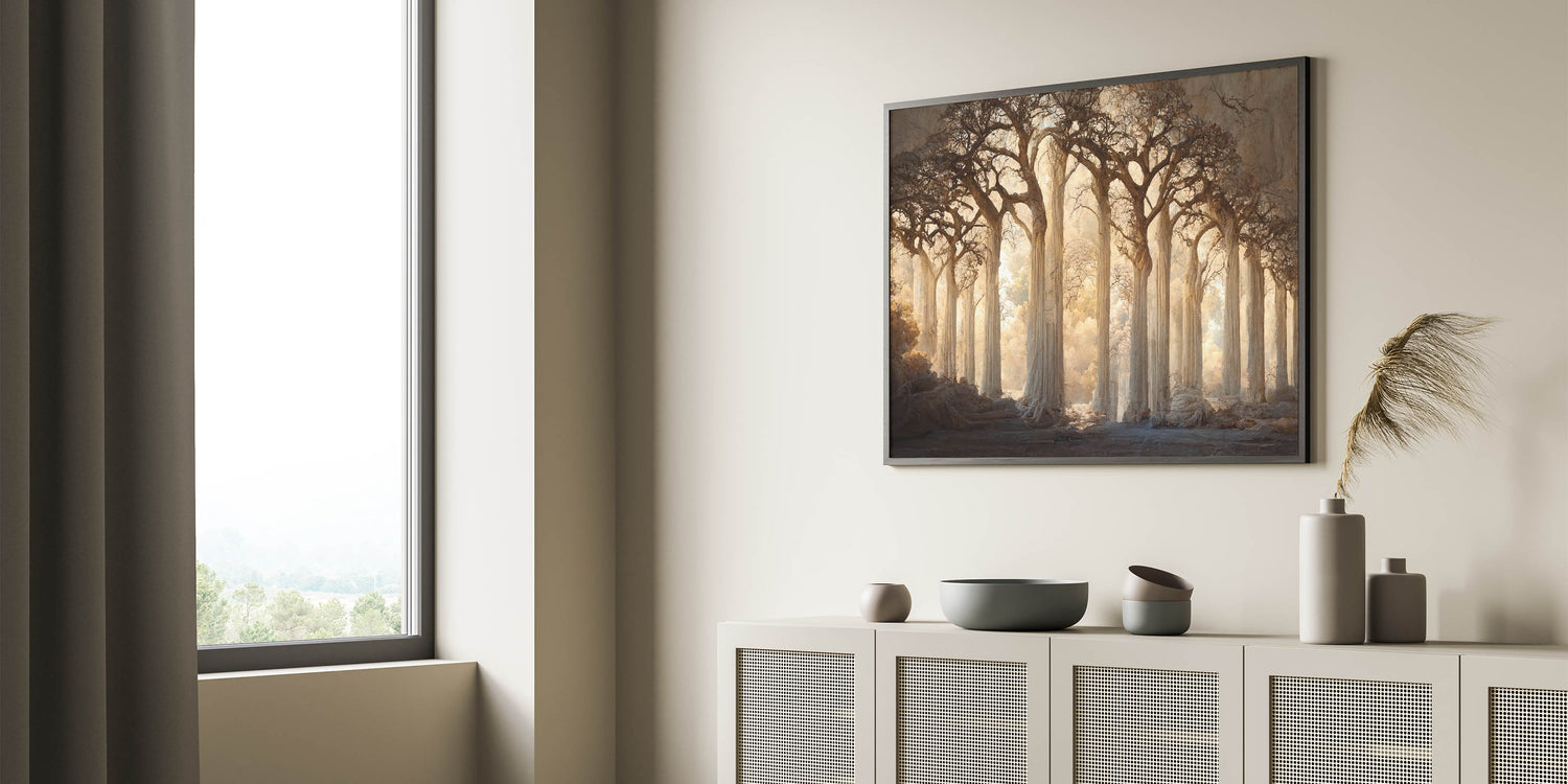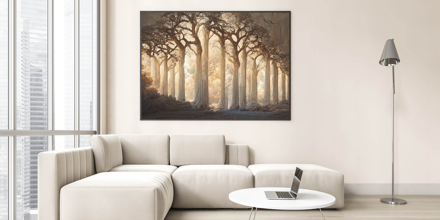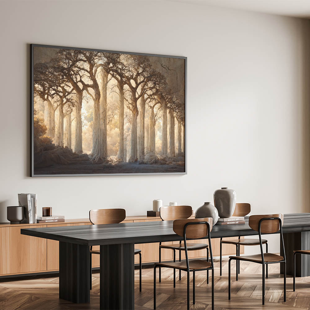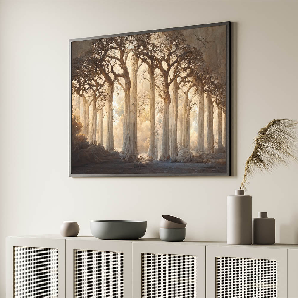 Immerse yourself in the magic of this Abstract Botanical Wall Art, featuring a surreal, enchanted forest scene where towering trees resemble majestic columns. This Enchanted Forest Canvas Landscape blends nature and fantasy, evoking a sense of mystery and wonder. The warm tones of beige, brown, and soft gold create an ethereal glow, making it perfect for adding depth and atmosphere to any room.