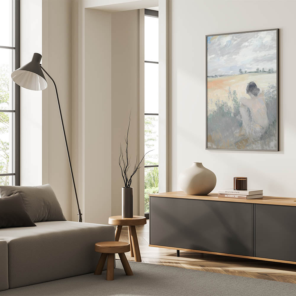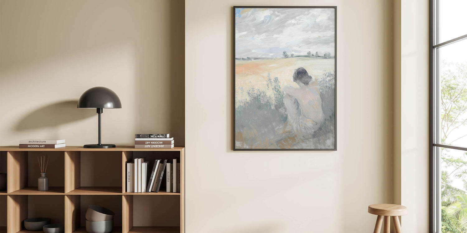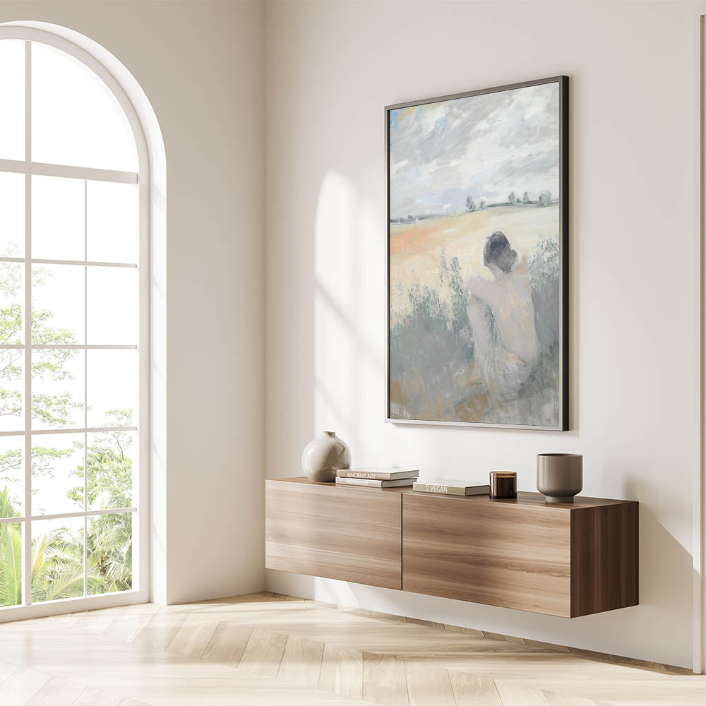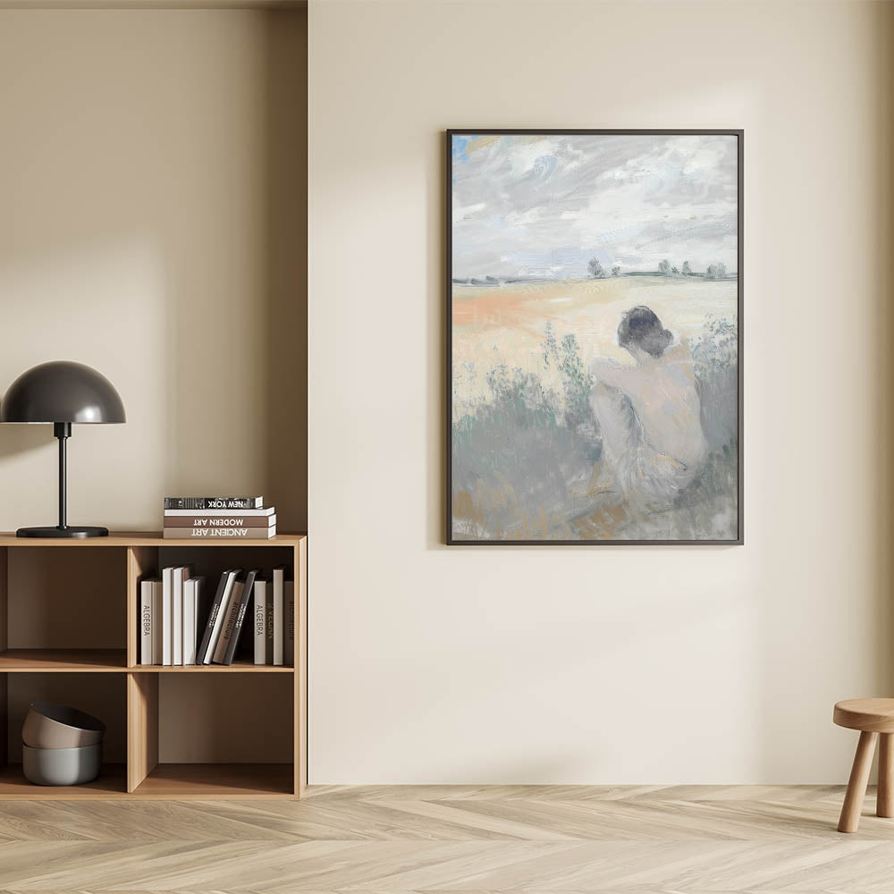 Introduce a sense of calm and introspection to your space with this vibrant figurative abstract design. The artwork features a serene figure seated amidst a tranquil landscape, with soft brushstrokes and an ethereal color palette that evoke peace and reflection. This stunning figurative canvas print blends modern artistic elements with a timeless depiction of the human form.