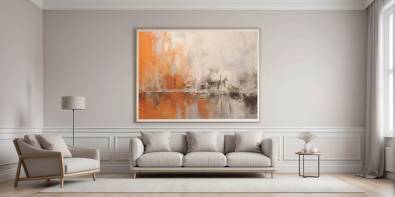 - Bold, expressive brush strokes in vibrant orange and neutral shades