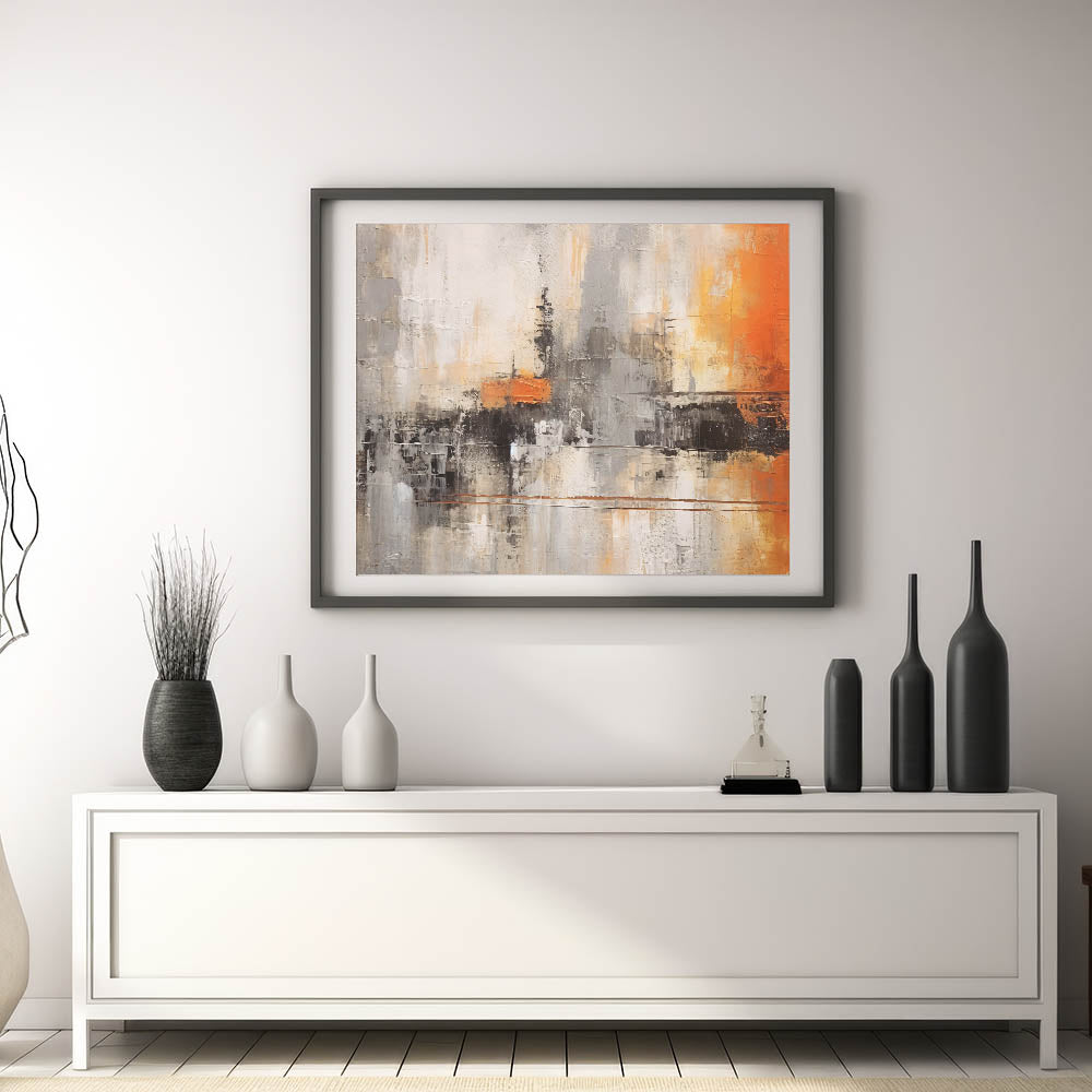 Introduce a modern touch to your space with this captivating abstract strokes and lines artwork. This piece showcases dynamic brush strokes with a sophisticated blend of gray, white, and vibrant orange hues, creating a stunning visual contrast. It’s a perfect fit for those who appreciate contemporary and minimalist design aesthetics.