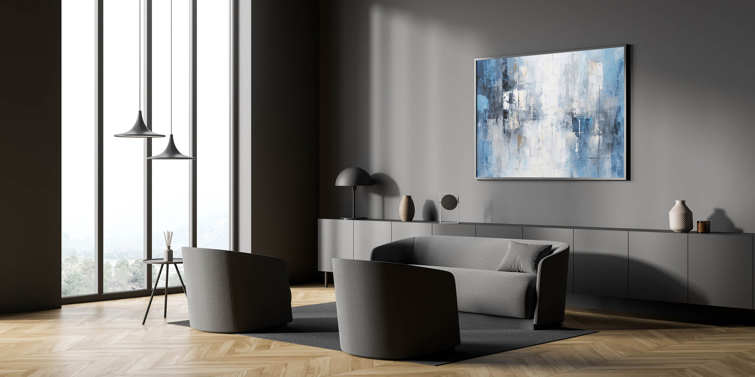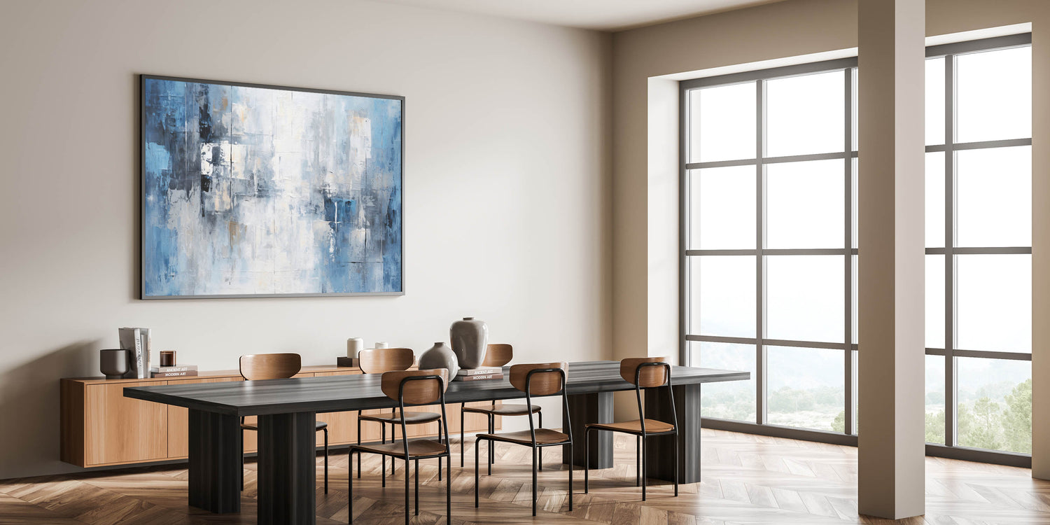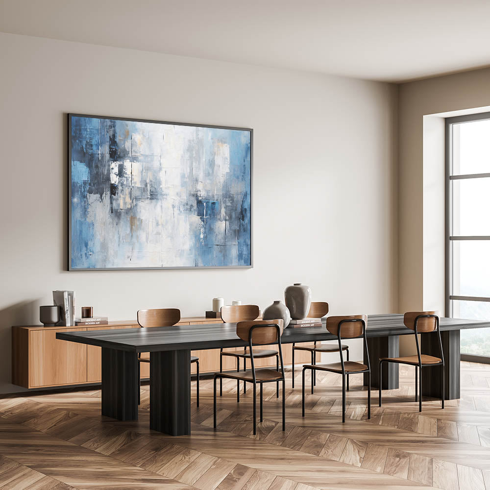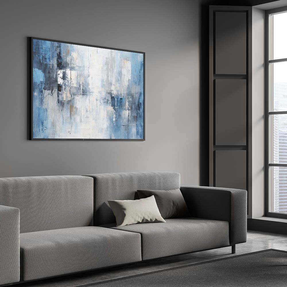- Modern Aesthetic: The cool blue tones and geometric brushstrokes complement contemporary and minimalist decor styles.