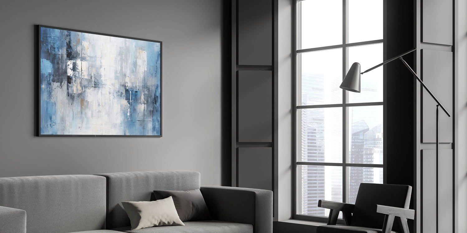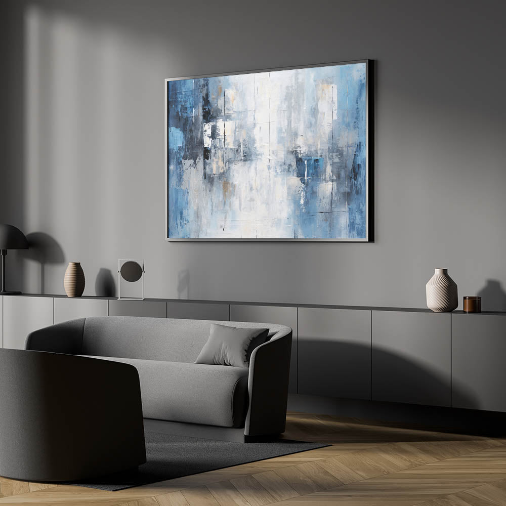 Ideal for living rooms, bedrooms, or offices, this artwork brings a sense of peace and sophistication to any space. Its cool color palette and structured design make it a versatile addition to modern decor.