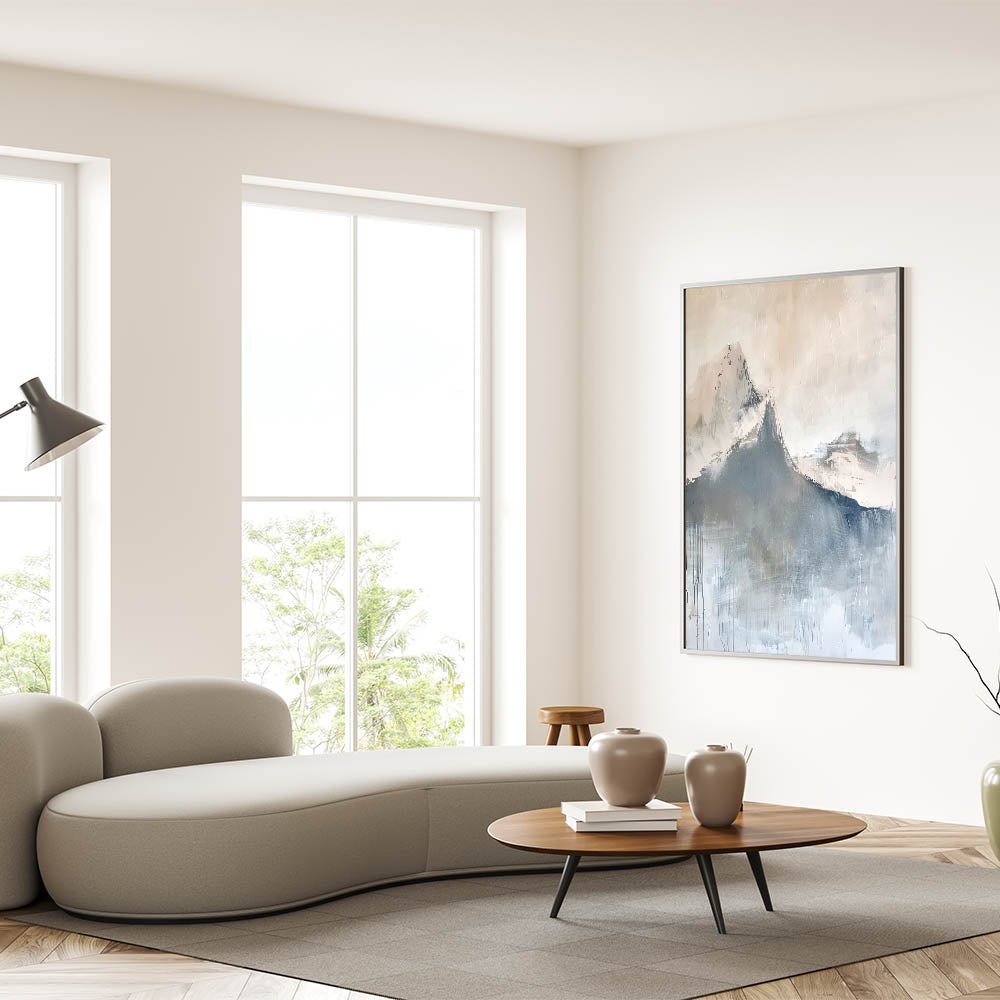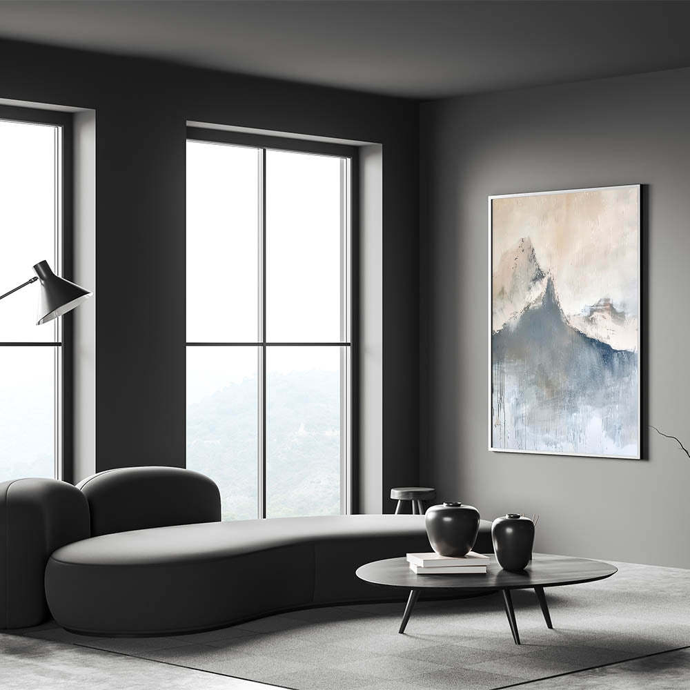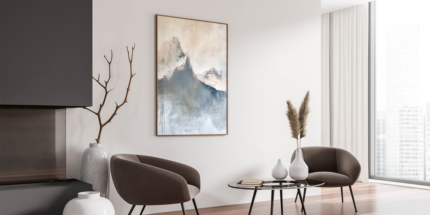 - High-quality abstract mountain landscape print with soft, neutral tones