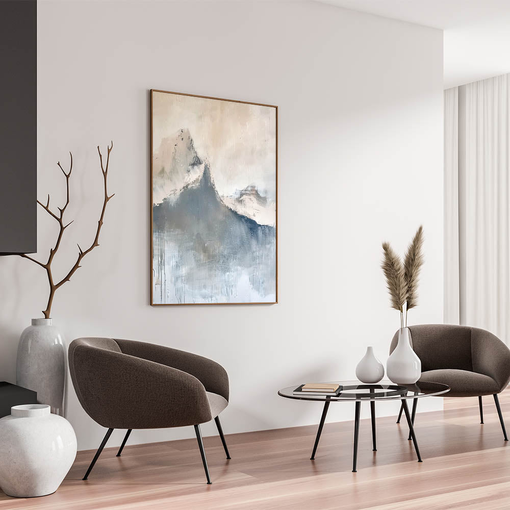 This artwork’s gentle color palette and mountain imagery evoke a sense of calm and connection to nature, making it a timeless piece for any decor style.