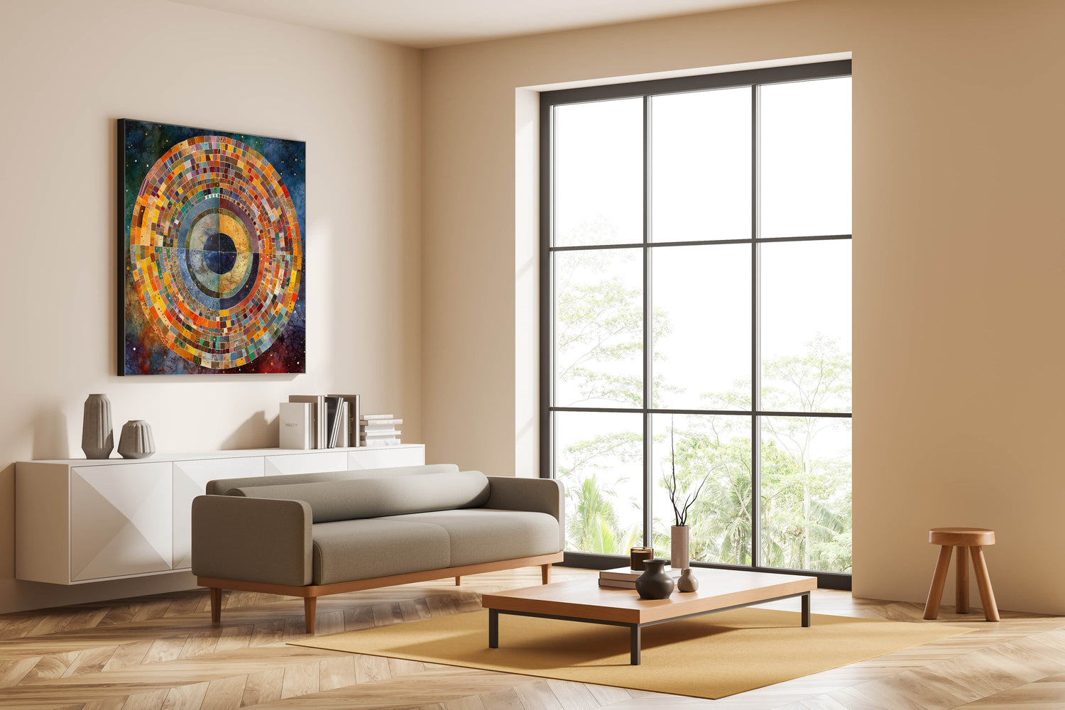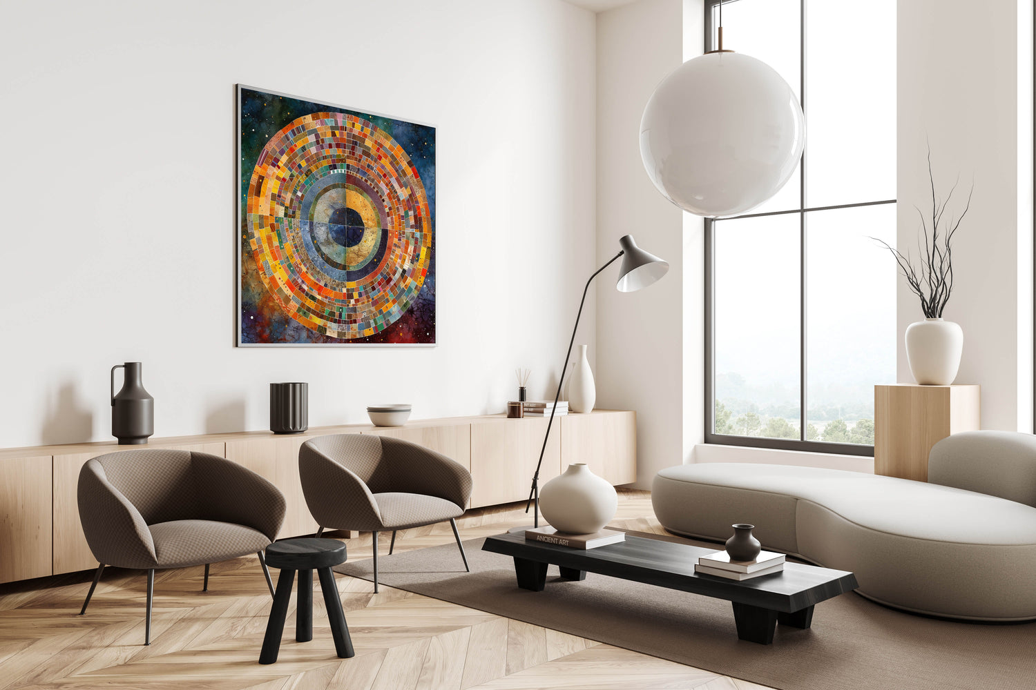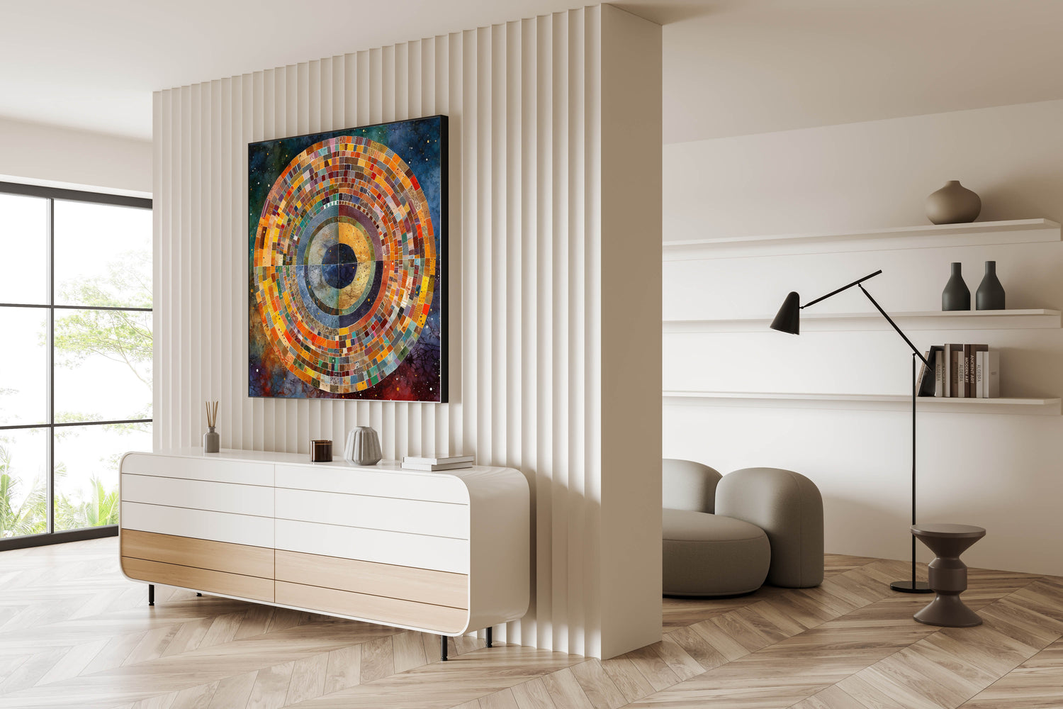 Elevate your interior with this stunning Circular Mosaic Abstract Art piece. This artwork features a captivating design of concentric circles, made up of colorful geometric tiles in shades of orange, red, blue, green, and beige. The intricate pattern creates a sense of movement and balance, while the textured, cosmic-like background adds depth and a touch of mystique.