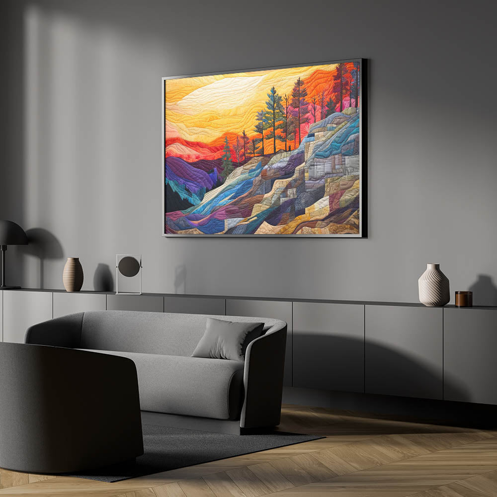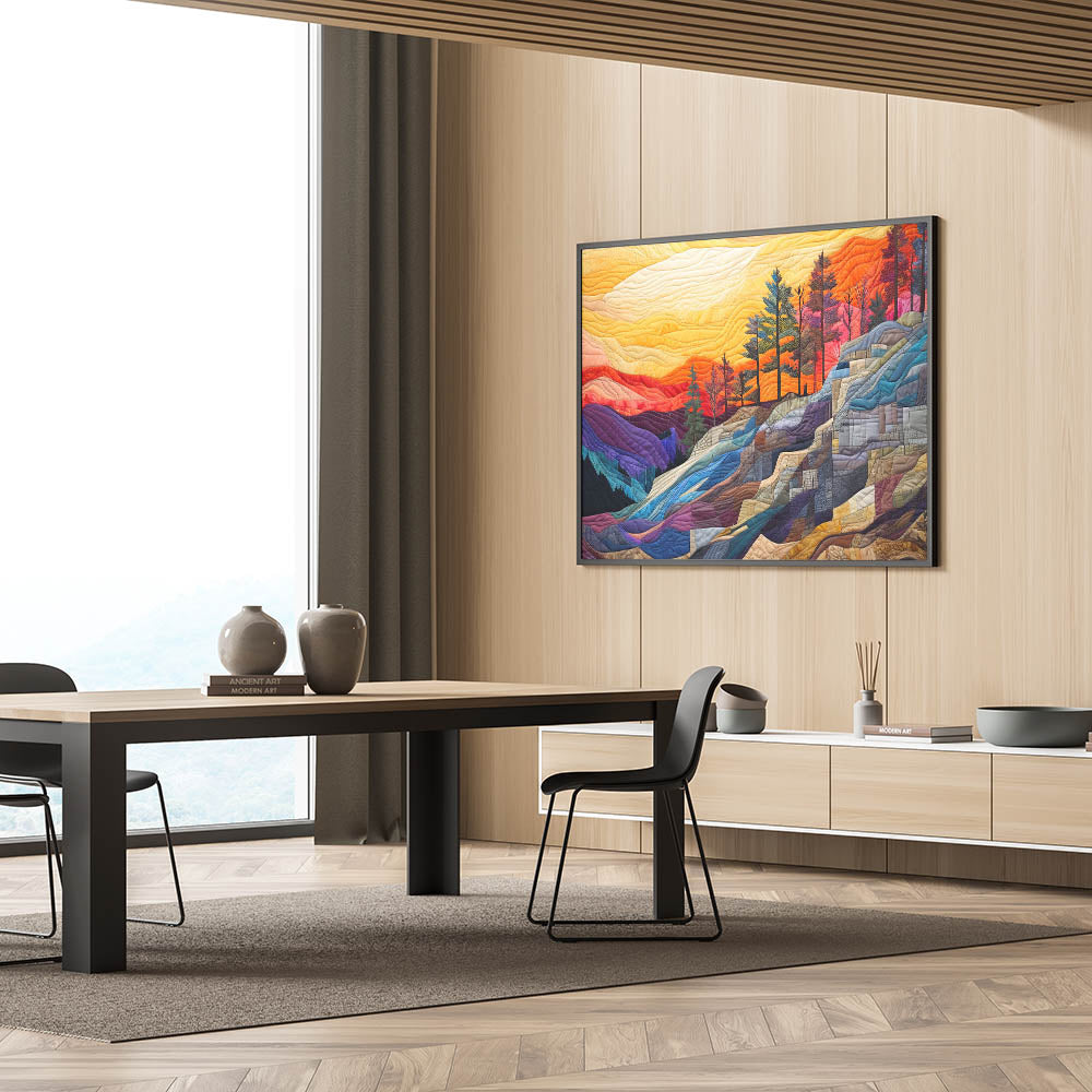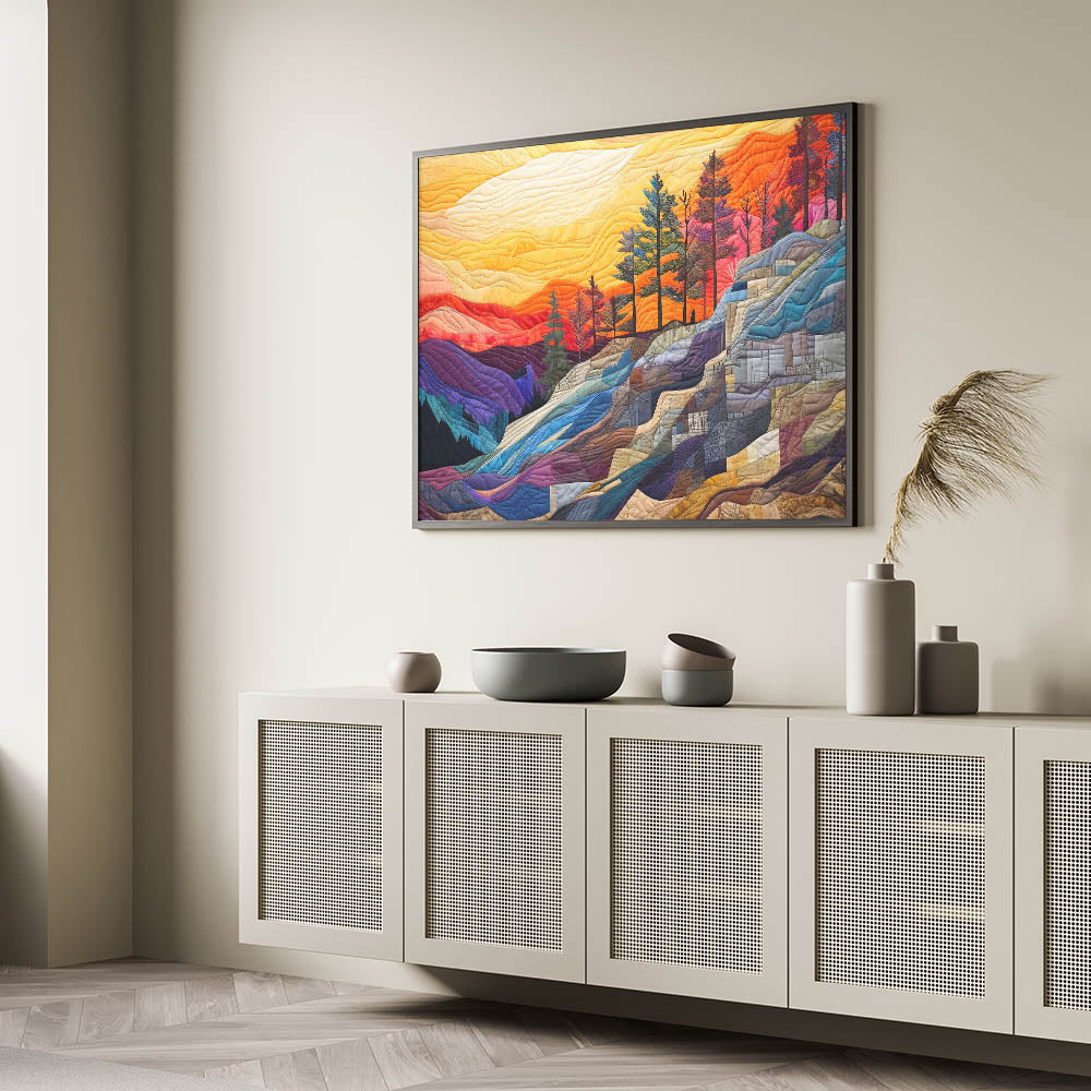 Experience the warmth and beauty of nature with this Colorful Quilted Landscape Art. The artwork features a stunning, quilt-like depiction of rolling hills, a forest of silhouetted trees, and a vibrant sunset sky. The color palette is rich and diverse, with warm hues of orange and yellow blending into deep purples, blues, and earthy browns. The intricate textures and dynamic patterns evoke a sense of movement and depth, making it a captivating focal point for any space.