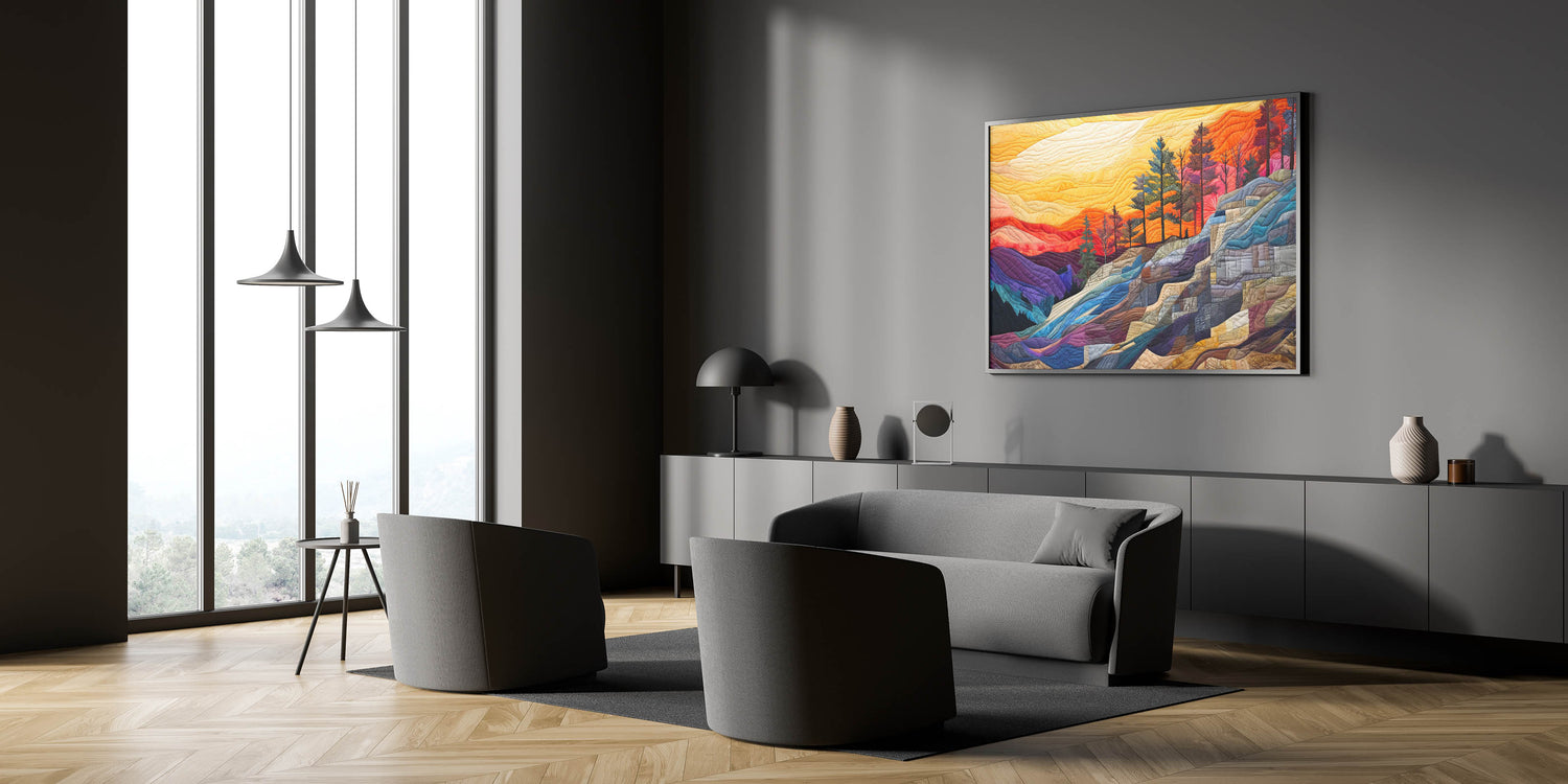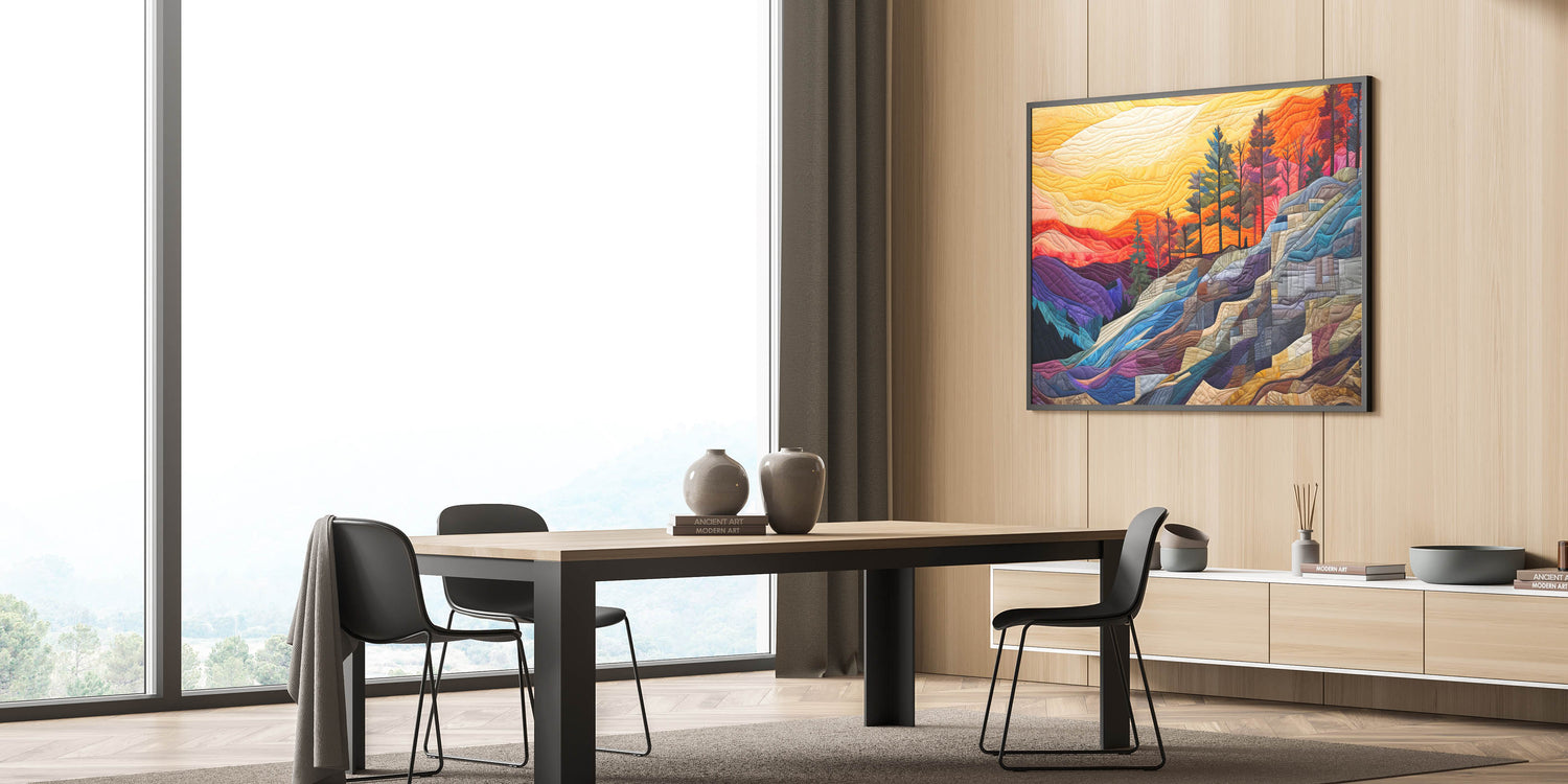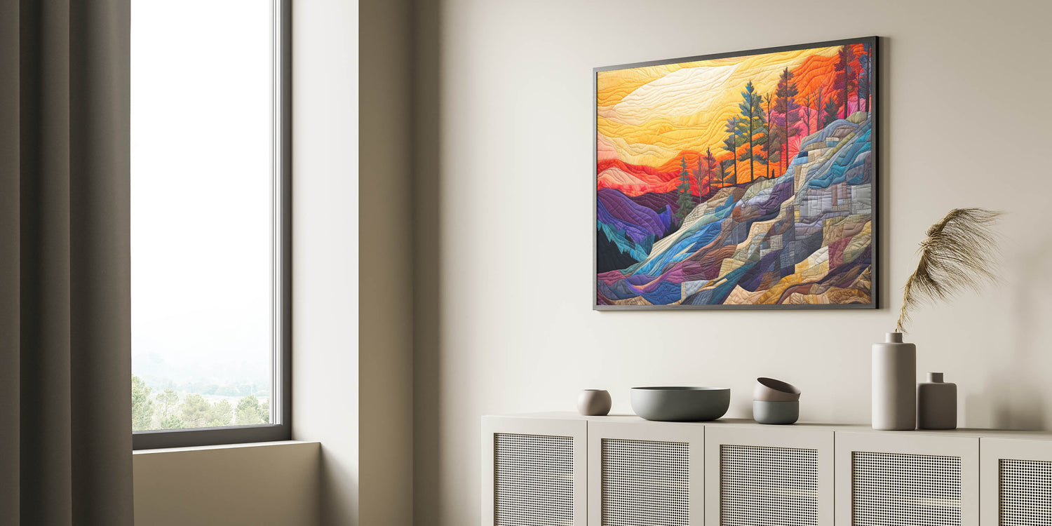 Experience the warmth and beauty of nature with this Colorful Quilted Landscape Art. The artwork features a stunning, quilt-like depiction of rolling hills, a forest of silhouetted trees, and a vibrant sunset sky. The color palette is rich and diverse, with warm hues of orange and yellow blending into deep purples, blues, and earthy browns. The intricate textures and dynamic patterns evoke a sense of movement and depth, making it a captivating focal point for any space.