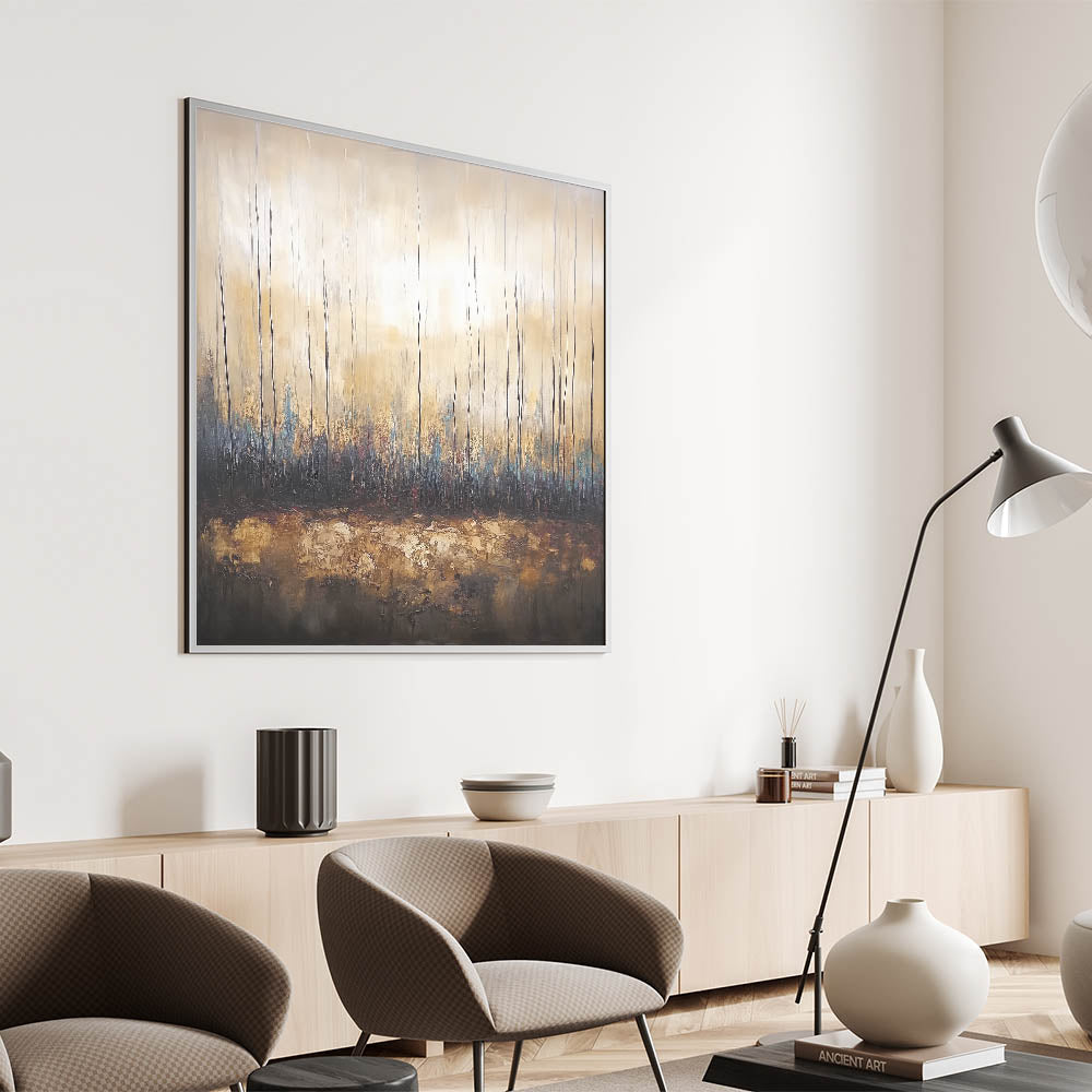 Transform your space with the serene beauty of this Earthy Abstract Tree Line Canvas. Featuring delicate, vertical tree-like forms rising from a richly textured ground, this design is rendered in muted tones of brown, beige, and cream with subtle hints of blue. The gradient effect in the background adds depth and warmth, making it a perfect addition to modern, rustic, or contemporary spaces.