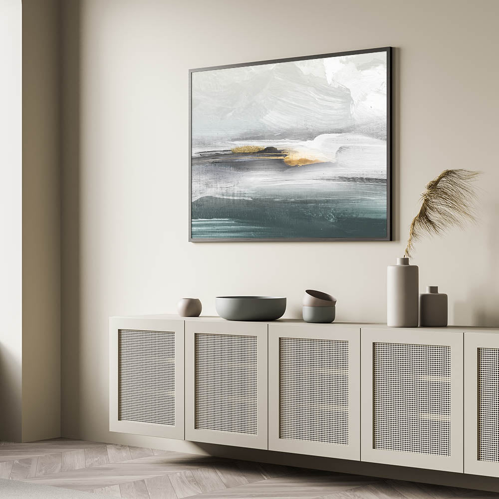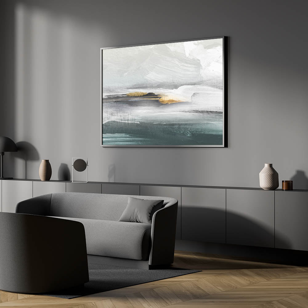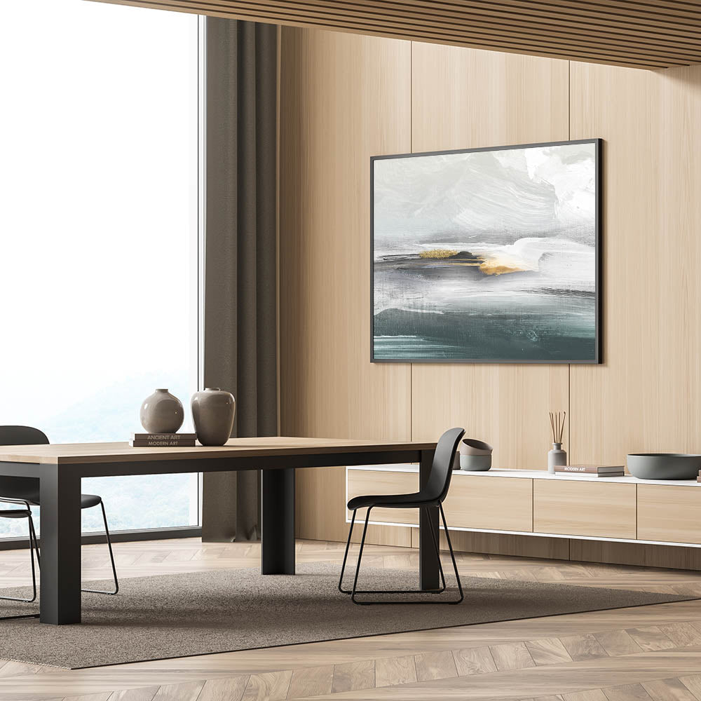 Add a sophisticated touch to your space with this Elegant Strokes and Lines Abstract Art piece. Featuring a serene composition of soft grays, deep greens, and highlighted with a splash of gold, this artwork exudes a calming yet luxurious feel. The abstract strokes and lines flow seamlessly across the canvas, creating a tranquil landscape that is both modern and timeless.