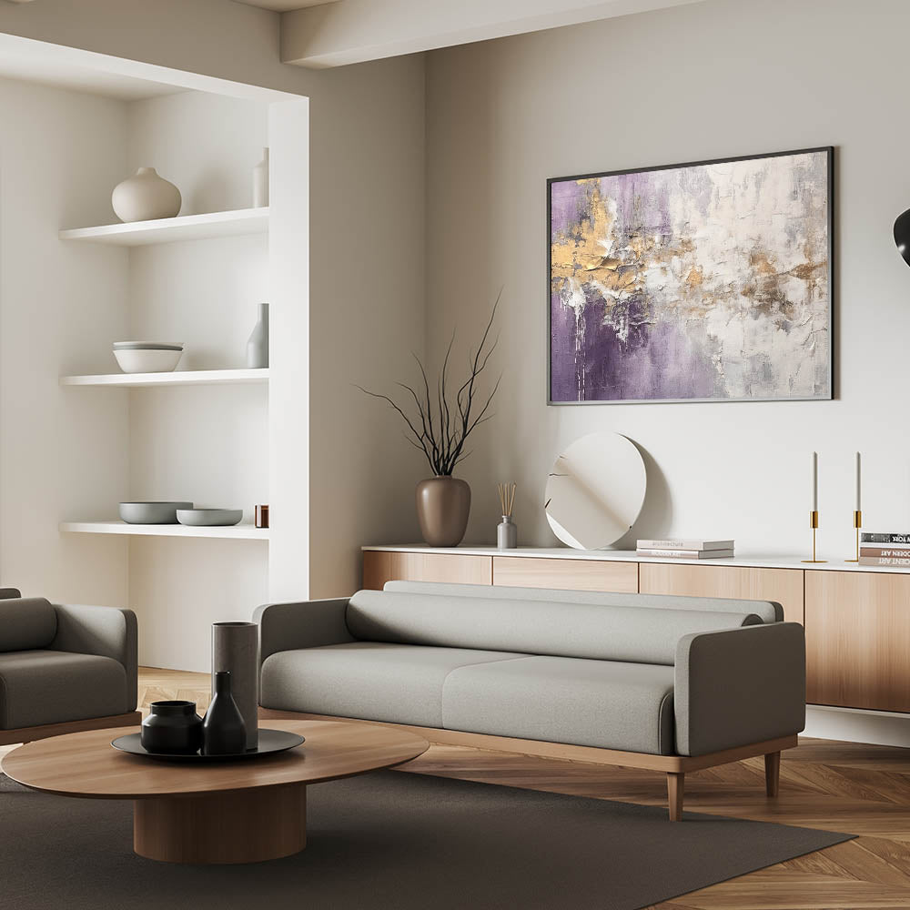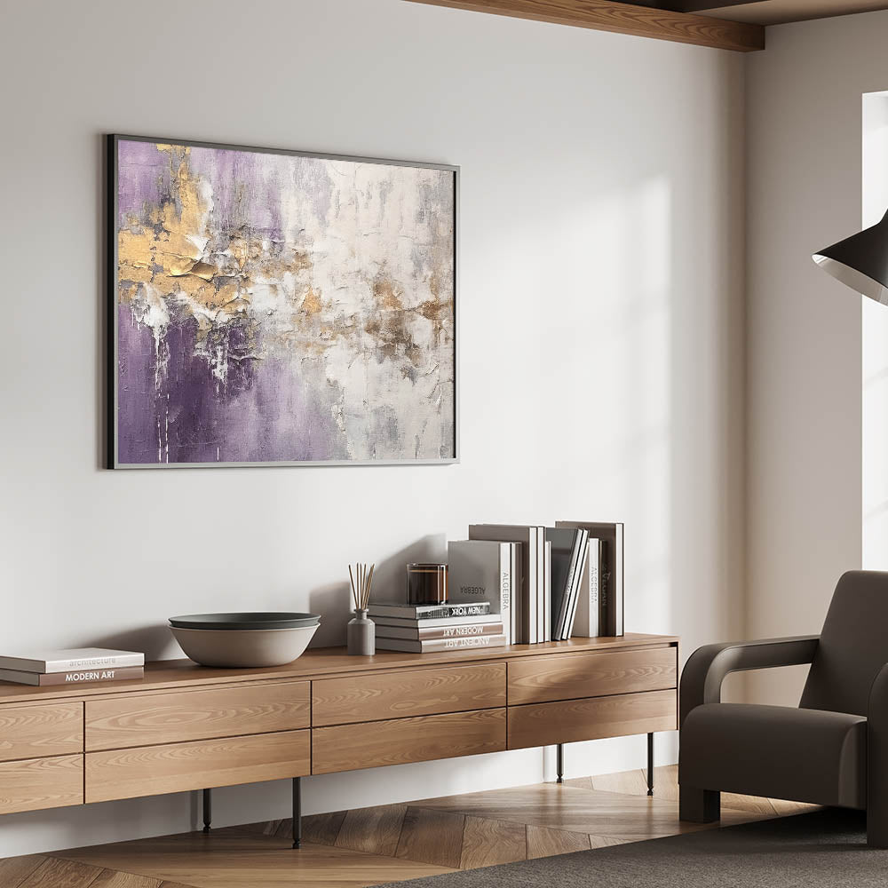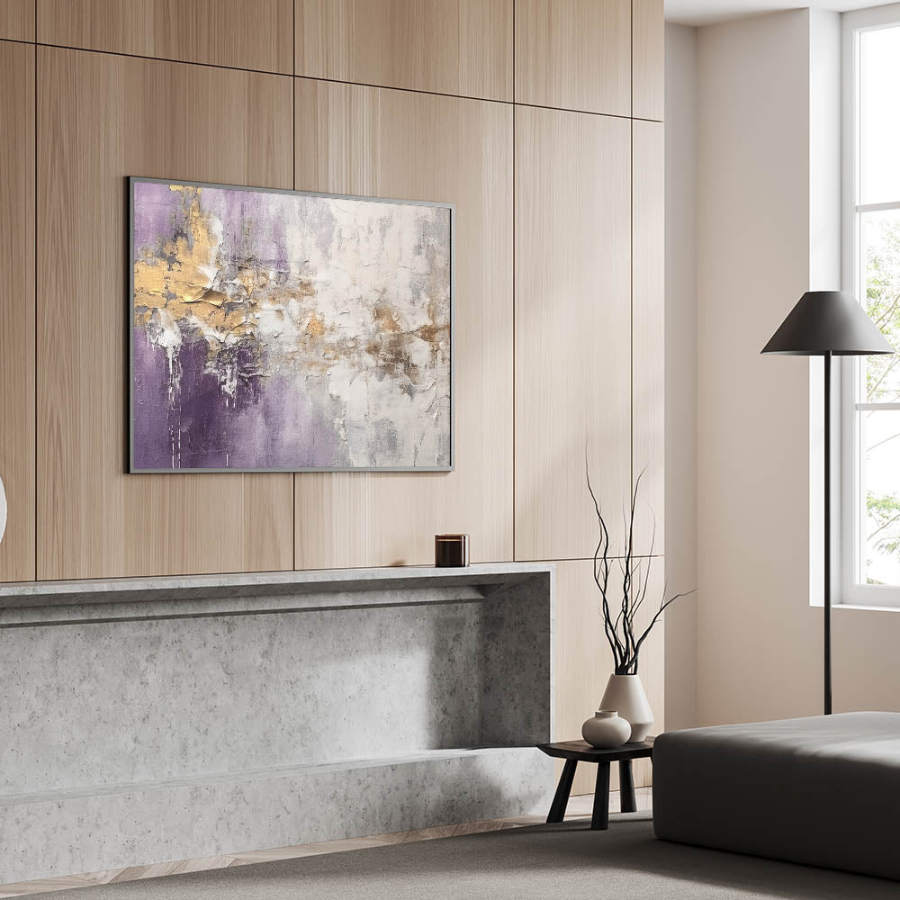 Add sophistication to your space with this stunning abstract strokes and lines wall art, designed to elevate modern interiors. This artwork showcases a beautiful interplay of purple, gold, and white tones, creating a captivating visual experience that combines elegance with contemporary charm. Perfect for any living room, office, or bedroom, this piece offers a blend of minimalism and dynamic artistry.