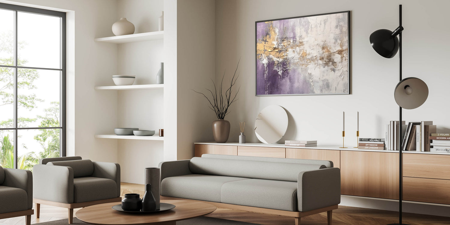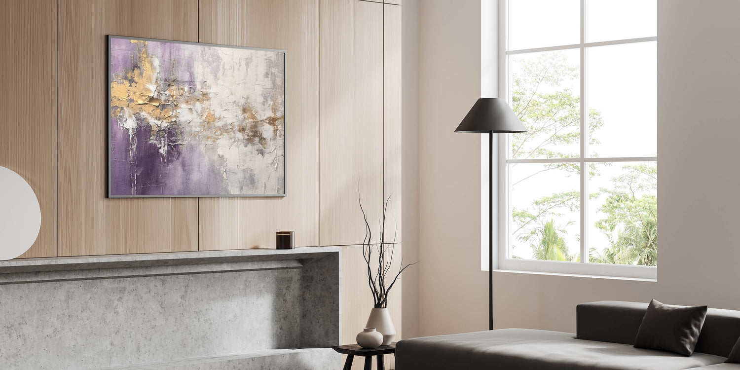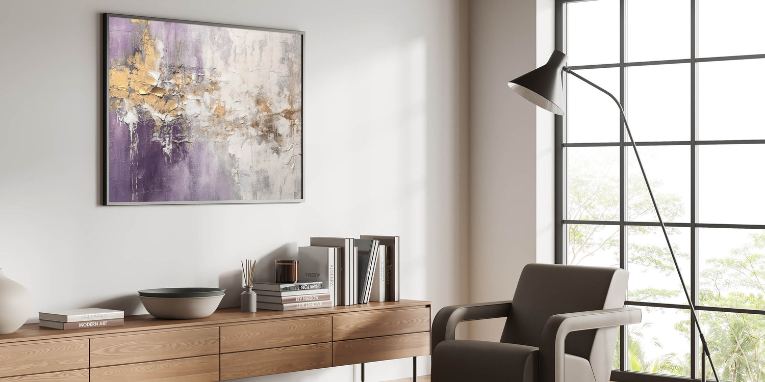 Add sophistication to your space with this stunning abstract strokes and lines wall art, designed to elevate modern interiors. This artwork showcases a beautiful interplay of purple, gold, and white tones, creating a captivating visual experience that combines elegance with contemporary charm. Perfect for any living room, office, or bedroom, this piece offers a blend of minimalism and dynamic artistry.