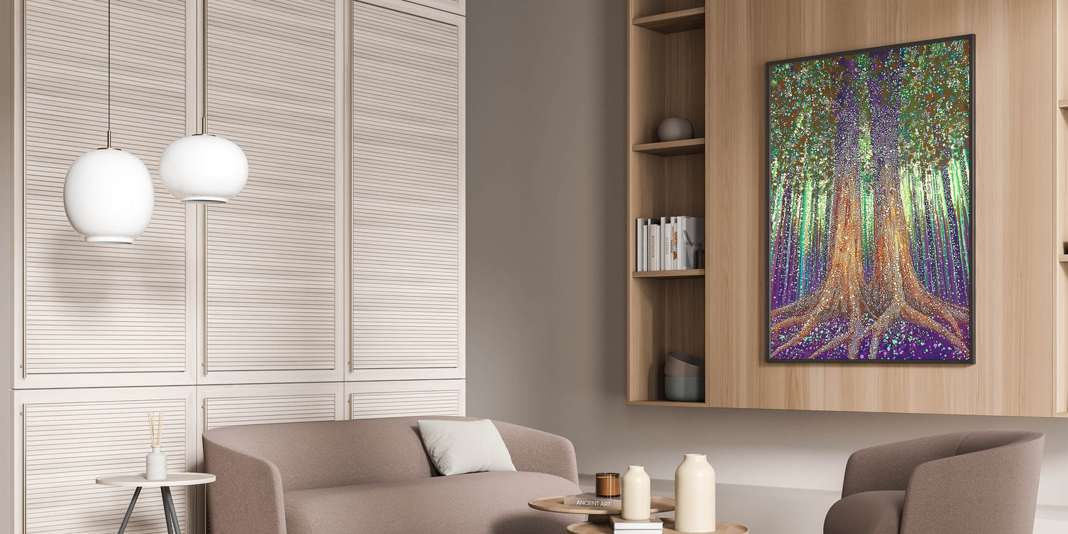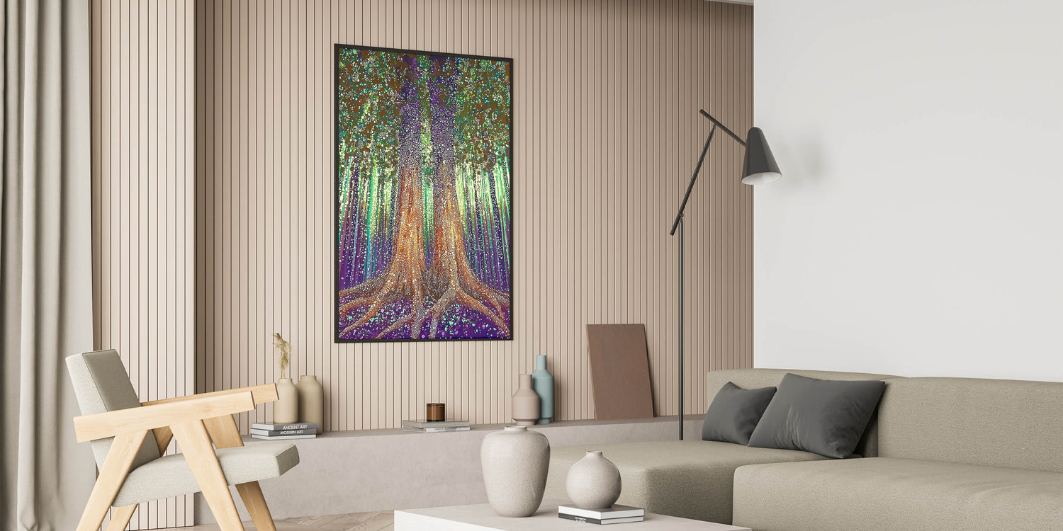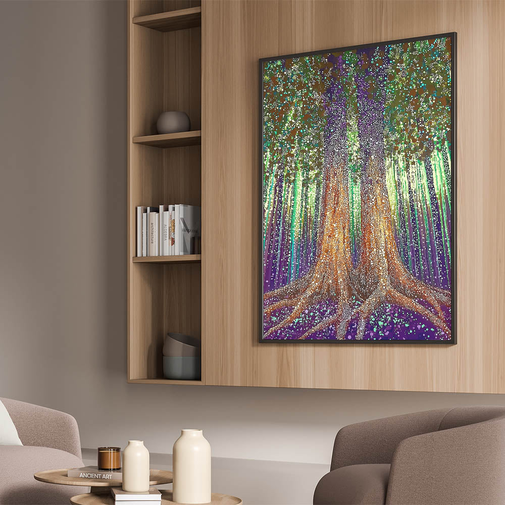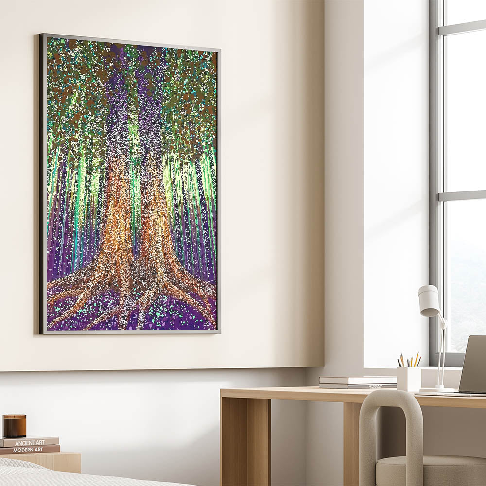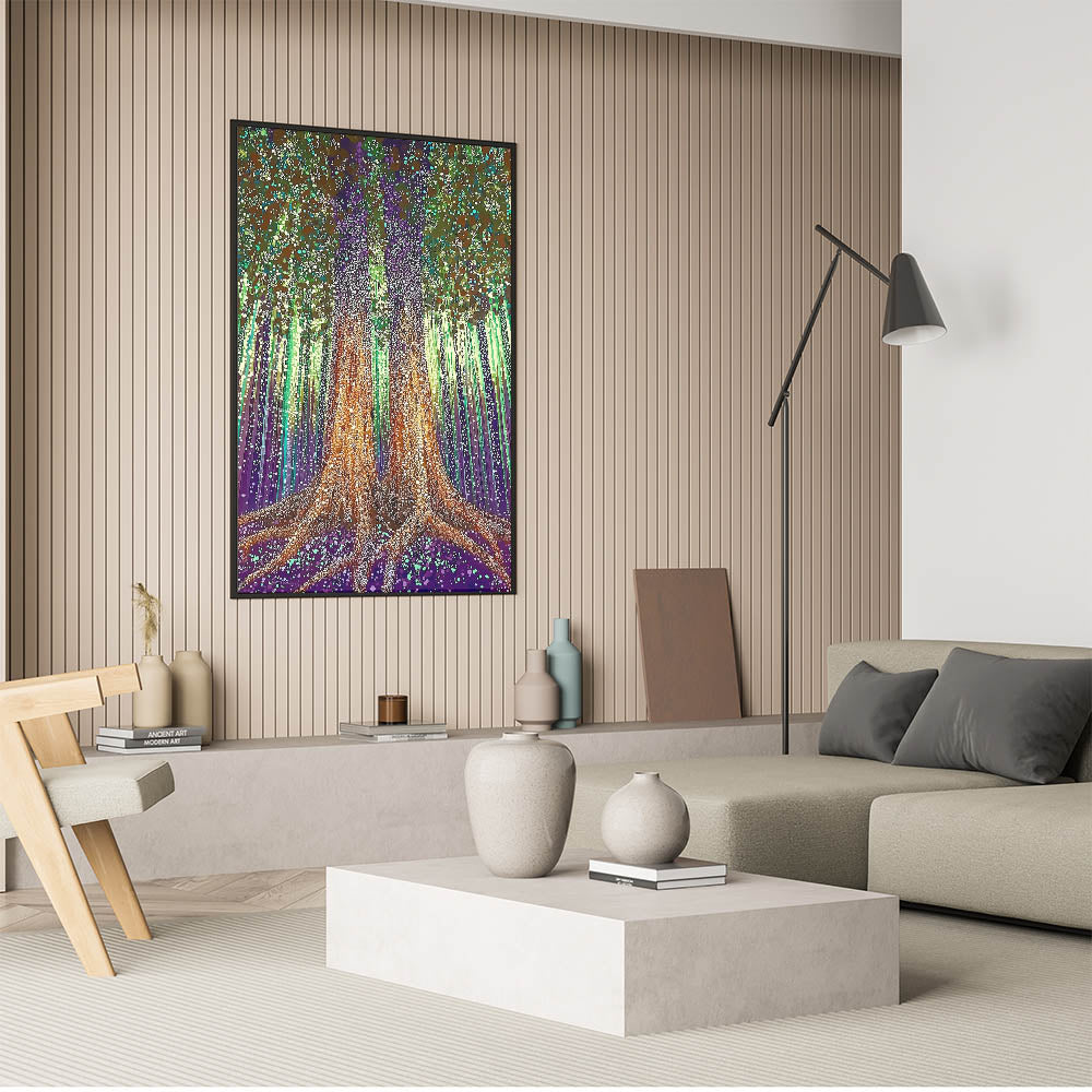 Immerse yourself in the magical allure of the Enchanted Forest Abstract Floral Wall Art. This intricate artwork features two majestic trees rooted deeply in a vibrant purple and green landscape, surrounded by glowing lights and textured patterns. The mesmerizing blend of earthy tones, luminous dots, and vertical strokes creates an ethereal and captivating design, making it an ideal statement piece for modern, eclectic, or nature-inspired interiors.