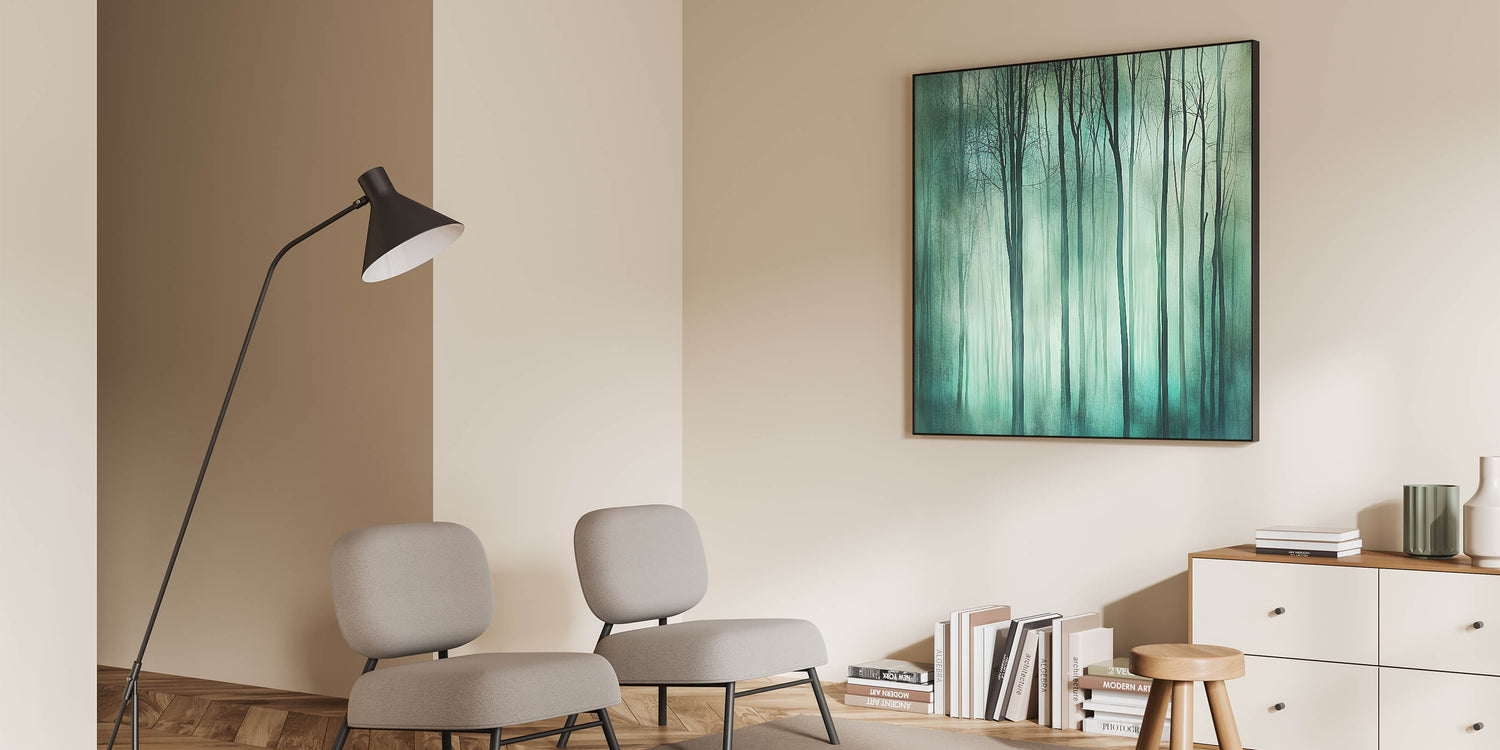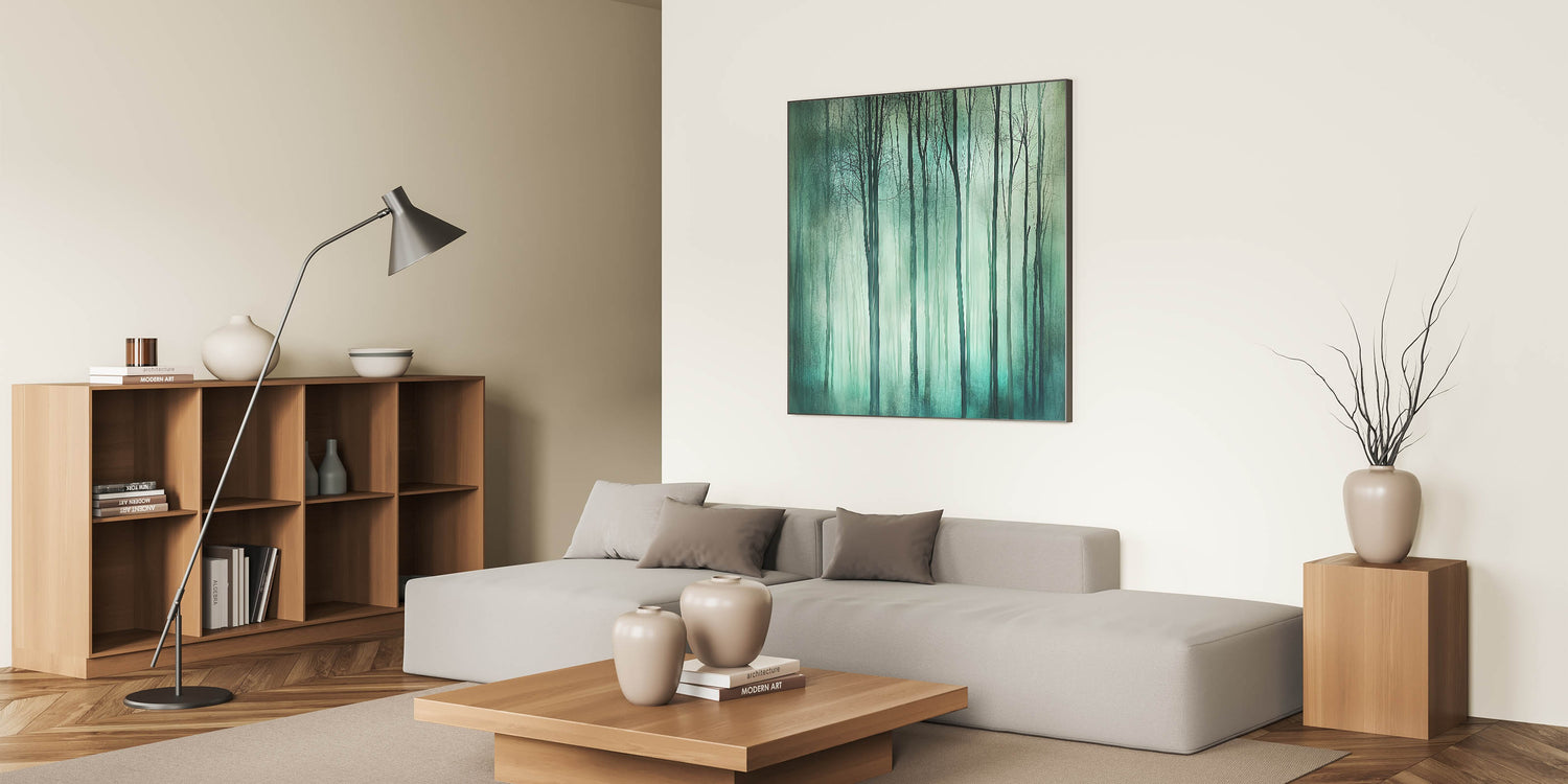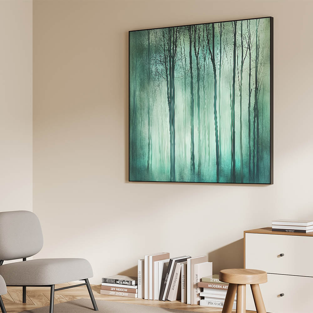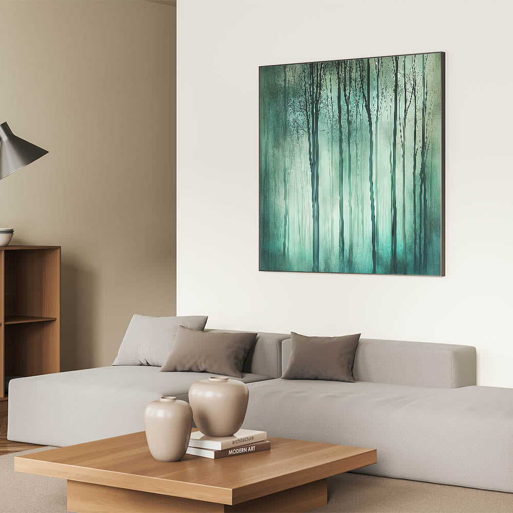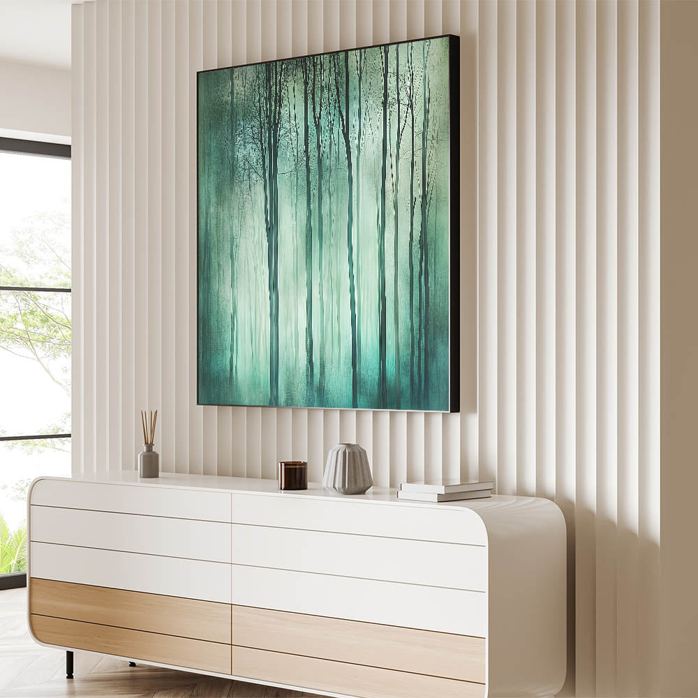 Immerse yourself in the tranquil beauty of this ethereal forest-inspired artwork. Featuring vertical silhouettes of tall trees in soft hues of teal and green, this piece evokes a sense of peace and serenity. The misty gradient background adds depth and a dreamlike quality, making it a perfect addition to contemporary, minimalist, or nature-inspired interiors.