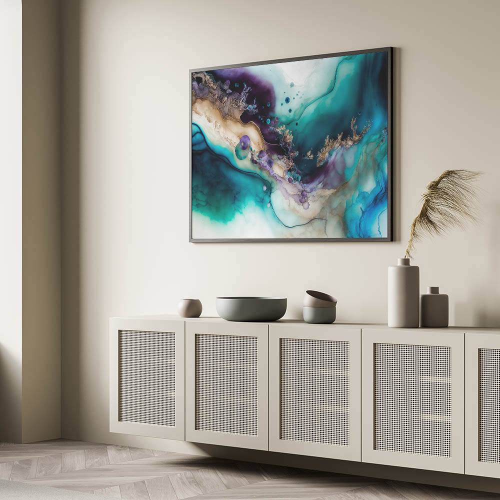 Dive into the beauty of this ethereal underwater-inspired abstract artwork. The canvas features a captivating blend of deep teal, rich purple, and warm beige, creating a fluid, oceanic landscape. The swirling colors and intricate details evoke a sense of movement and tranquility, making this piece a perfect addition for those seeking a serene yet vibrant element in their décor.