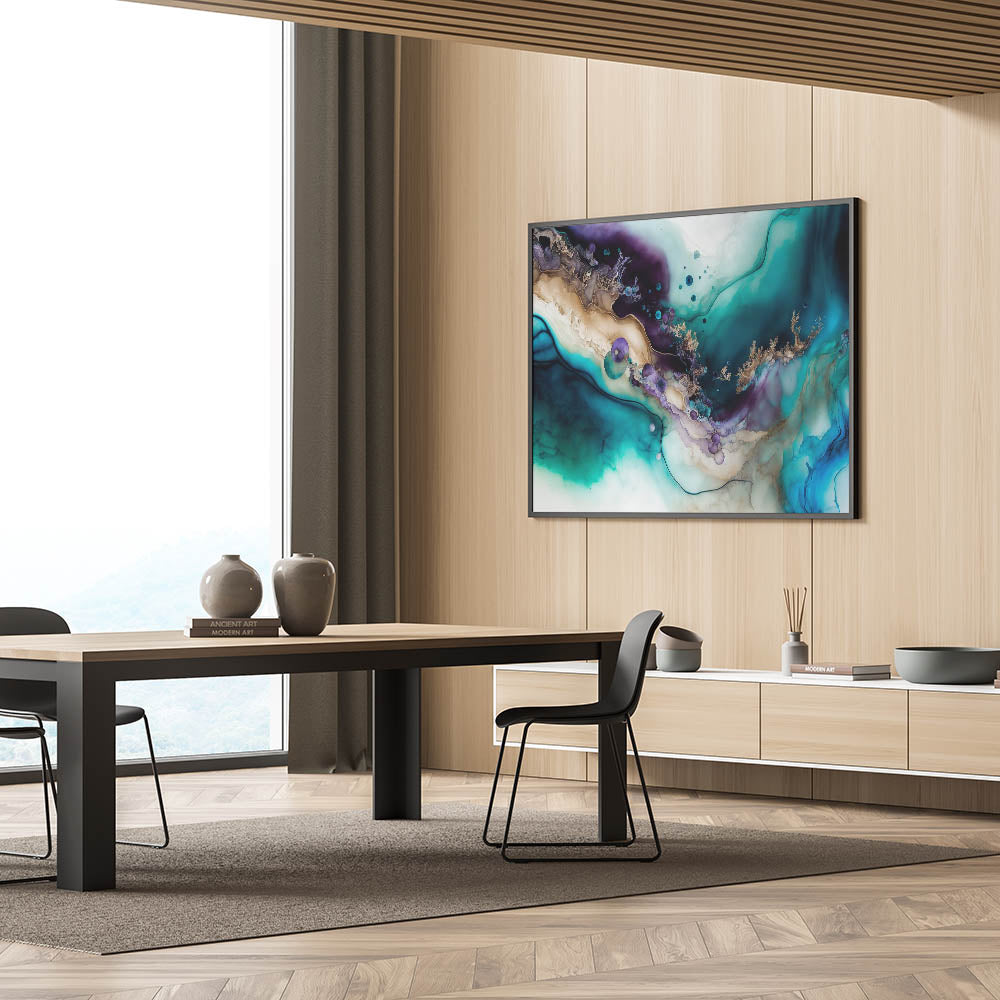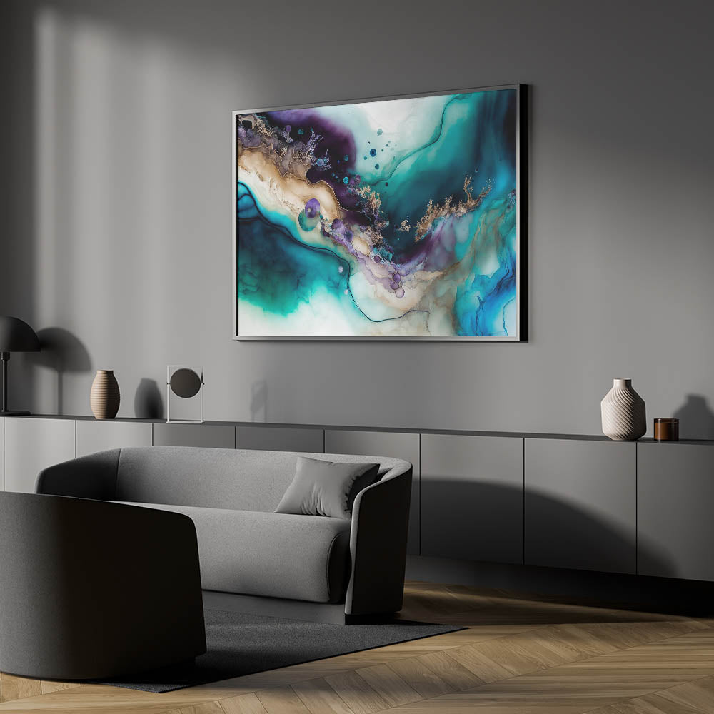 • A stunning blend of teal, purple, and beige with fluid, underwater-inspired design