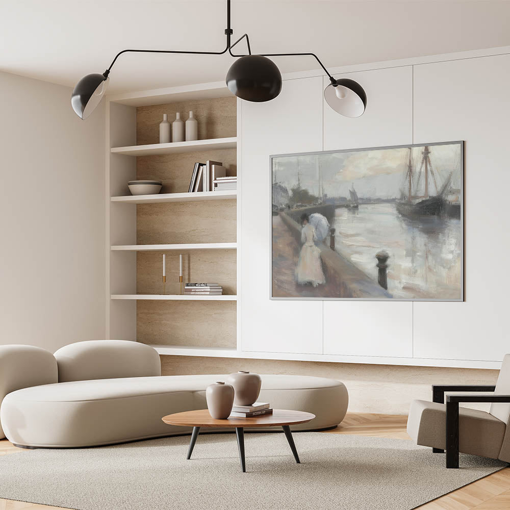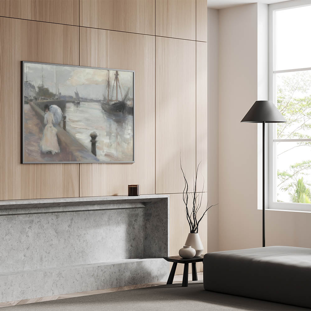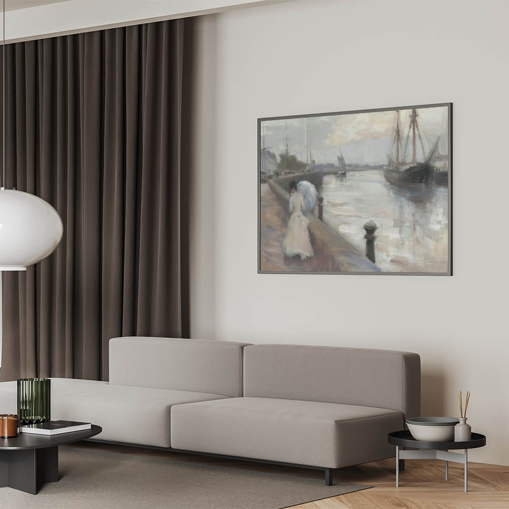 Capture the beauty of a tranquil moment with this figurative abstract canvas. Featuring a graceful figure walking along the waterfront with an umbrella, this artwork is a poetic portrayal of serenity and elegance. The muted tones and soft brushstrokes bring a dreamlike quality, making it perfect for enhancing your decor with sophistication.