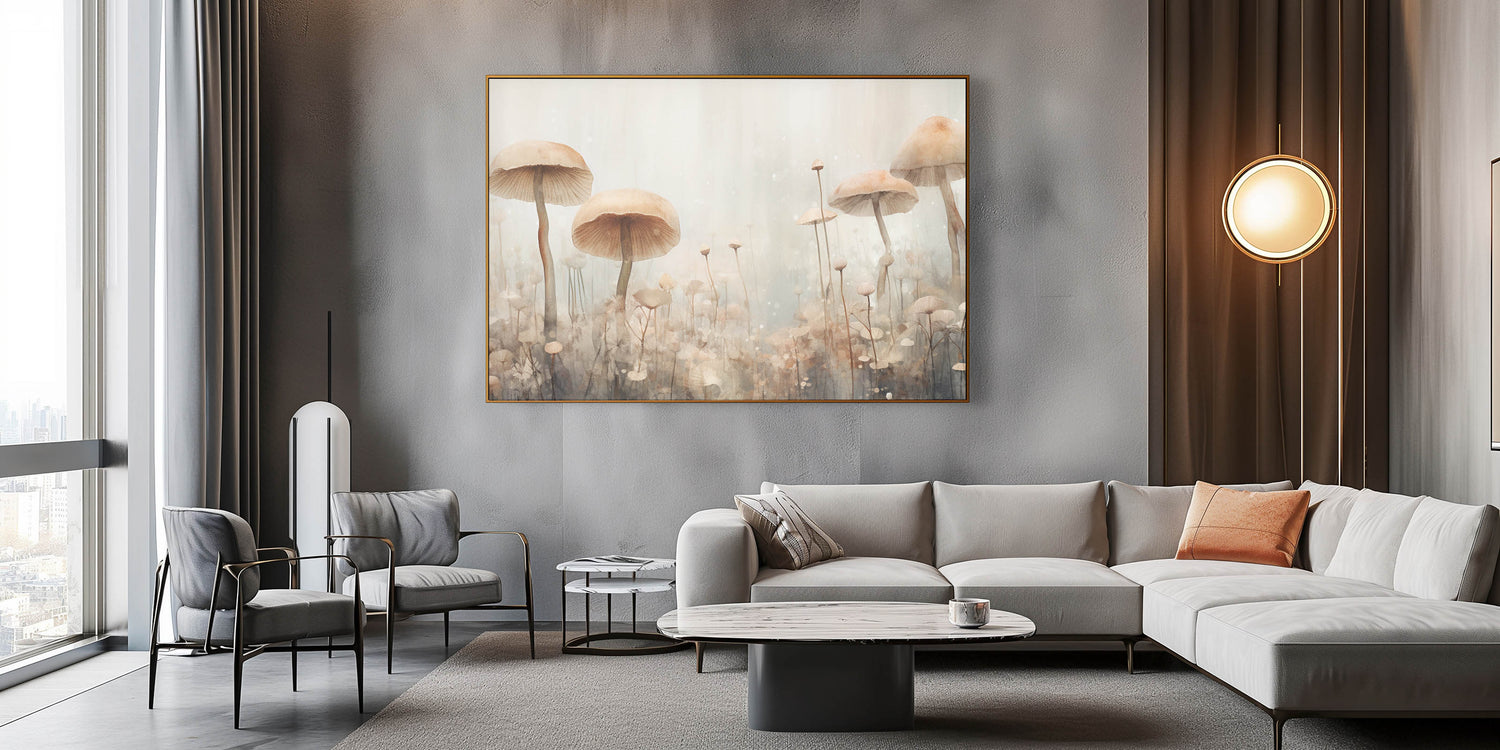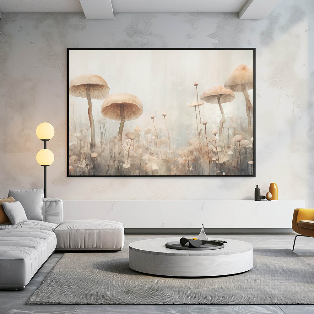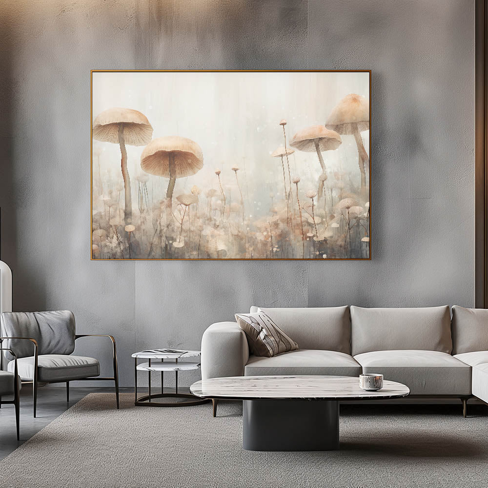Immerse yourself in the whimsical beauty of nature with this floral abstract canvas art depicting an ethereal forest scene of delicate mushrooms. The soft hues and gentle light create a dreamlike atmosphere, evoking a serene walk through a misty woodland. This artwork captures the intricate details of mushrooms rising from the forest floor, adding a magical touch to any space.
