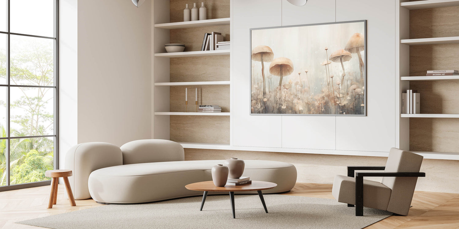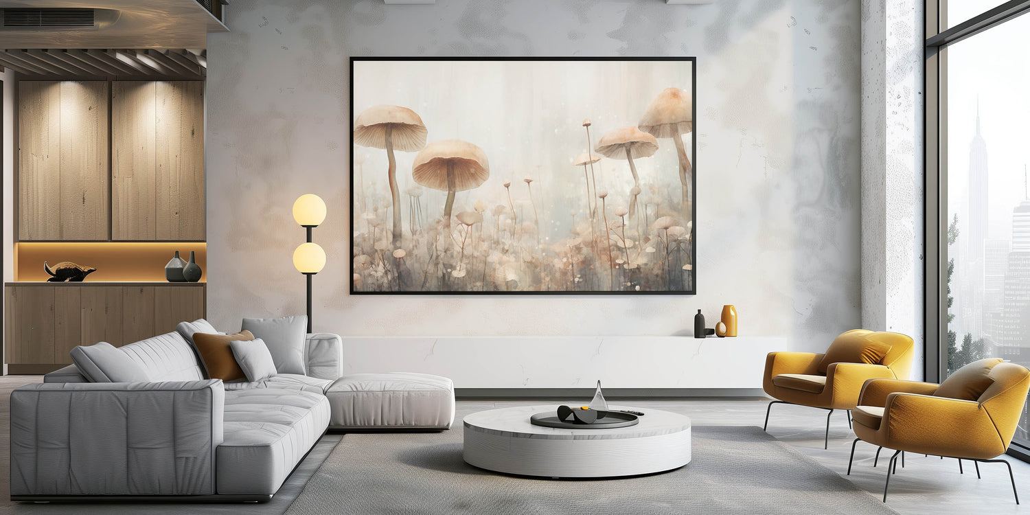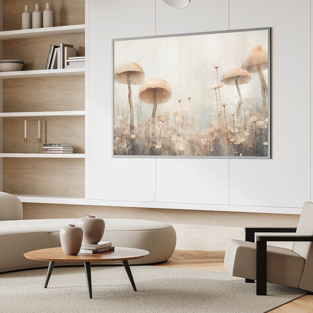 Immerse yourself in the whimsical beauty of nature with this floral abstract canvas art depicting an ethereal forest scene of delicate mushrooms. The soft hues and gentle light create a dreamlike atmosphere, evoking a serene walk through a misty woodland. This artwork captures the intricate details of mushrooms rising from the forest floor, adding a magical touch to any space.