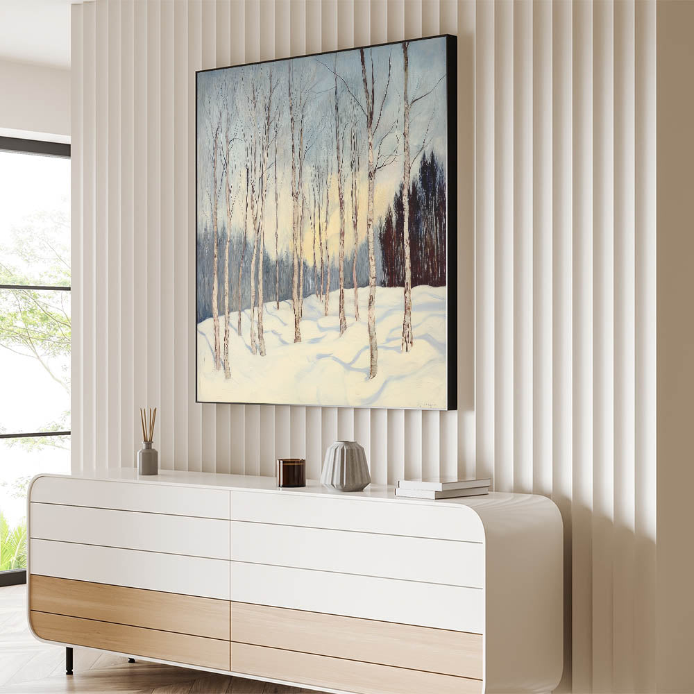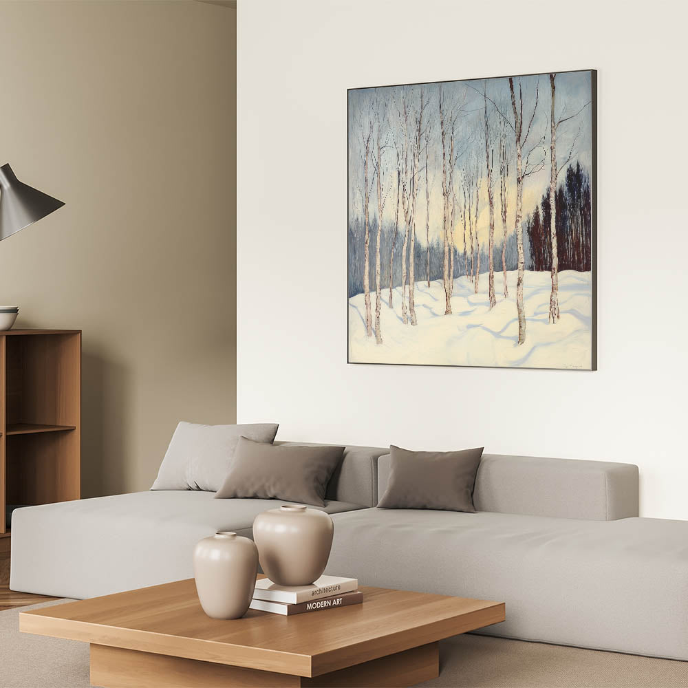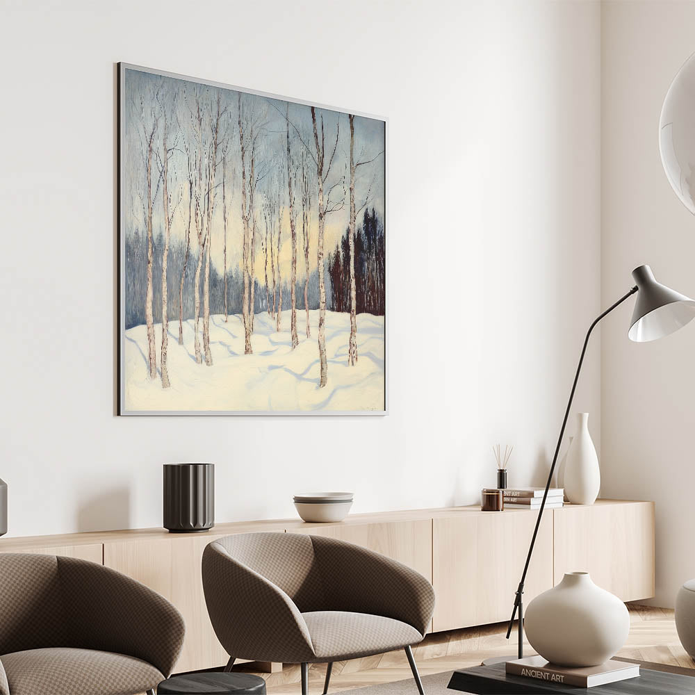 Capture the quiet beauty of winter with the Golden Horizon Abstract Floral Wall Art. This elegant piece features slender birch trees silhouetted against a soft, golden horizon, evoking a tranquil and timeless ambiance. The subtle interplay of light and shadow enhances its abstract aesthetic, making it a versatile addition to modern, Scandinavian, or rustic interiors.
