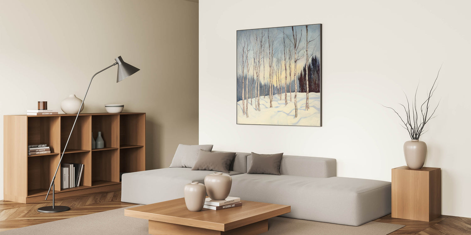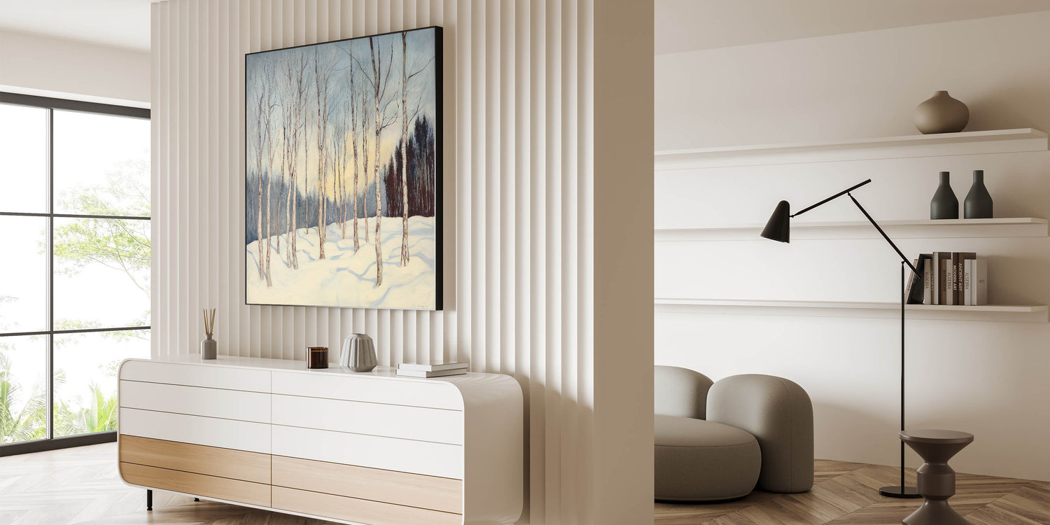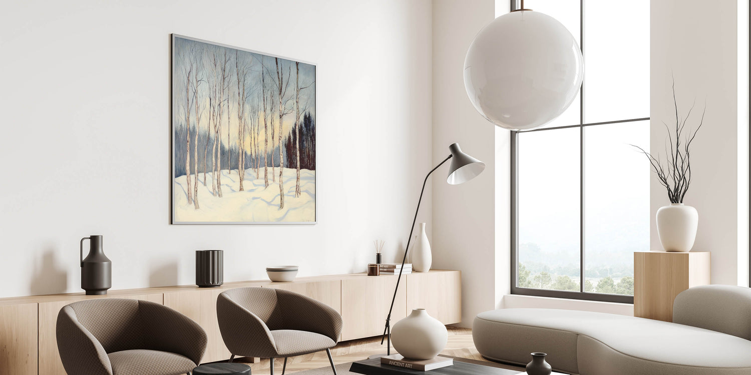 Capture the quiet beauty of winter with the Golden Horizon Abstract Floral Wall Art. This elegant piece features slender birch trees silhouetted against a soft, golden horizon, evoking a tranquil and timeless ambiance. The subtle interplay of light and shadow enhances its abstract aesthetic, making it a versatile addition to modern, Scandinavian, or rustic interiors.