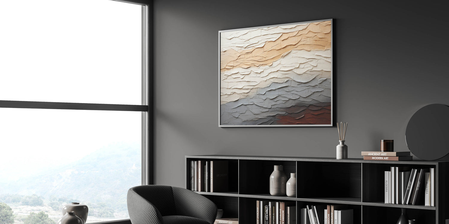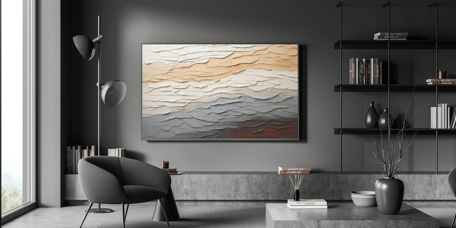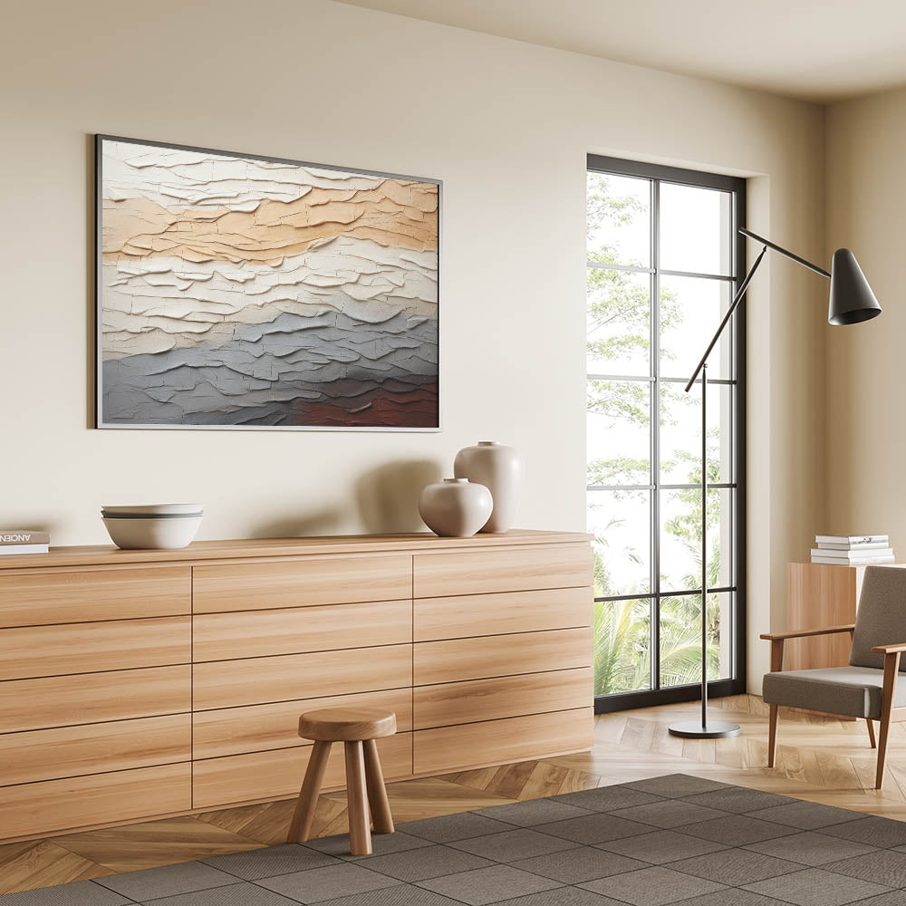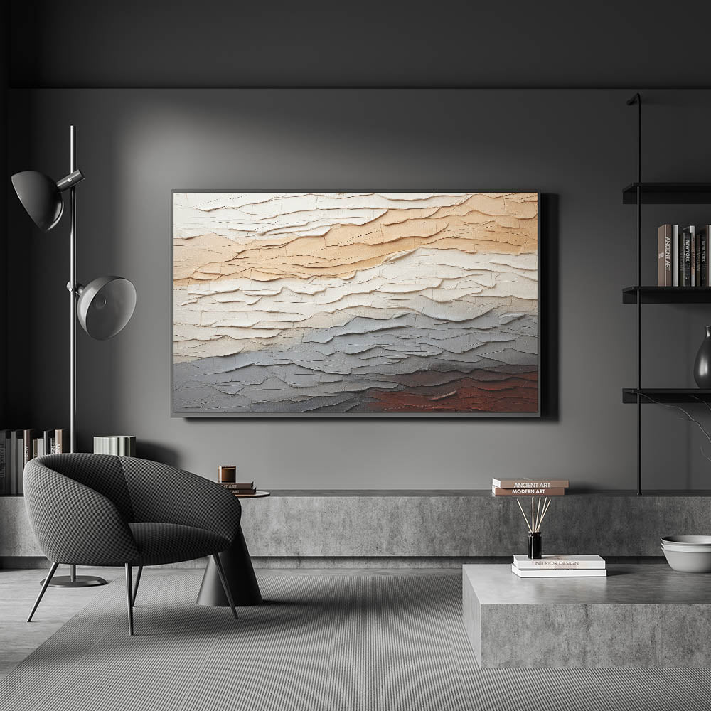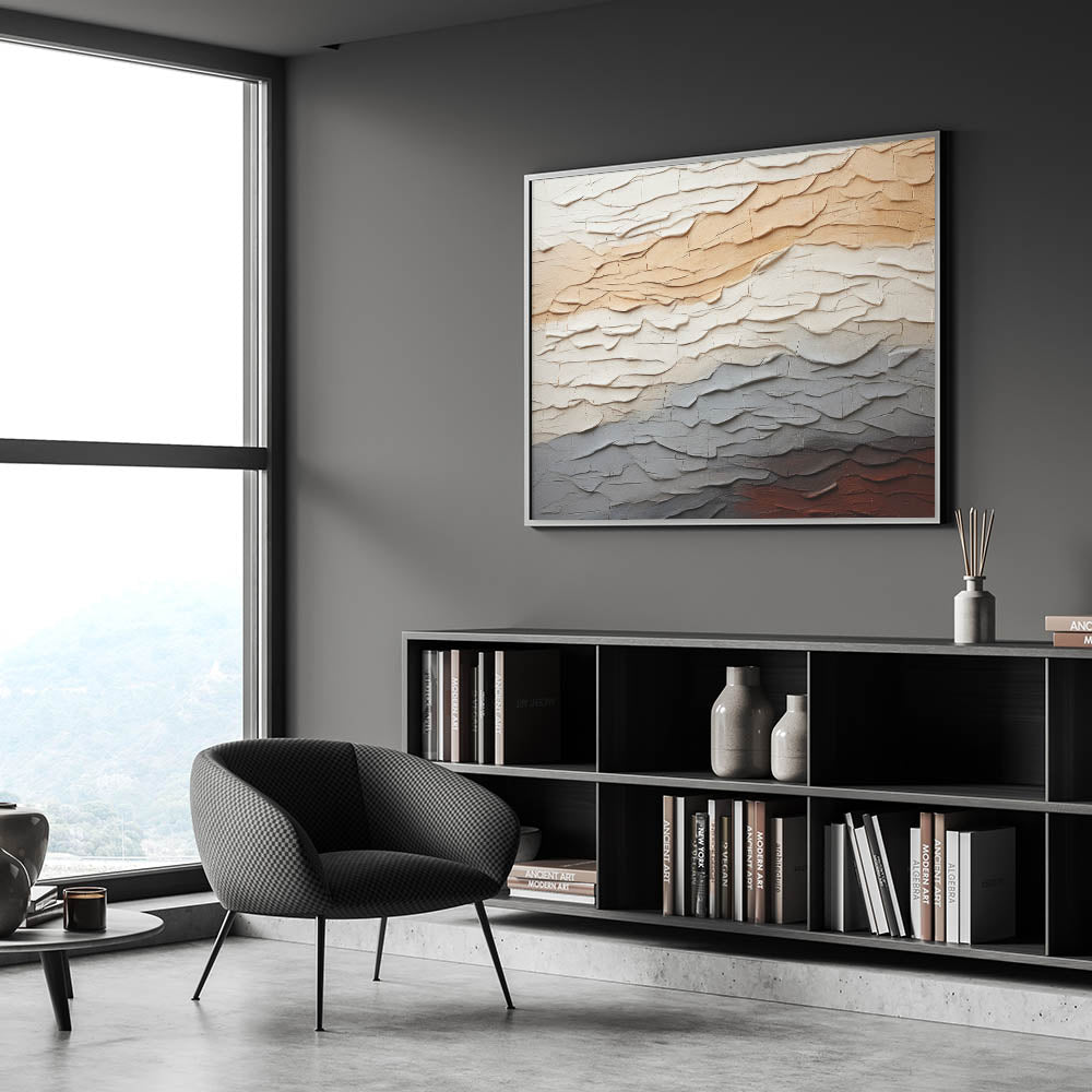 This exquisite piece of abstract art showcases a layered texture design that mimics the natural flow of sand dunes and rock formations. The harmonious blend of soft beige, warm cream, and muted gray tones creates a tranquil and sophisticated look, perfect for enhancing any space. The rich texture adds depth and dimension, making this artwork a captivating focal point for both modern and classic decor styles.