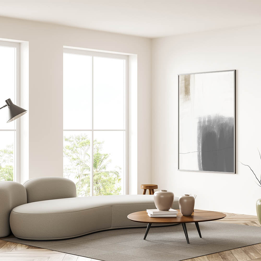 Create a calming atmosphere with this Minimalist Gray and White Abstract Illustration. This piece features soft, layered shades of gray and white, blended seamlessly to form a subtle yet impactful design. Its gentle gradient and minimalistic line detail add depth without overwhelming, making it an ideal addition to modern and minimalist spaces.