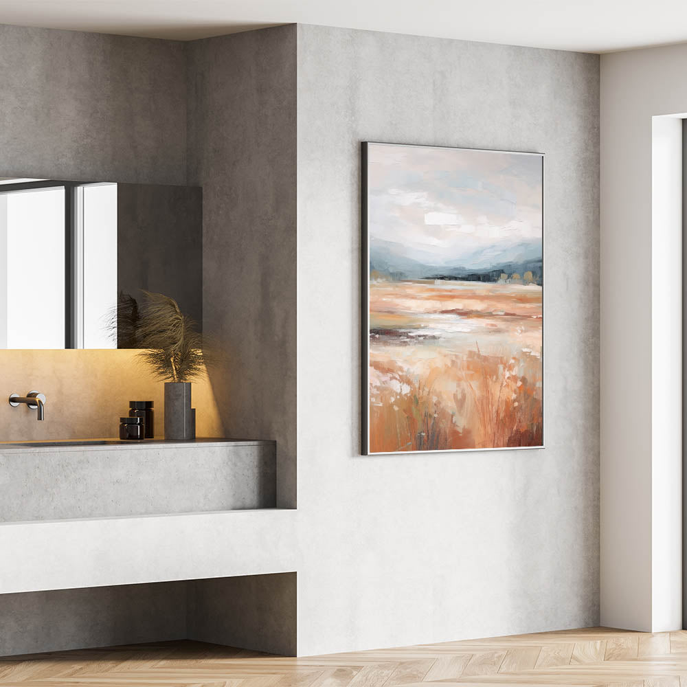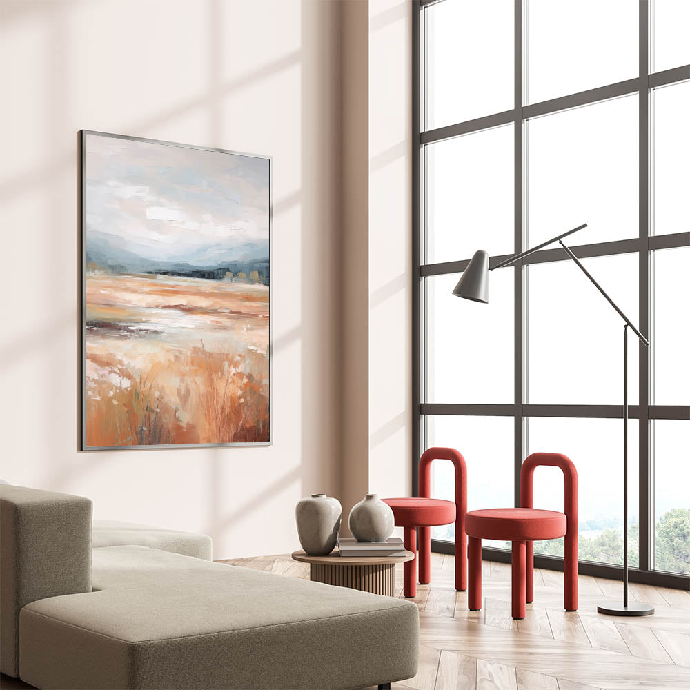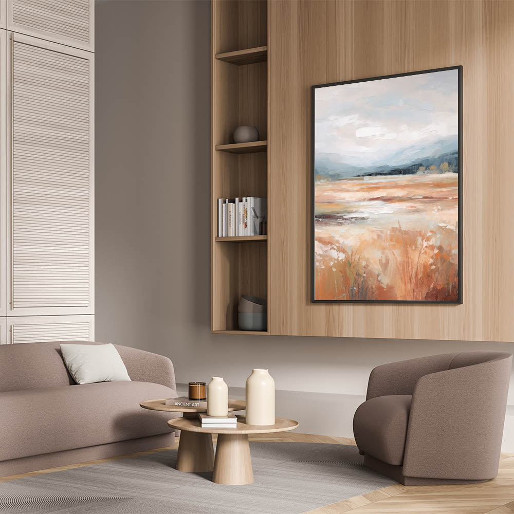 This minimalist wall art captures the beauty of an autumn field with warm, earthy tones, abstractly depicted to evoke a serene and calming atmosphere. The soft brushstrokes blend hues of orange, beige, and muted blue, creating a harmonious balance between nature and abstraction. Ideal for those who appreciate minimalist art style and nature-inspired decor, this piece adds warmth and elegance to any space.