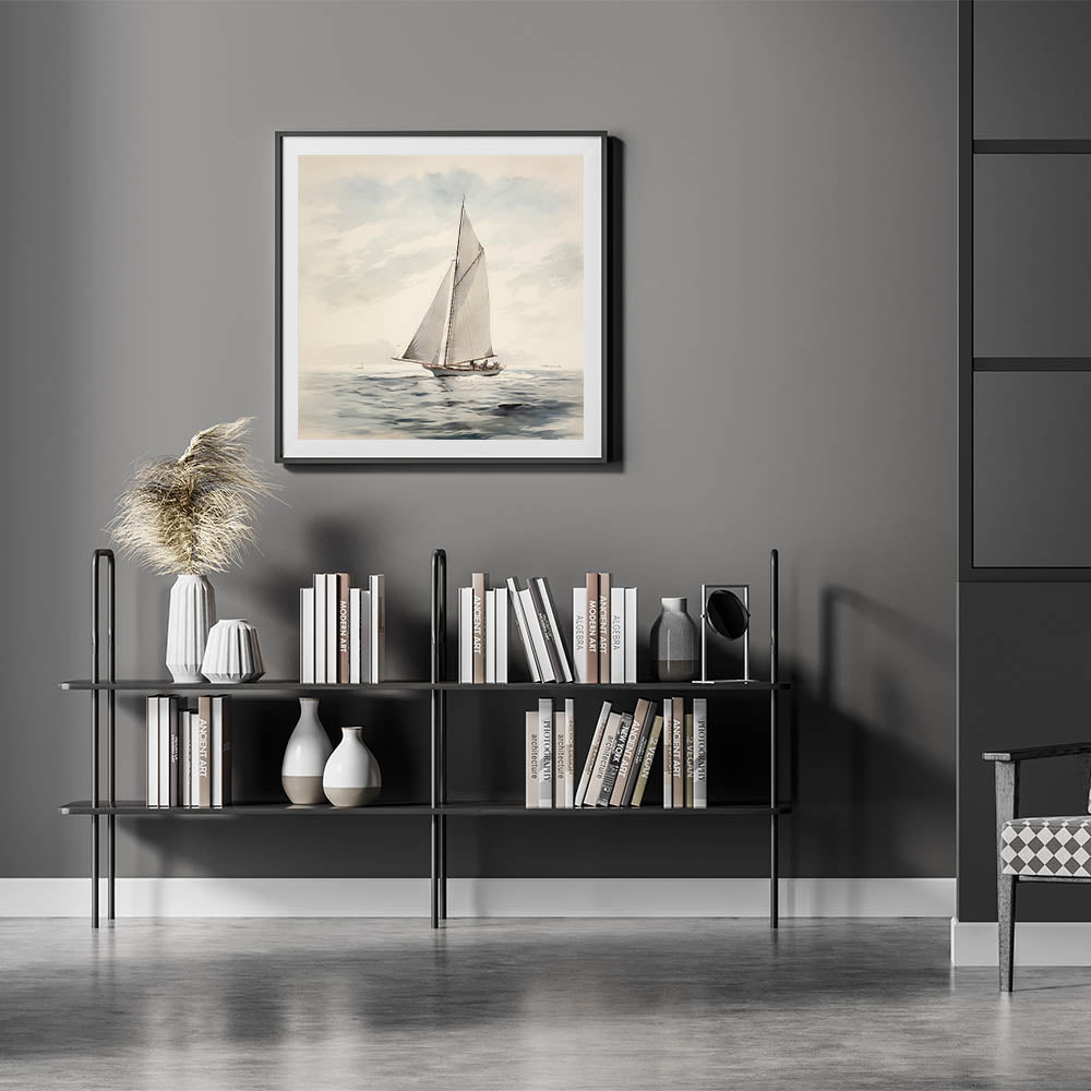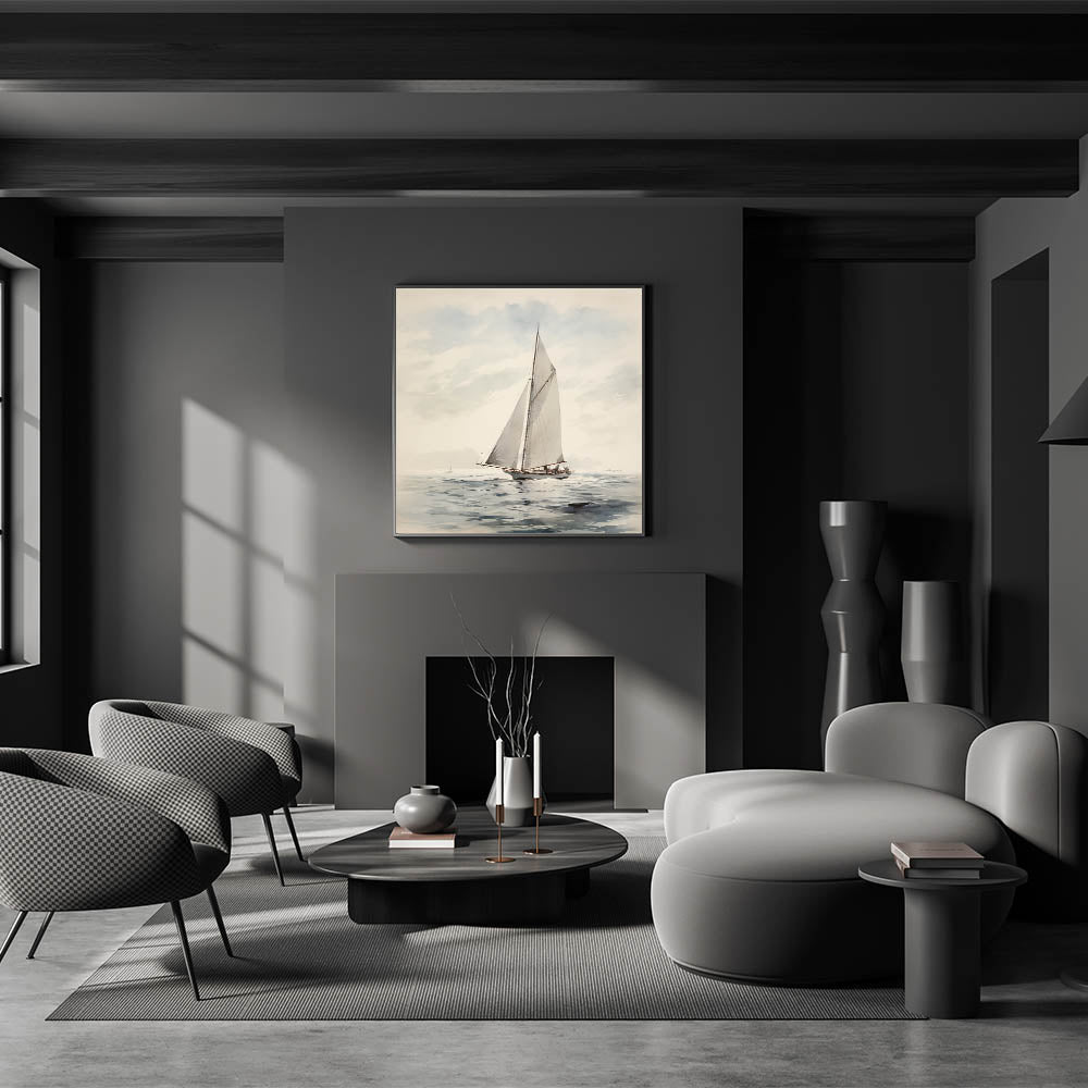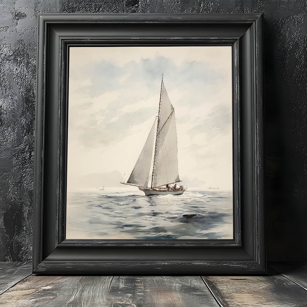 Capture the beauty of the open sea with this minimalist sailboat wall art. Featuring a serene depiction of a sailboat gracefully navigating calm waters, this artwork uses soft tones of blue, white, and beige to create a tranquil atmosphere. Perfect for coastal or nautical-inspired interiors, this piece brings a sense of peace and freedom to any space.